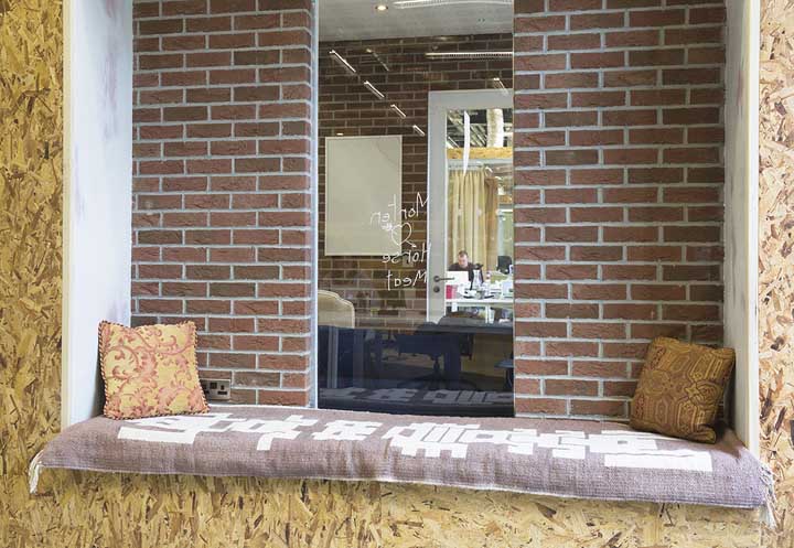 一系列由欧松板(定向结构刨花板)制作的会议室,呈现出全球不同城市的公寓风格,体现出Airbnb的公司属性。每一间会议室分别以源于当地装饰风格的城市来命名。有些会议室的外墙还设置了一些嵌入式座椅,供员工聊天小坐。欧松板制作的会议室另一侧墙面则是透明的玻璃墙,增强了空间的通透感。