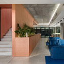 设计没有将公司logo到处张贴应用,而是通过巧妙地隐喻以明亮的色彩、图形和灯具造型来低调演绎。白色和素色混凝土构成极简的空间背景,时尚的家具、灯具和艺术品的装点赋予空间浪漫、优雅、知性的魅力。