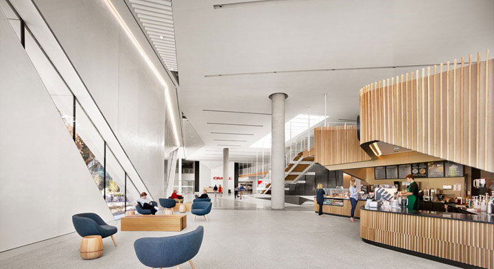 高大开敞的落地窗不仅让日光洒满室内、带来开阔震撼的景观视野,还令建筑与自然和谐交融,令人恍若置身于大自然之中,沐浴着阳光和微风、呼吸着清新的空气,顿觉精神焕发、元气满满,灵感也随之迸发。