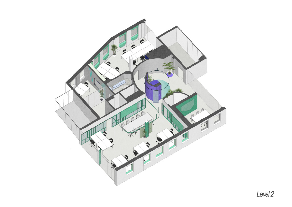 二楼以薄荷色和翡翠色为主调,中央休息区点缀着蓝色;三楼,又再次将出现于一楼的亮黄色与薄荷色和水鸭色结合在一起应用。