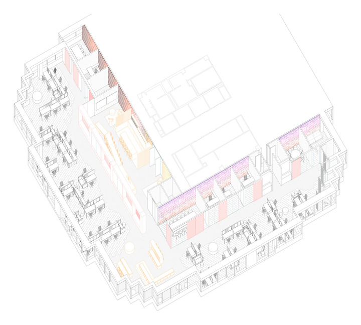 开放办公桌沿建筑周边排列,最大化利用来自东面和南面的自然光照。公共功能空间和私人办公室则布局在建筑核心筒附近。压缩的彩色纸质隔音砖装饰的墙面成为办公室、会议室和休闲区的靓丽背景。