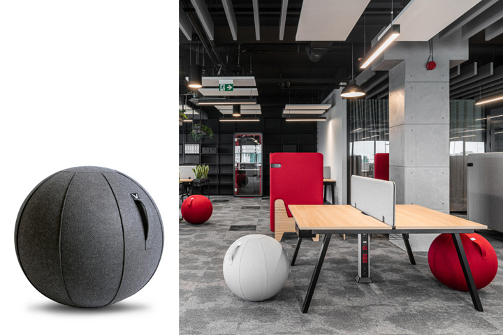 为了达到声学需求,设计师在工作区的天花板上安装了垂直挡板和水平面板这样的吸声元件,并在工位旁边安装了独立的吸声板。同时引入新的工位系统(以黑色金属框架配木制台面板)、以及隔音电话亭、高靠背隔音沙发座、柔软的地毯,以及其它许多有助声学的细节设计。