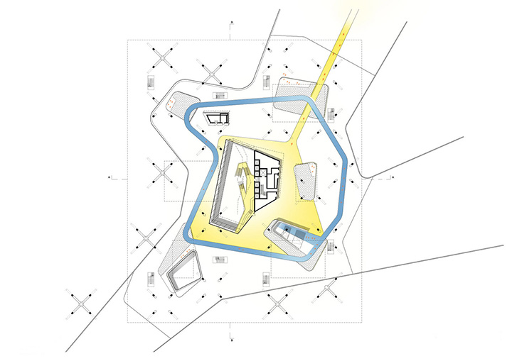 阿迪达斯ARENA的建筑理念建立在以透明、景观和现代办公理念之间相互作用的完美平衡之上,这种现代工作理念是基于跨专业领域的沟通和互动以及对未来发展所做出的前瞻性响应。从而成就了这处非凡的地标建筑,一个包含三个工作楼层的抽象建筑体量悬浮于人造景观之上。如山丘斜坡般的基础构造形成建筑的入口,其中一部分是公众入口,并通向一个可举办各种活动的巨大而明亮的中庭。