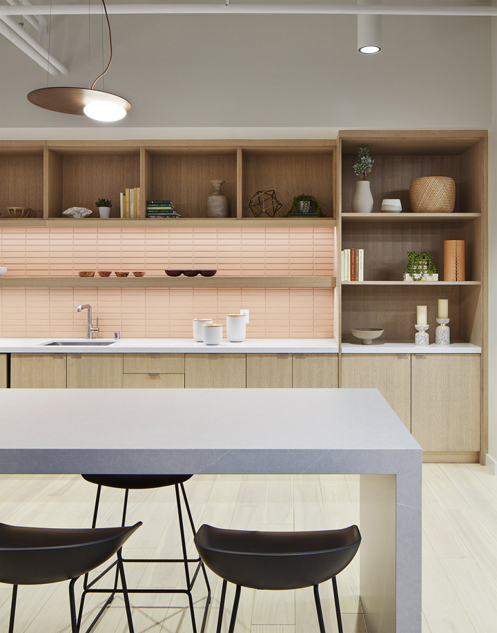 在入口区设有一间大型会议室。Vanco的标志醒目的位于紫色的墙面上,将来宾引导进主会议室。会议室设有可擦写墙面和舒适的入墙软体座椅,以尽可能多的容纳与会者。会议室外设置了一处厨房/休闲区将会议室与开放工作区有机相连。这里的咖啡吧设计有着酒店的质感,定制的木桌、精美的面砖,带来轻盈飘逸的感觉,与周边环绕的魅紫墙面形成鲜明的对比。