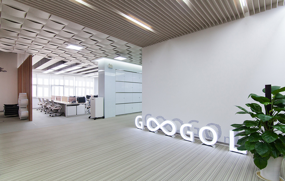 进入接待门厅,半透明的树脂墙面,厅左侧的做旧实木复合地板、顶上的吸音板线条、长短各异的灯管,所有的这一切把视觉中心引导到了干净洁白的公司的logo主背景墙。这一切体现固高企业的n的x次方的企业理念:n就是你---一个优秀的人才,白色的背景墙---x次方,如无边无际的天空一样体现固高作为一个极富想象力的平台。