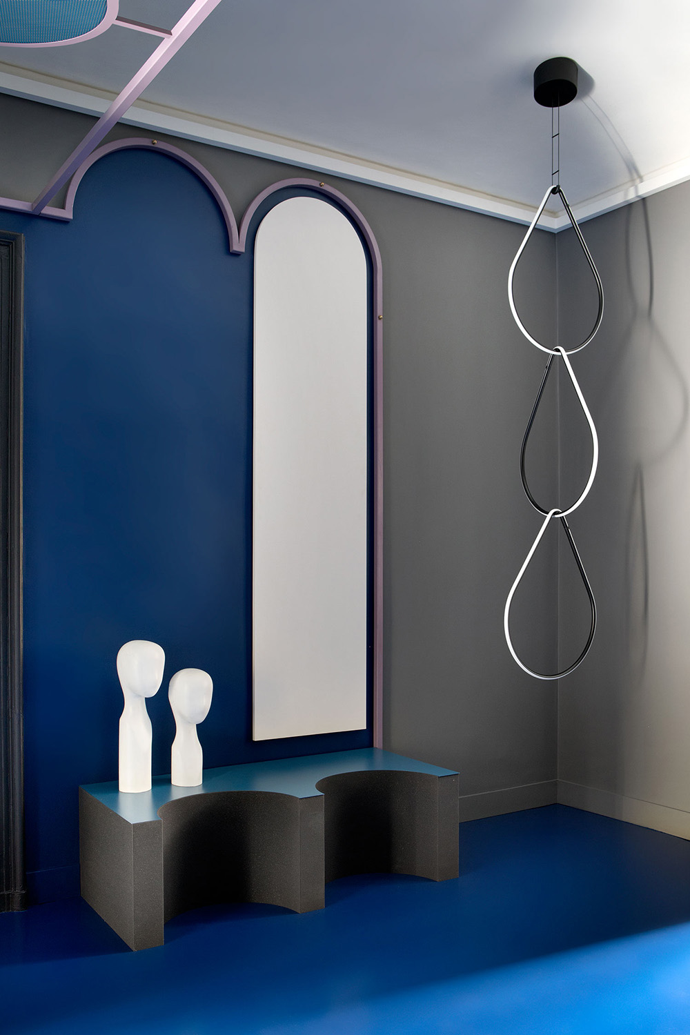 “蓝色几乎覆盖了整个空间和家具,让一切看起来既不真实也很反常。这种单色设计直接与形式、物质、光线和空间对话,构建了一个可塑的虚幻的情境。它创造了一个几乎是静态的、形而上学的城市环境:一个空旷的广场;一个古老的痕迹;一个在观者眼中变得梦幻般的建筑场景。”建筑师解释说。