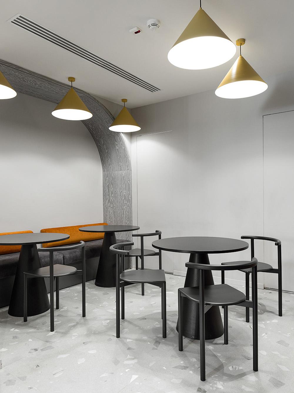 如此用尽心思的设计旨在传达Samolet的现代精神及其与时俱进的愿望,以时尚的语言与新世代的员工进行交流和沟通。所以就有了夸张的简约几何形式与明亮企业色相结合的孟菲斯风格的应用和表达。此外,公司品牌特有的拉长椭圆形元素也成为本案个性化的装饰要素,结合孟菲斯风呈现于室内各处,比如与灯具结合的金属吊顶、独特的接待台构造、墙面上的装饰等等。