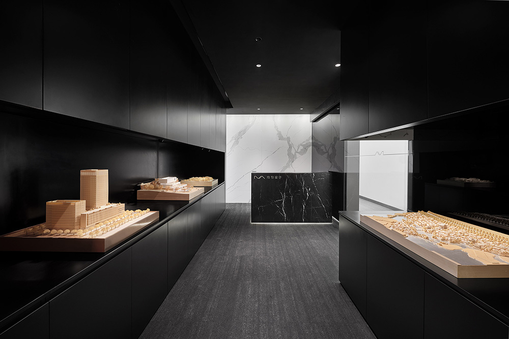 写字楼门厅至电梯厅大面积使用白色石材,明亮大方。而设计通过黑色盒子限定入口,既暗示到访者已进入公司,也是保护办公私密性的玄关。黑色盒子是一个小型展陈空间,可收纳与展示重要项目模型,通过光环境的对比与控制,黑色盒子里展示的模型犹如一件件艺术品,使访客能够在第一时间感知团队的设计追求和精良品质。