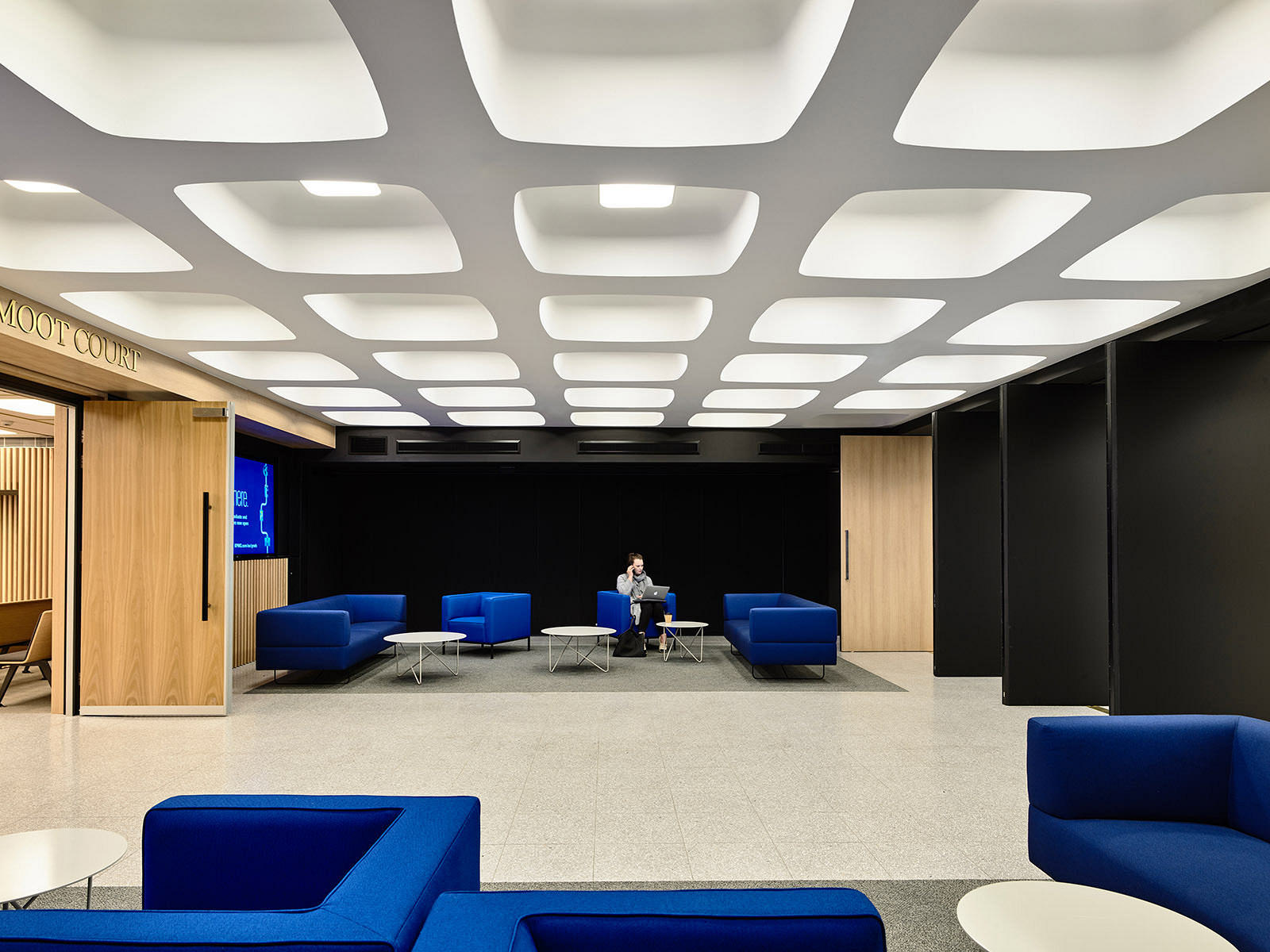 本案设计强调了学生福祉和尖端教学设施的重要性。学生福祉是本次设计的首要考虑因素,室内所有空间都与建筑周边外窗建立视觉上的连接;并最大化的让自然光洒近室内深处;沿着中央轴线设置了一系列连续的绿植装饰隔断;而建筑原始的华夫格天花板结构在灯光的映照下不仅展现出历史建筑自身无与伦比的美感,也增强了空间的开敞感和体量感。在设计团队的精彩诠释下,最终成就了一个展现法学院前沿思想理念的精美教学空间。