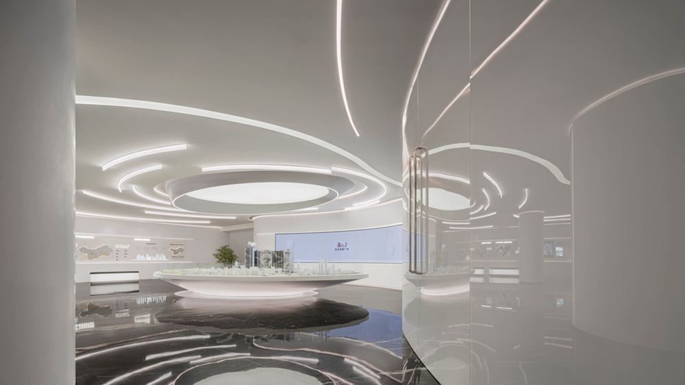 这种体验从看见建筑、进入空间的一刹那即开始,流光的建筑外观,大堂和接待台造型的艺术流线,天花灯带如星轨般延伸向远方,半漂浮态的沙盘区域,一切的空间语言带给人们强烈的震撼,带着欣赏的眼光开始这一程空间之旅。