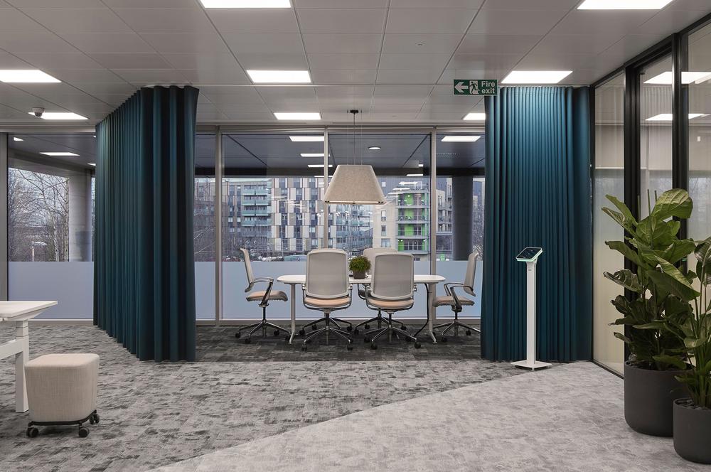 当大型团队聚集在一起时,尤其是在开放敏捷的工作环境中,声学应用在工作场所的成功设计中发挥着巨大的作用。设计团队根据每个区域的用途巧妙地使用声学产品。比如在聚会大厅中,顶面安装了悬挂式声学板以创造最佳用户体验;在工位比较集中的地方,近旁的墙体装饰以声学窗帘;休闲区和协作区的顶面装饰以声学挡板、并配置高靠背软体家具小隔间;整个项目都选用安装了软垫的隔音地毯,并通过色彩和图形界定不同的功能区域;用于私人电话的静音舱;服务于团队协作和小型会议的大型车厢座等。