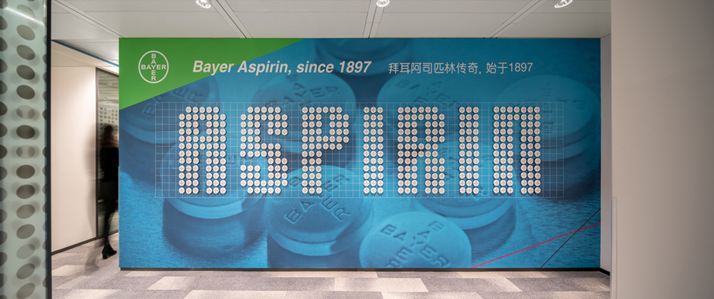 办公室设计的一个关键组成部分是拜耳品牌。拜耳拥有悠久的历史,丰富的创新成果及许多值得庆祝的时刻。在整个办公空间内以及展示产品和创新成果的多个位置,均大量运用了品牌专属色。根据具体环境定制的图形装置有助于访客更好地了解这些成就。