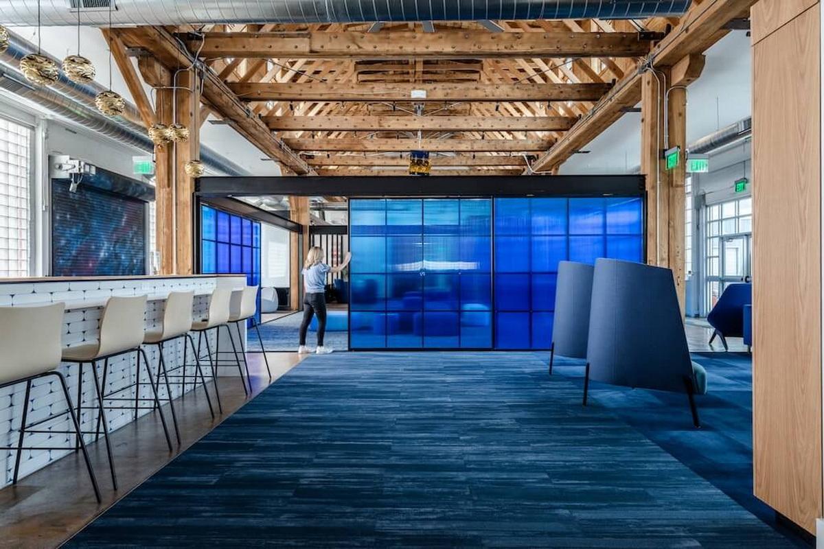 · 文化基因:可移动旋转的蓝色聚碳酸酯障子屏风系统,既是对企业日本基因的致敬,也创造了可自由变换的复合型功能空间;