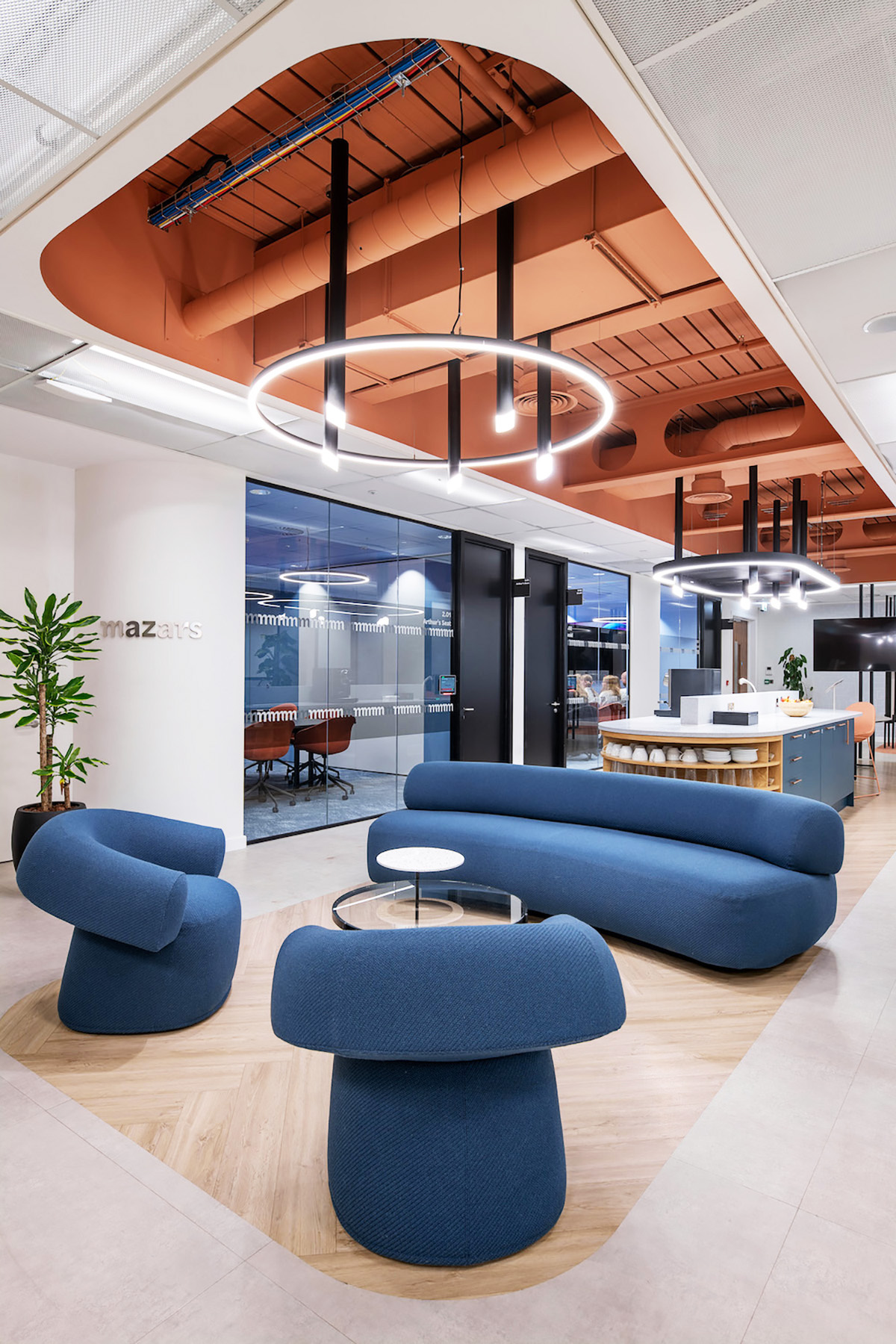 设计师采用与玛泽品牌调性一致的大胆用色,在保持专业形象的同时注入灵动与启发——这种色彩方案延续了玛泽全球办公室的设计基因,既强化了属地特色又保持了国际品牌认同。