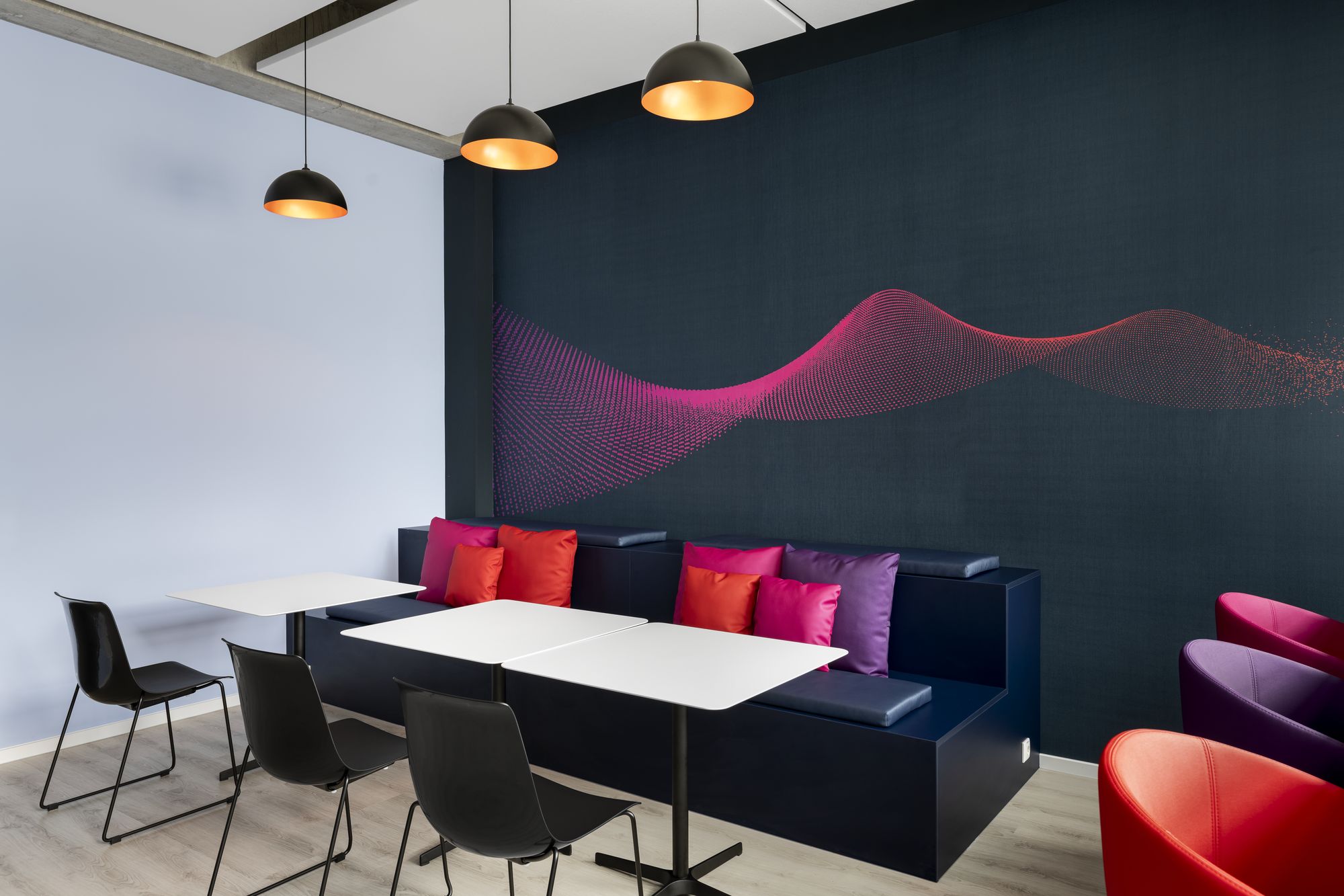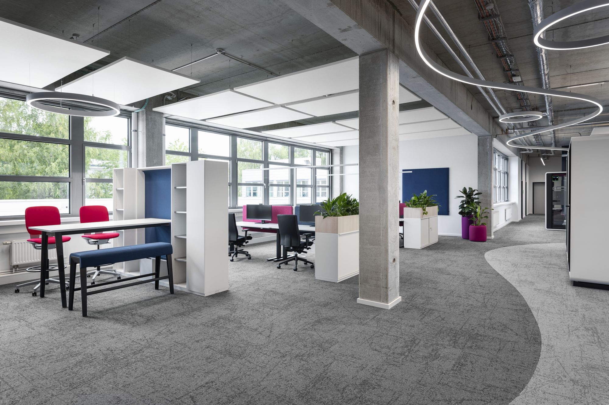 该设计通过精心平衡开放式办公区、专属项目空间、专注工作区及非正式协作点,打造多元复合的工作场景。精选的家具解决方案将符合人体工学的工位、模块化休闲座椅、灵活会议区及声学元素有机结合,构筑出分区明确且舒适度极高的工作环境。材料选择、色彩搭配与空间布局均经过针对性设计,既强化空间导向性与企业标识度,又有效传递工作场所文化体验。