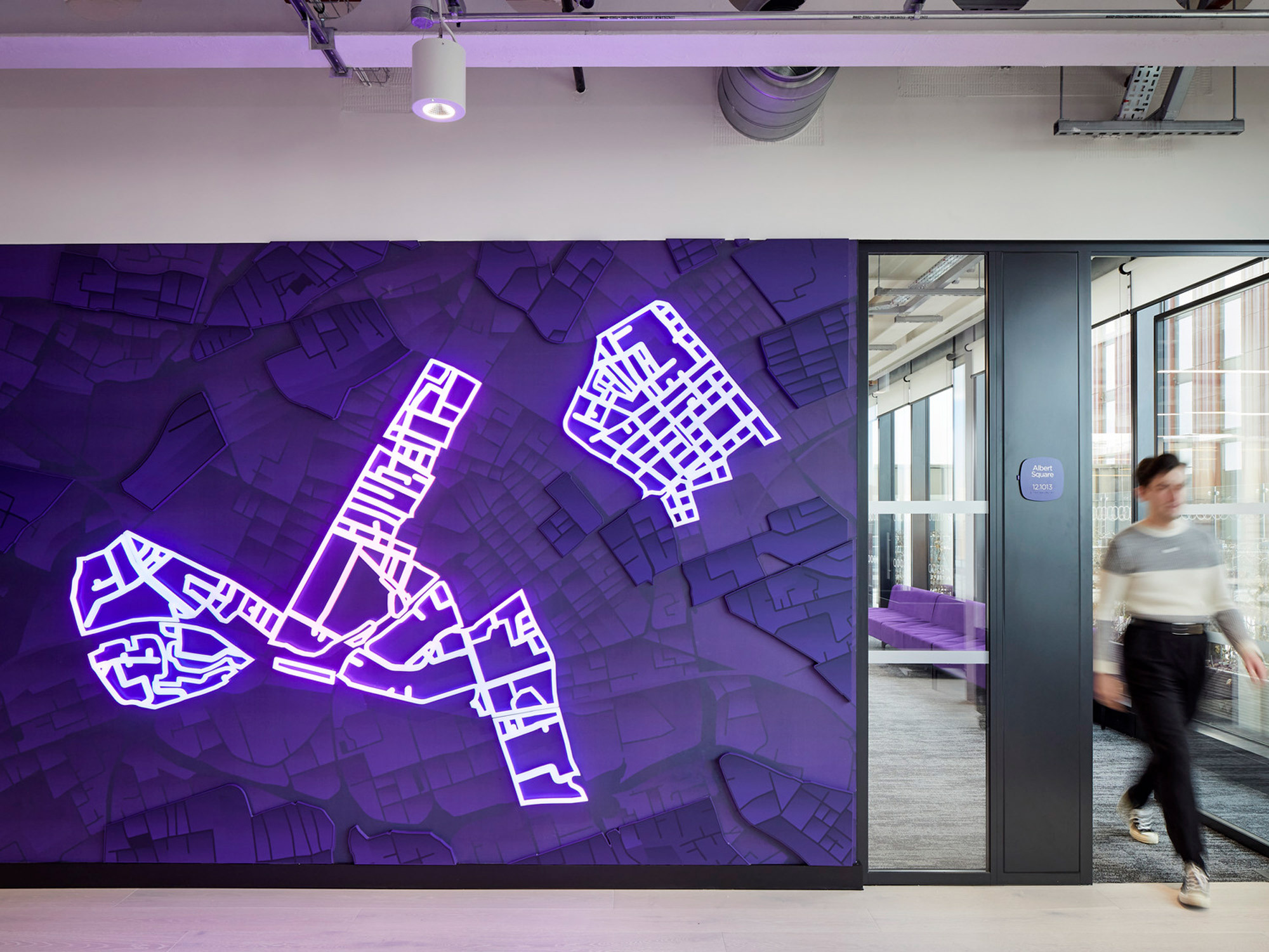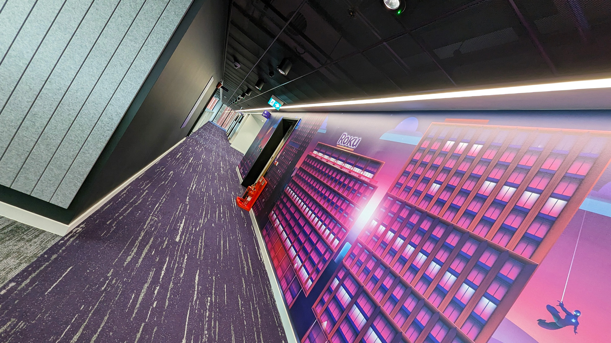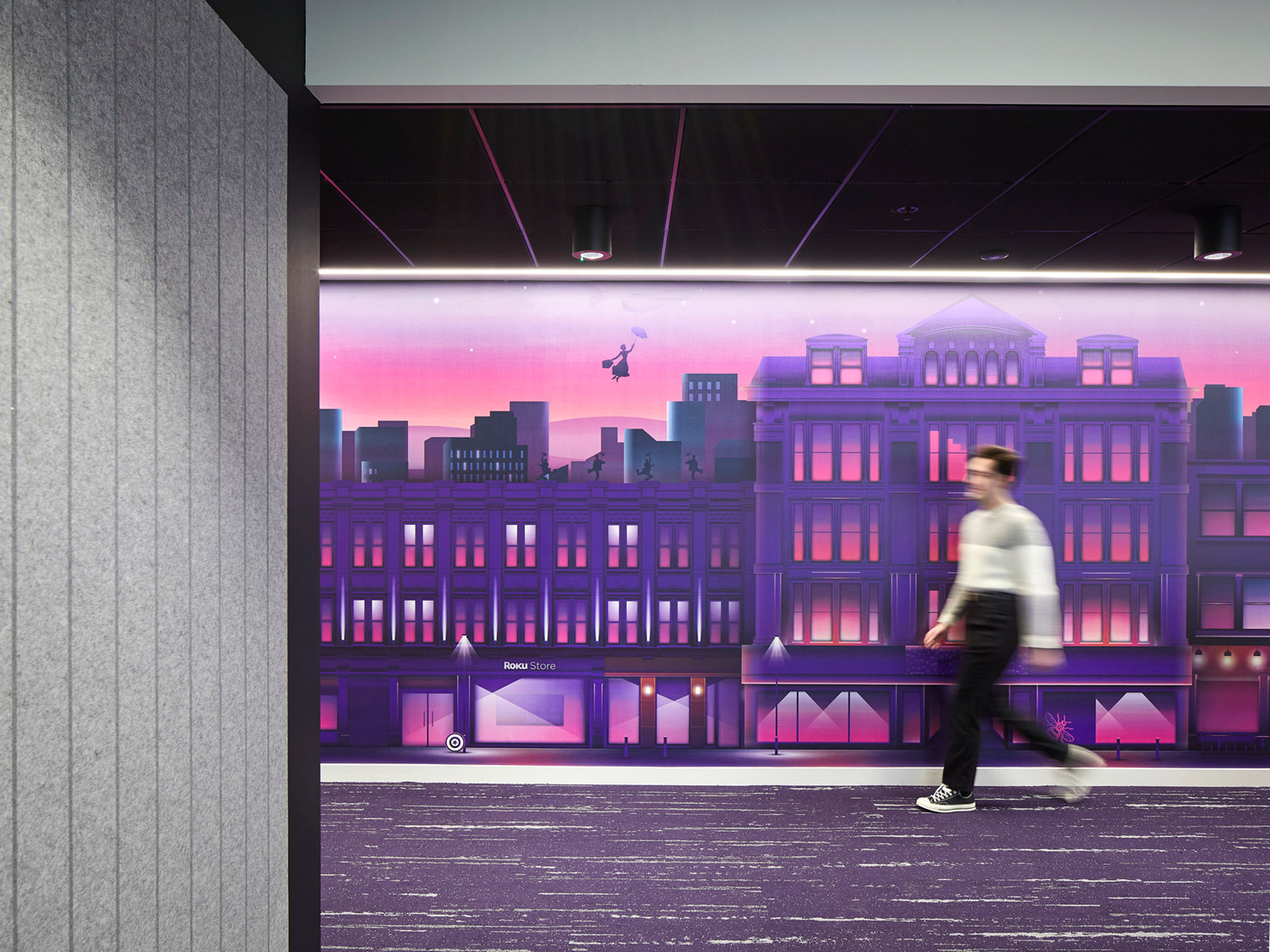 作为全球统一品牌标识的Roku,其专属紫色与曼城街区历史、娱乐主题交融,通过沉浸式图文呈现于空间各处,甚至融入地面及会议室命名体系。充裕的灵活活动空间既可举办全球全员大会,也能承办外部科技盛会。专属的面试房间同步展示Roku产品魅力,让求职者提前体验未来工作场景。