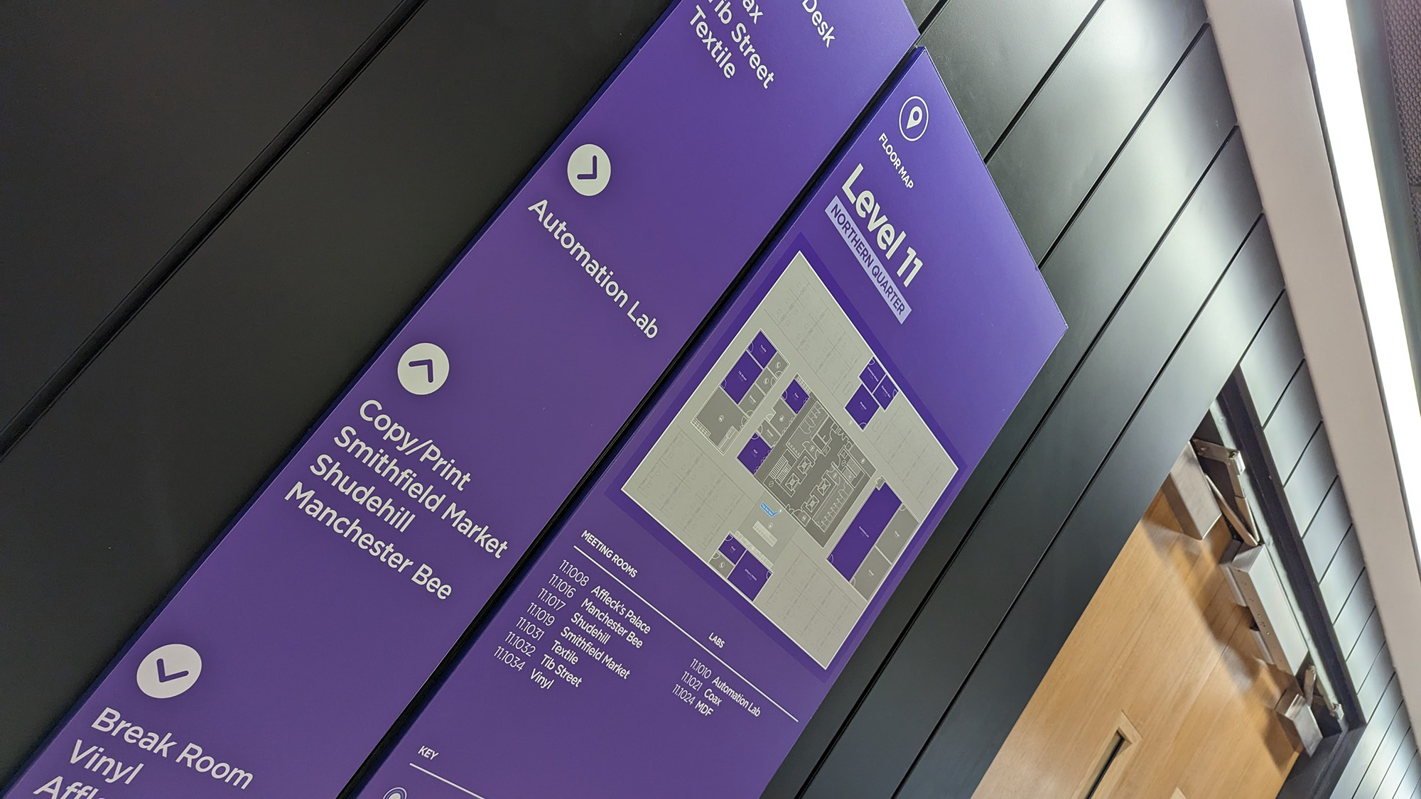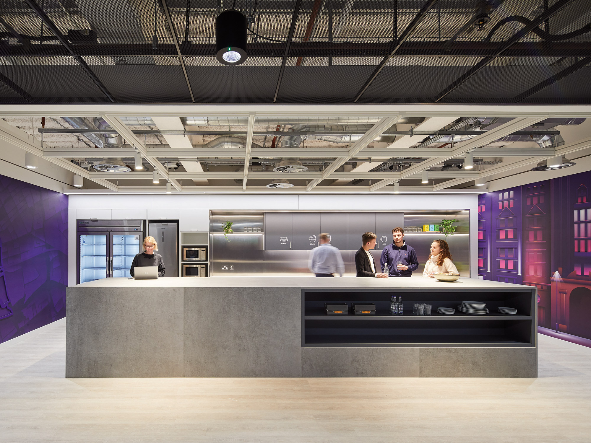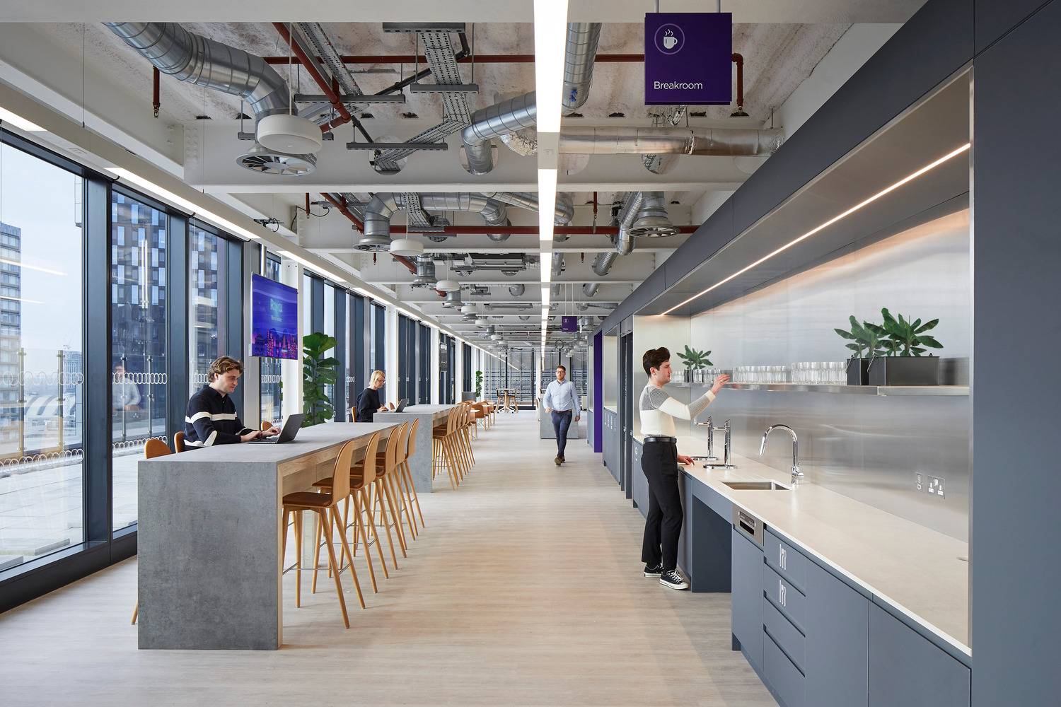 作为全球统一品牌标识的Roku,其专属紫色与曼城街区历史、娱乐主题交融,通过沉浸式图文呈现于空间各处,甚至融入地面及会议室命名体系。充裕的灵活活动空间既可举办全球全员大会,也能承办外部科技盛会。专属的面试房间同步展示Roku产品魅力,让求职者提前体验未来工作场景。