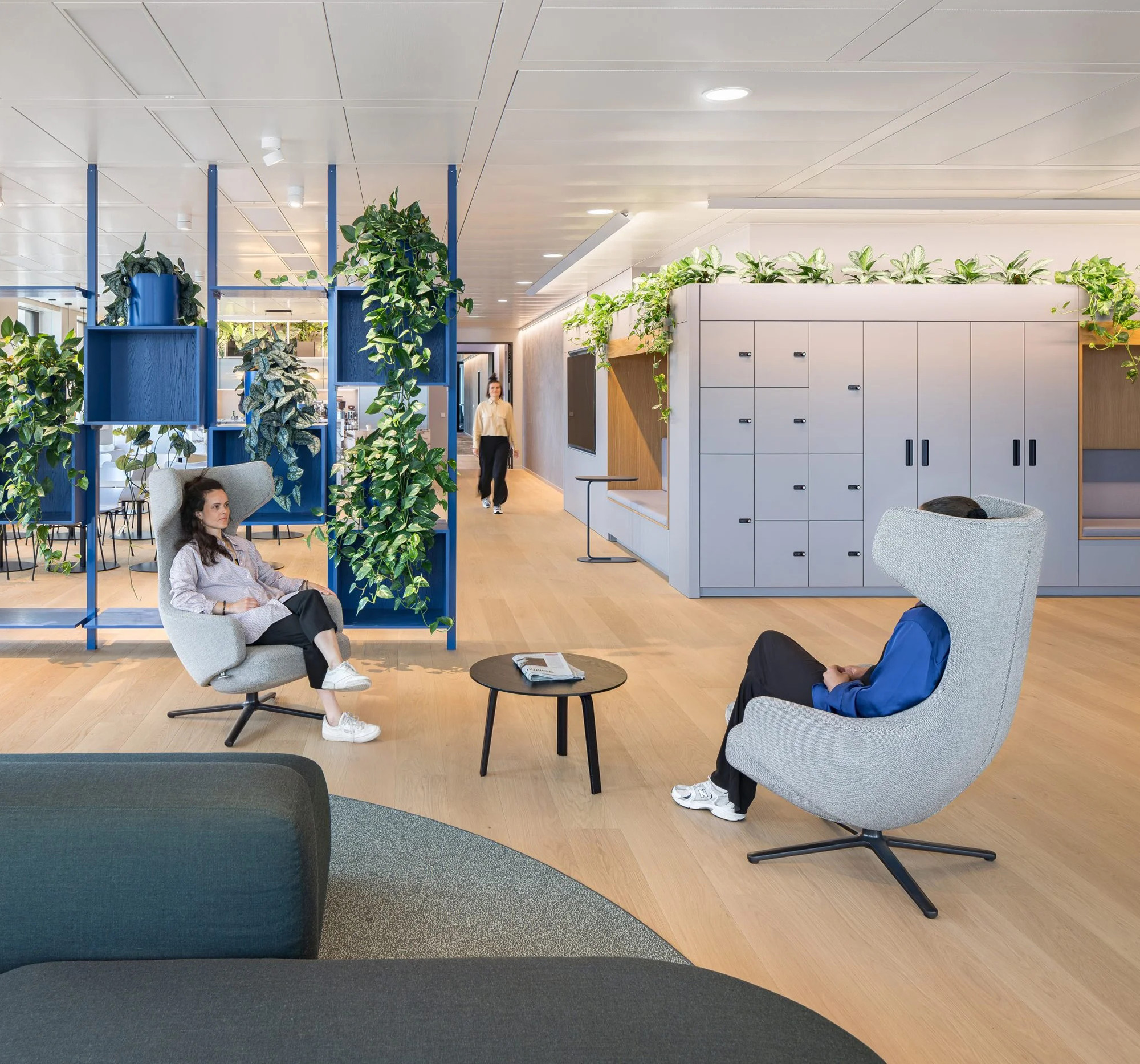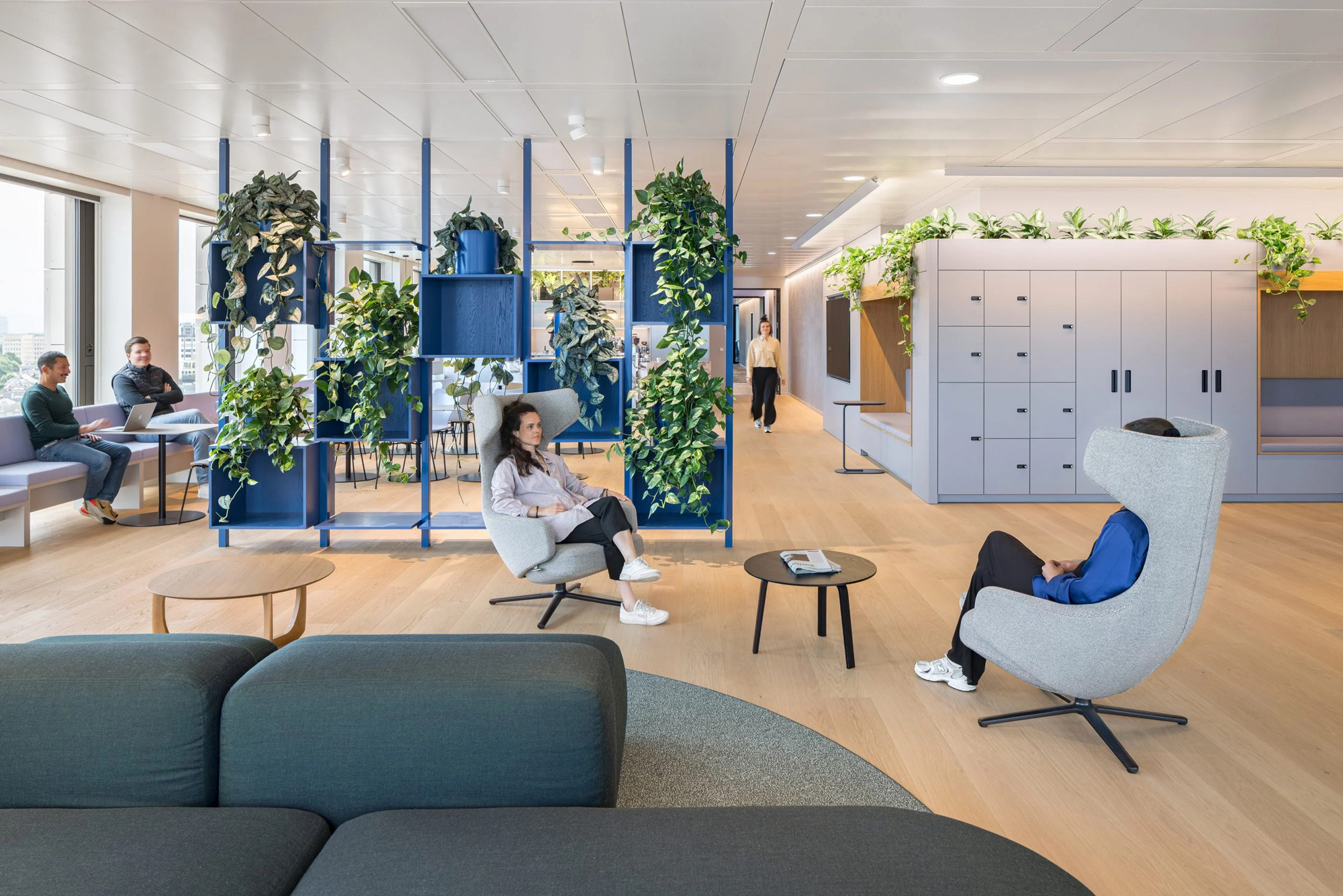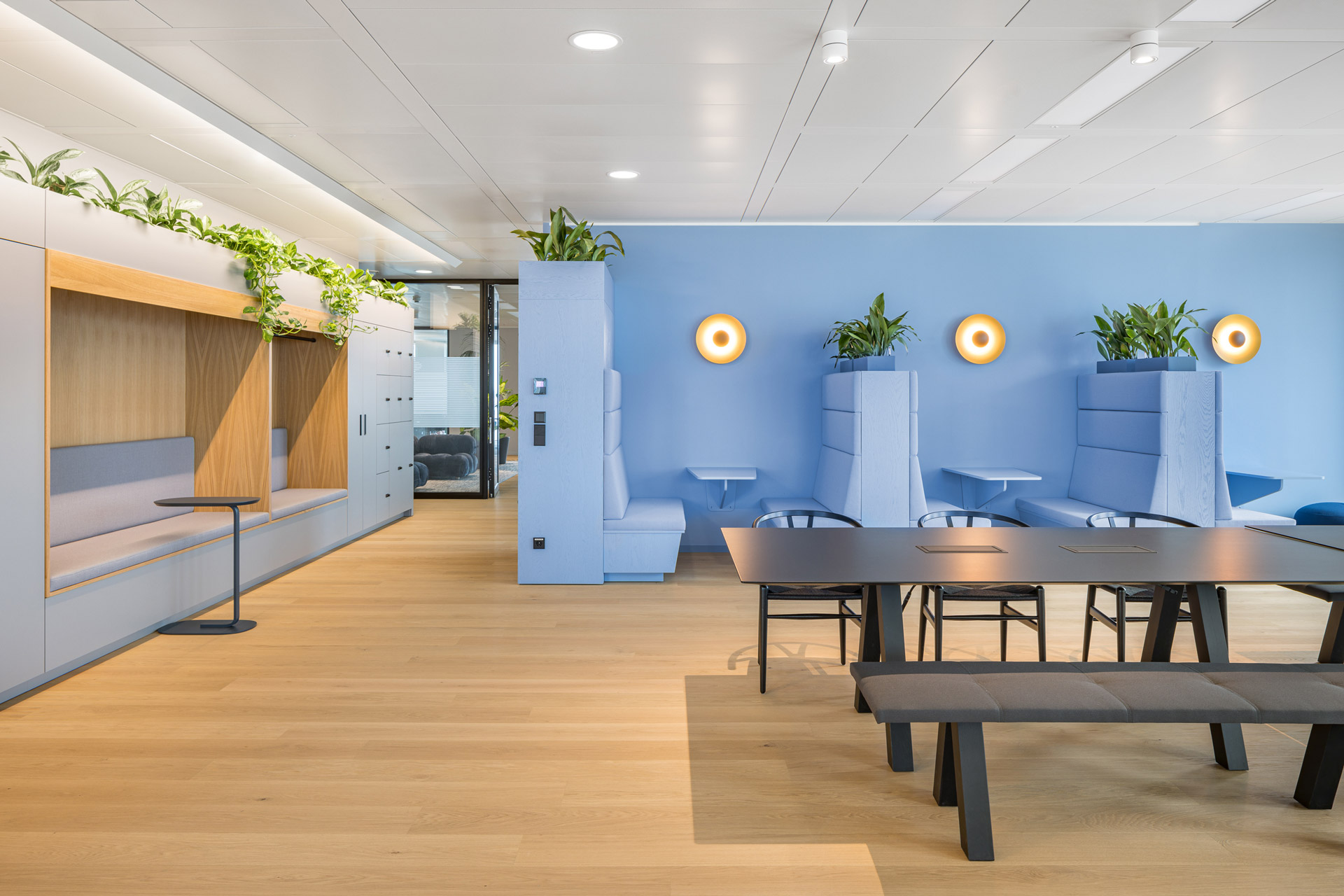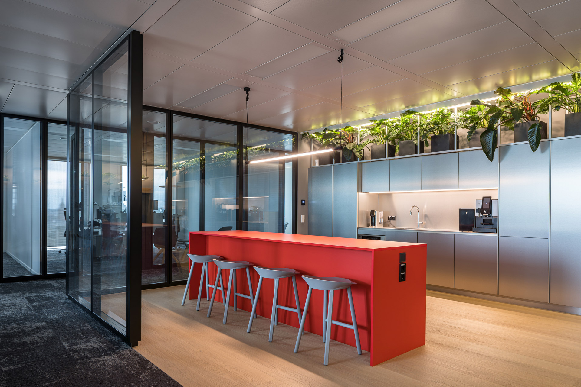 位于Opernturm大厦的Ardian新办公室,Kinzo设计团队通过融合木材、石材等天然材料与遍布空间的百余处葱茏绿植,构建出一个和谐而宁静的整体环境。空间中的色彩搭配尤为精妙:绿植的自然青翠与蓝色调家具的优雅呼应,共同营造出充满自然气息的美学氛围。而在红色调厨房区域,绿植的引入则形成鲜明对比,不仅平衡了视觉冲击,更通过色彩的碰撞强化了空间的张力,打造出令人印象深刻的视觉效果和空间景致。