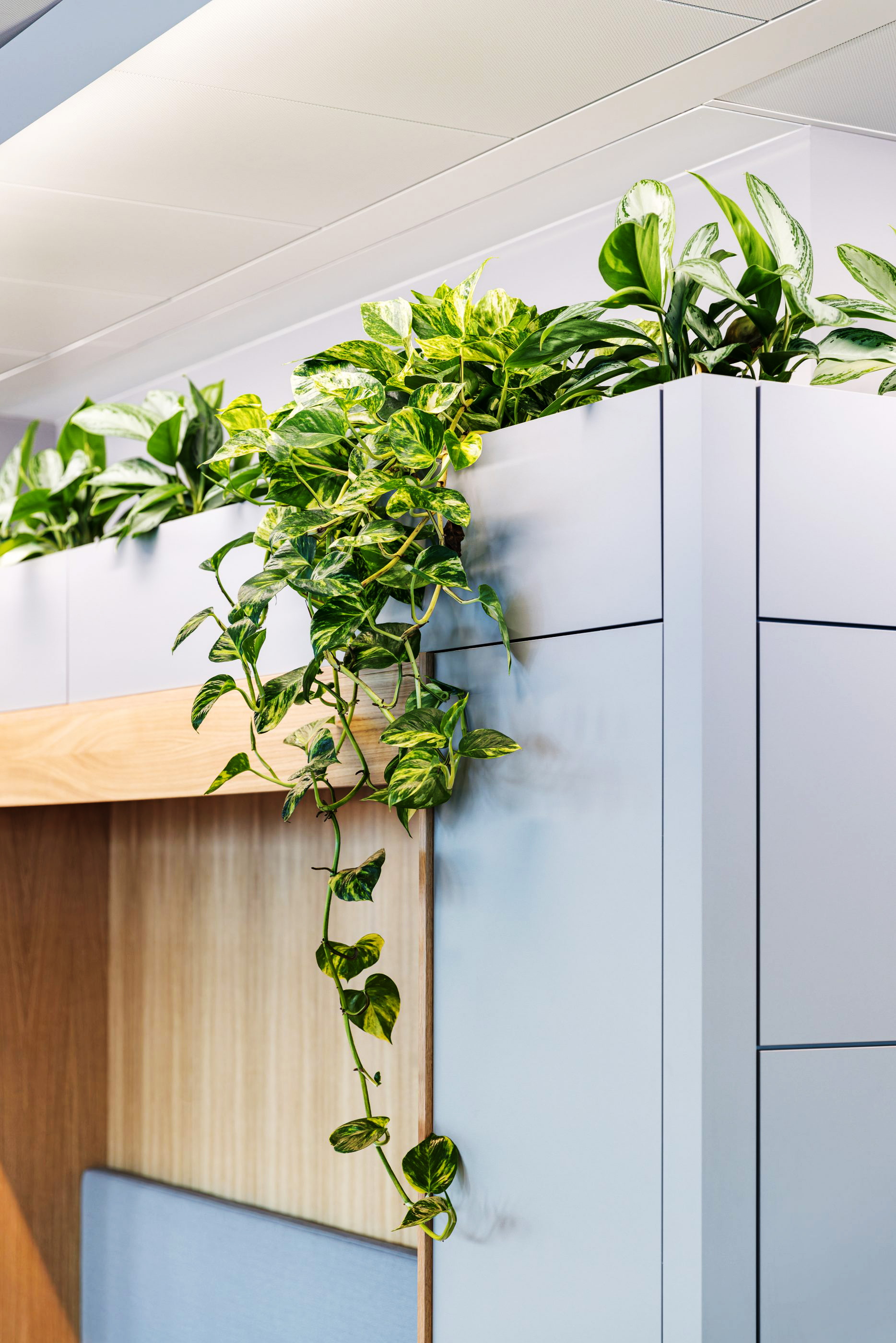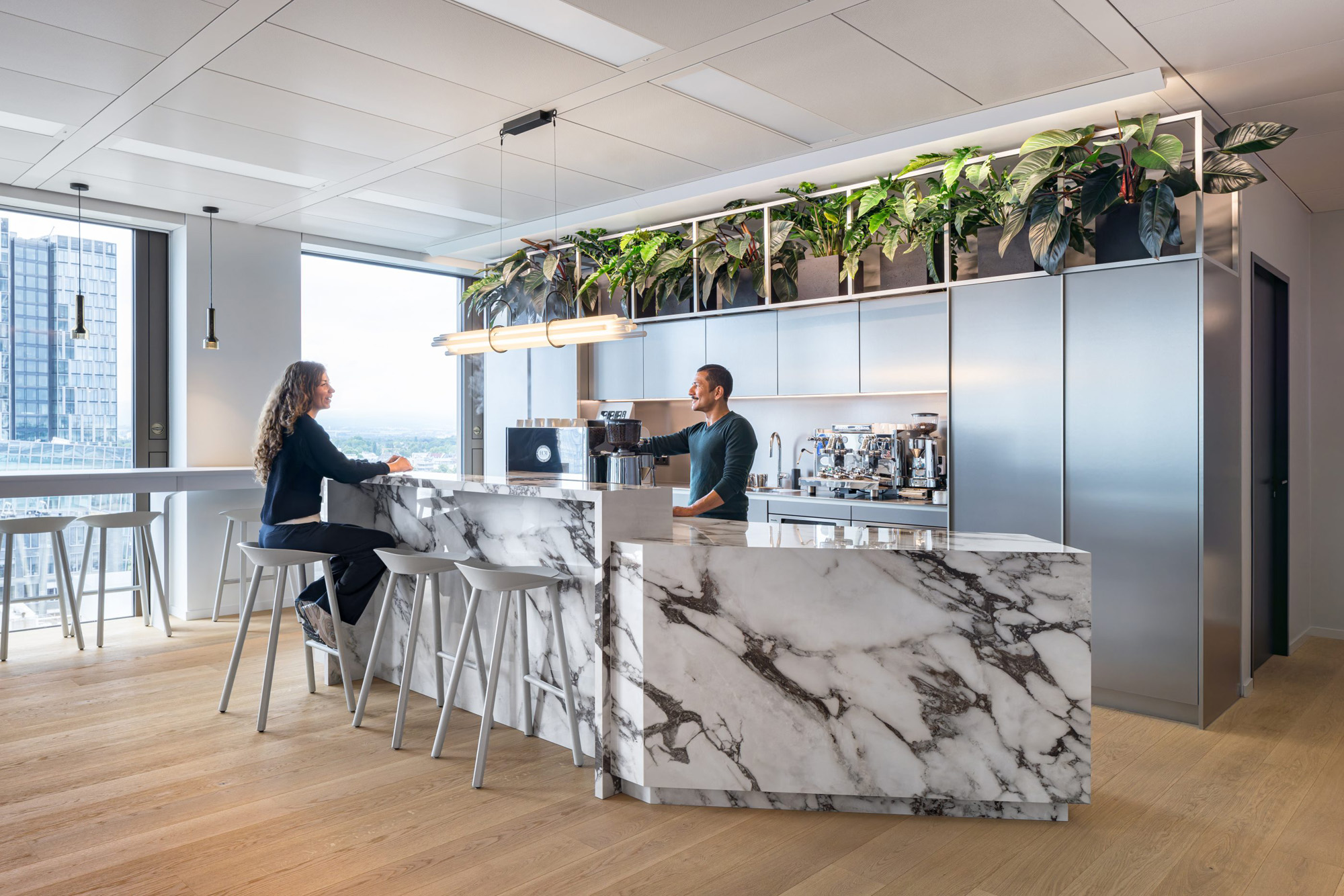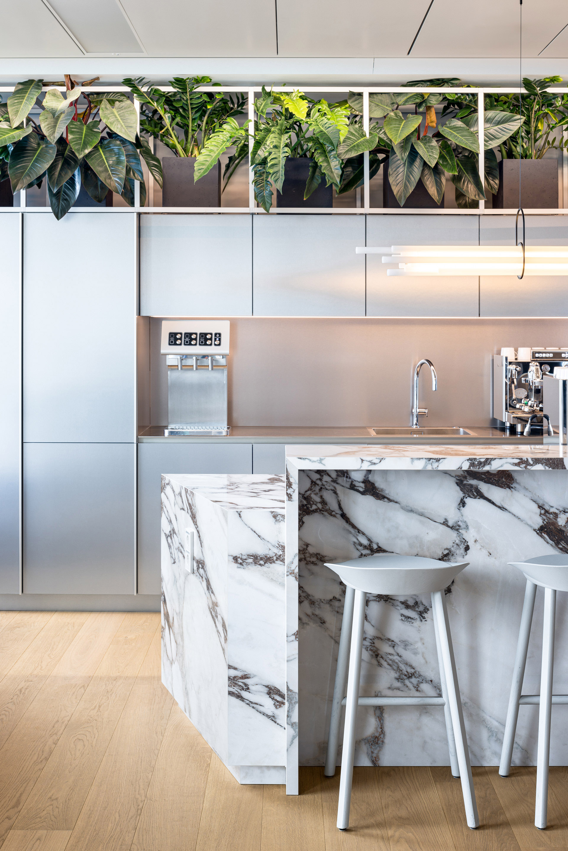位于Opernturm大厦的Ardian新办公室,Kinzo设计团队通过融合木材、石材等天然材料与遍布空间的百余处葱茏绿植,构建出一个和谐而宁静的整体环境。空间中的色彩搭配尤为精妙:绿植的自然青翠与蓝色调家具的优雅呼应,共同营造出充满自然气息的美学氛围。而在红色调厨房区域,绿植的引入则形成鲜明对比,不仅平衡了视觉冲击,更通过色彩的碰撞强化了空间的张力,打造出令人印象深刻的视觉效果和空间景致。