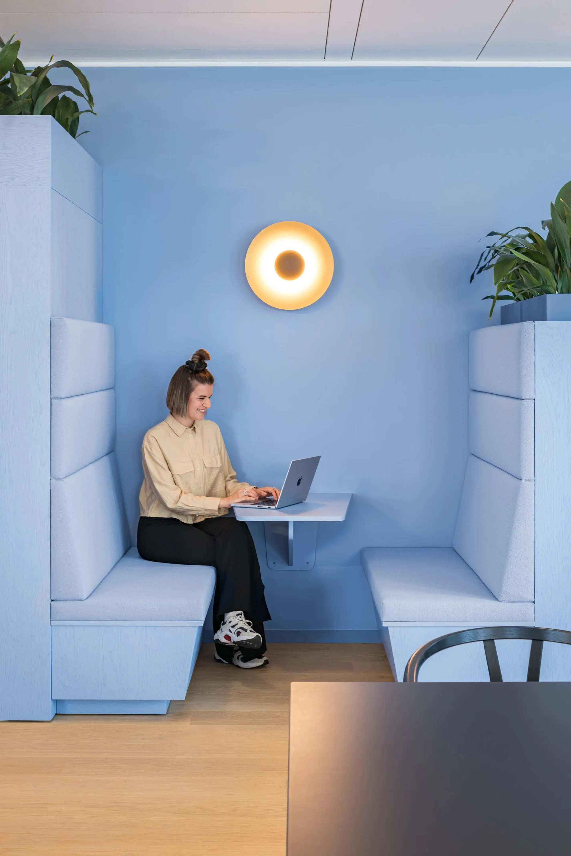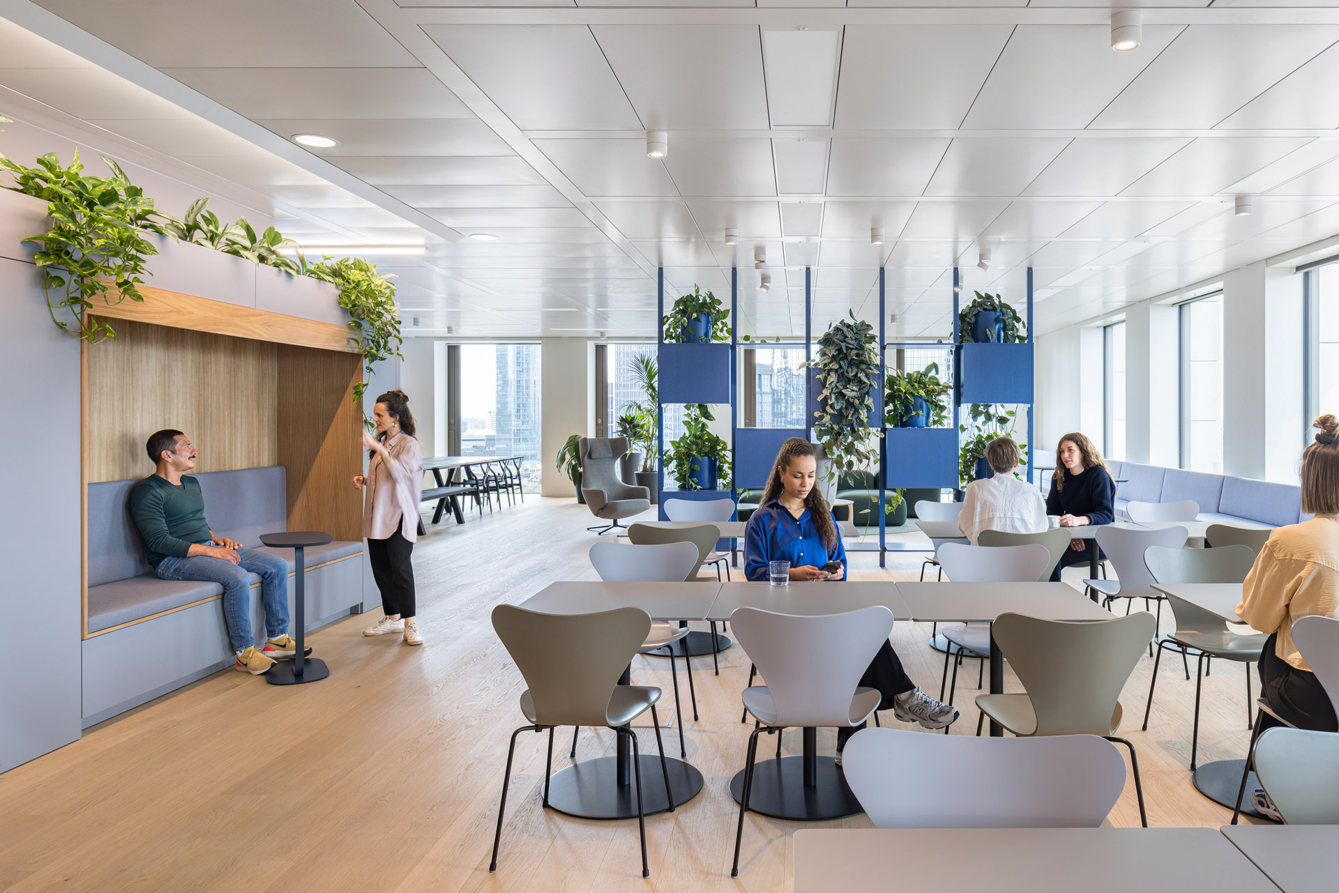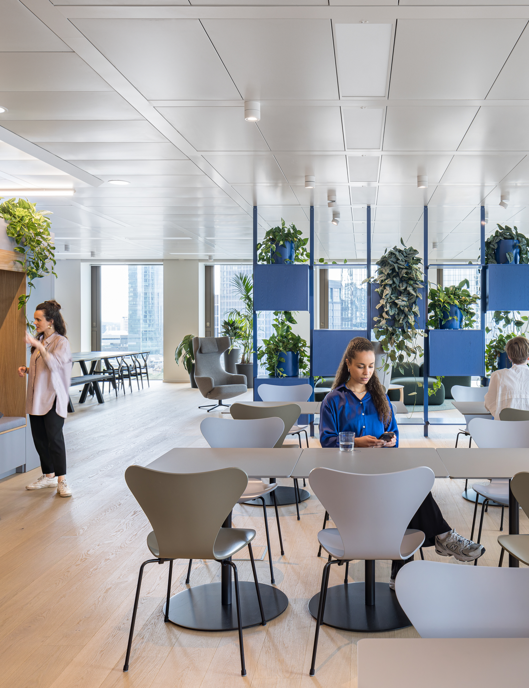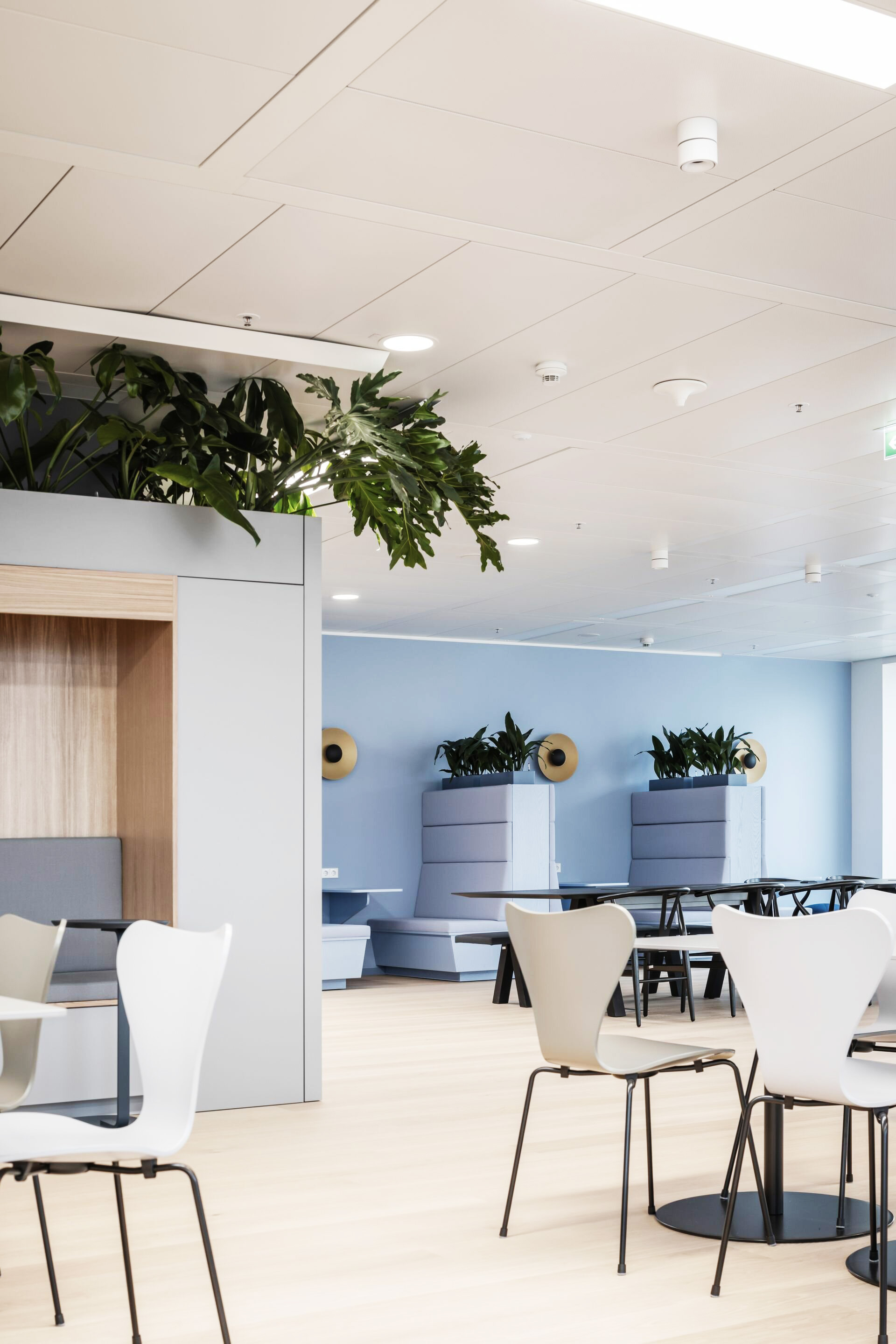位于Opernturm大厦的Ardian新办公室,Kinzo设计团队通过融合木材、石材等天然材料与遍布空间的百余处葱茏绿植,构建出一个和谐而宁静的整体环境。空间中的色彩搭配尤为精妙:绿植的自然青翠与蓝色调家具的优雅呼应,共同营造出充满自然气息的美学氛围。而在红色调厨房区域,绿植的引入则形成鲜明对比,不仅平衡了视觉冲击,更通过色彩的碰撞强化了空间的张力,打造出令人印象深刻的视觉效果和空间景致。
