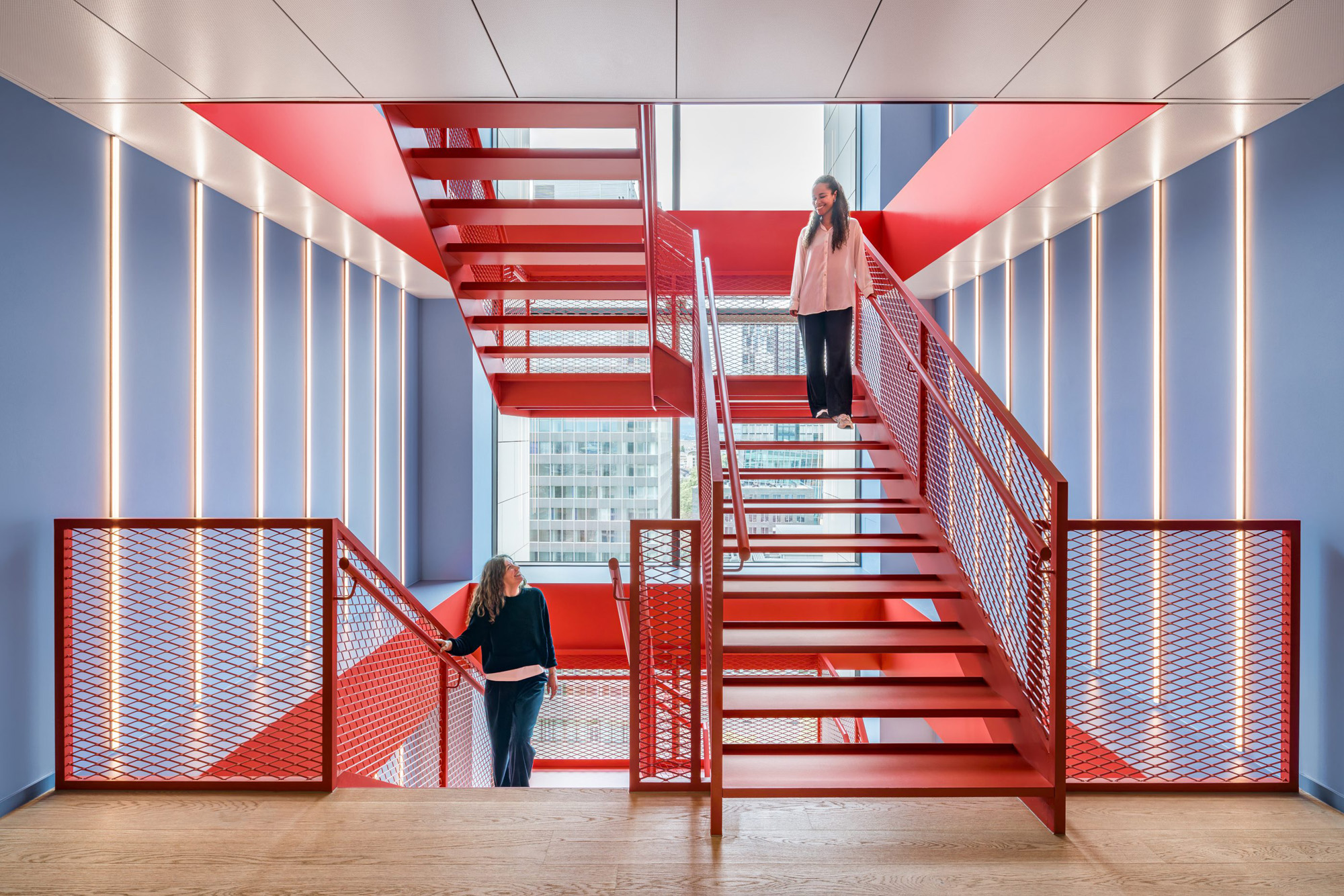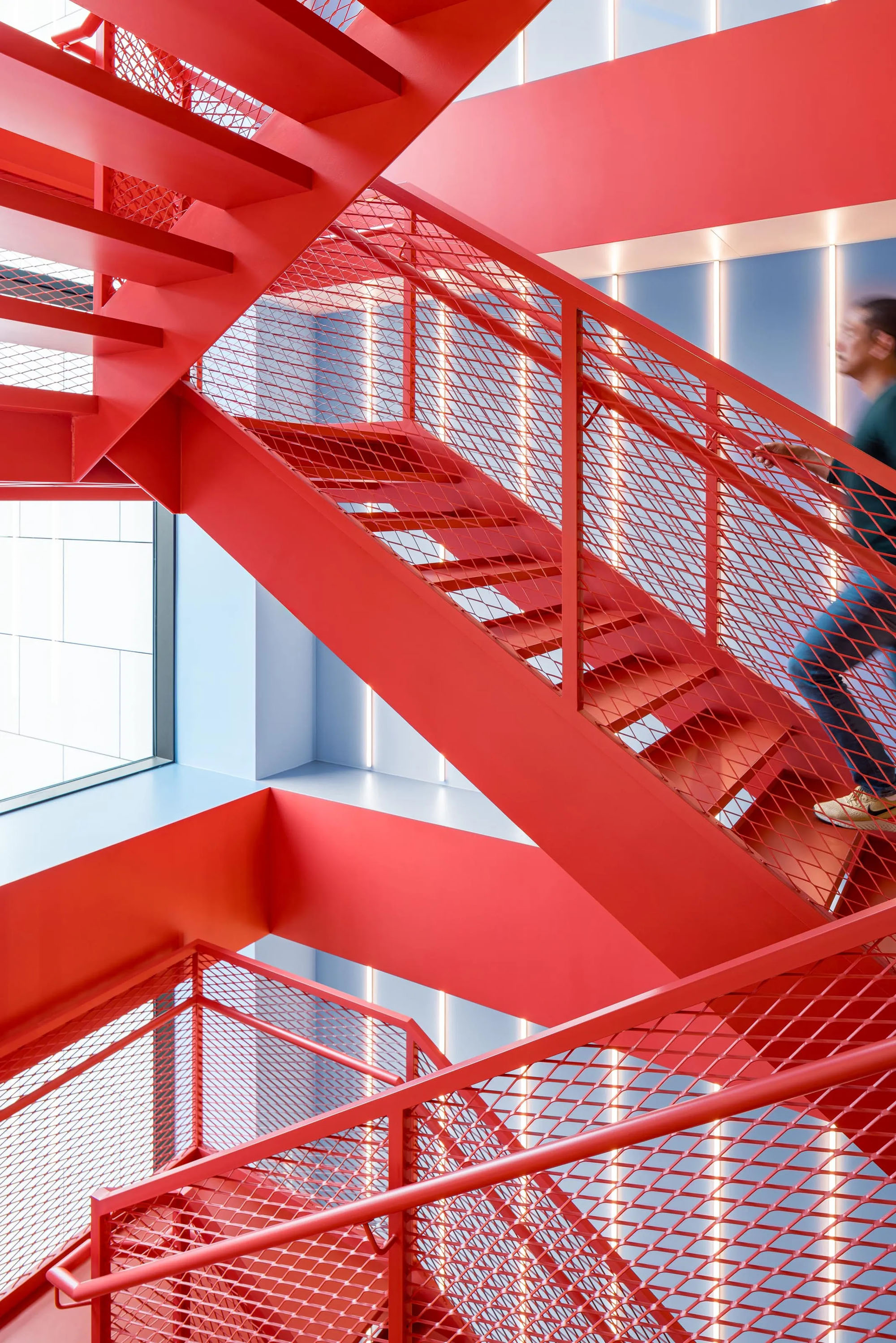 精心打造的楼梯结构贯通三个办公楼层,将十二层的核心交流区与十一层及十三层紧密相连。上方两层不仅设有简餐厨房,更配备了多个独立办公室及额外的会议空间。