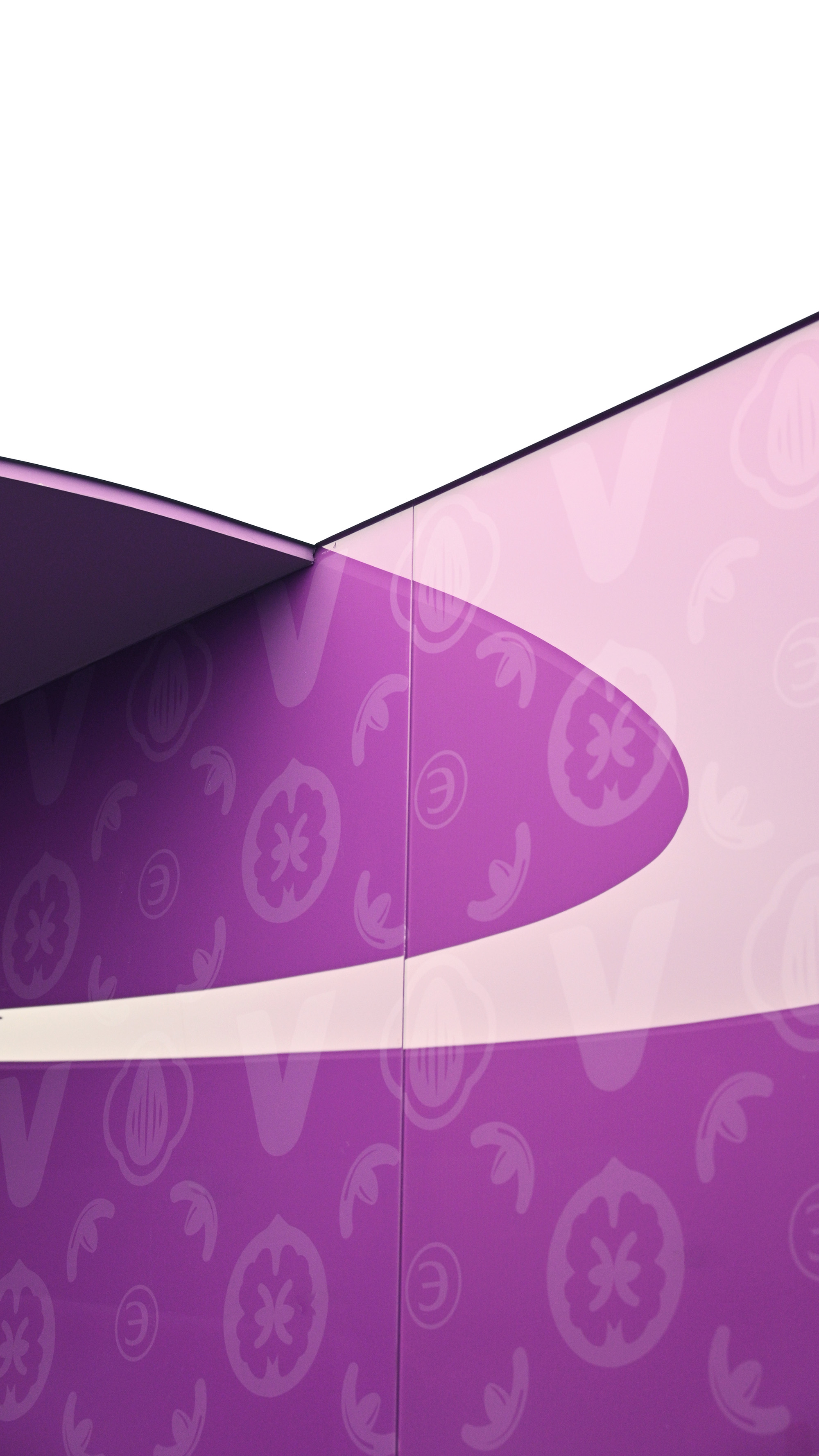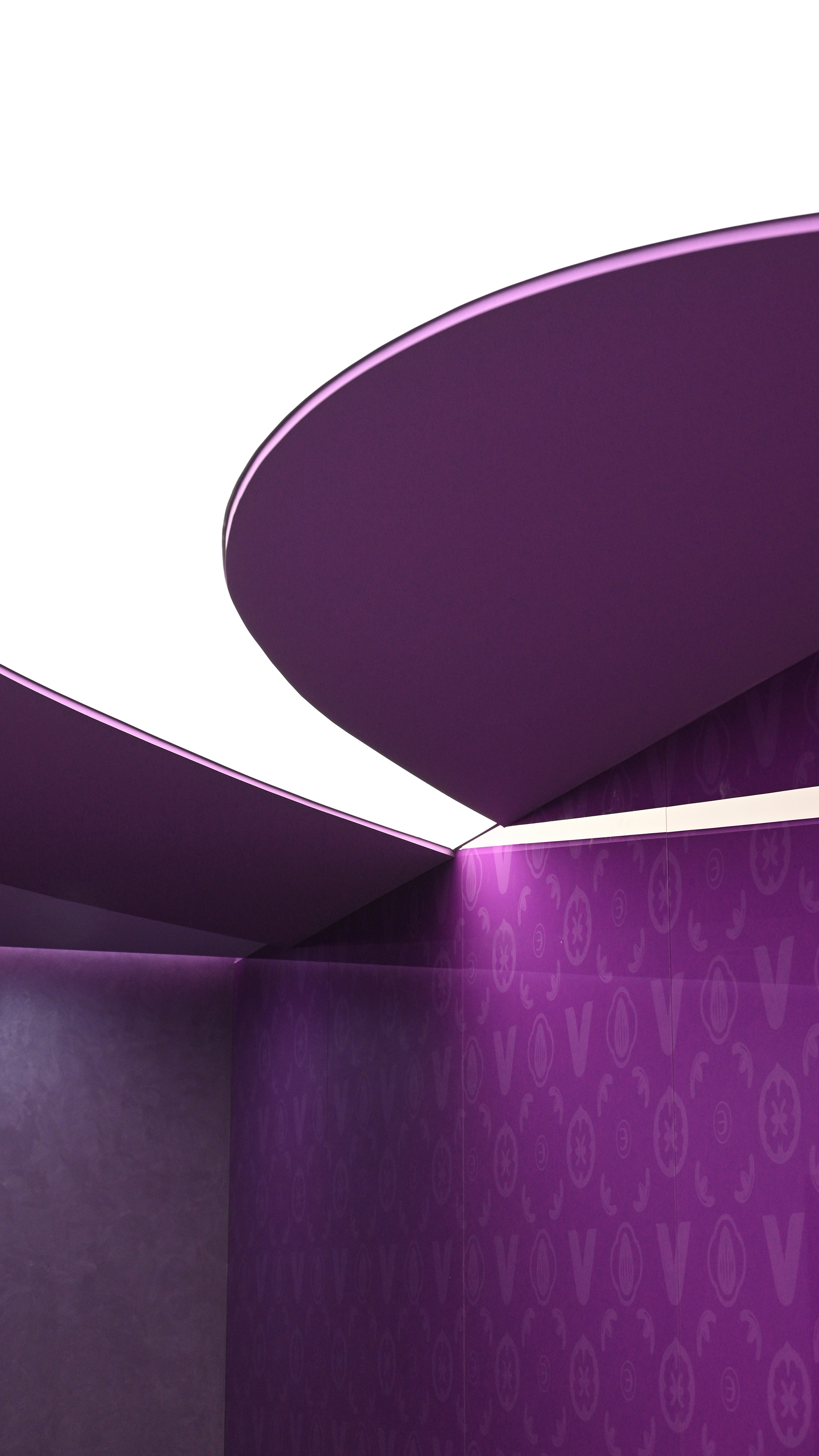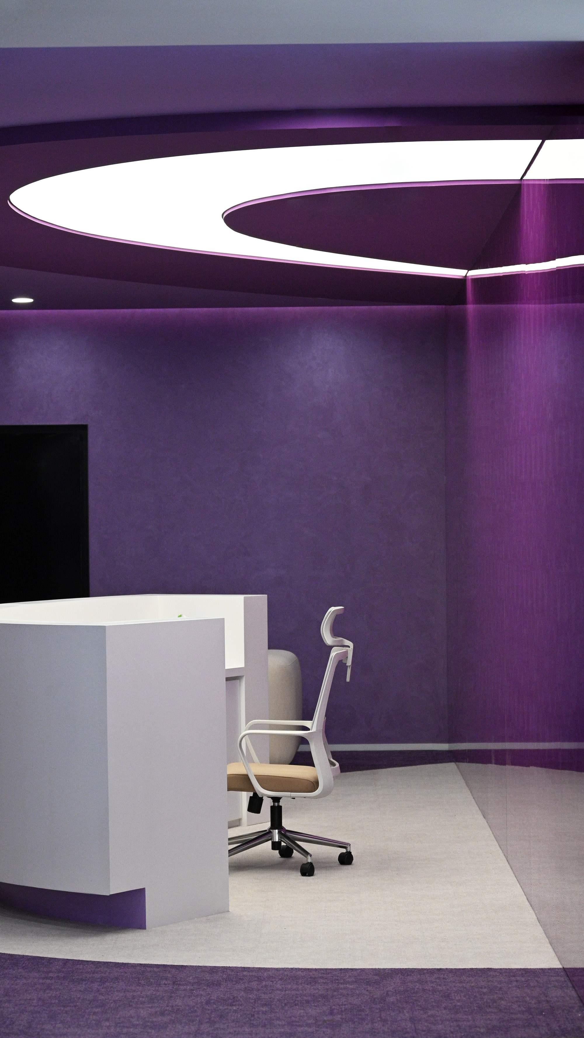 流动感品牌剧场:紫色印花玻璃形象墙搭配白色接待台如倾泻的奶液,纹理艺术漆侧墙、定制纹理地毯与彩色乳胶漆天花,构成多层次紫色交响曲,强化视觉冲击,让访客瞬间沉浸唯怡的独特气场。