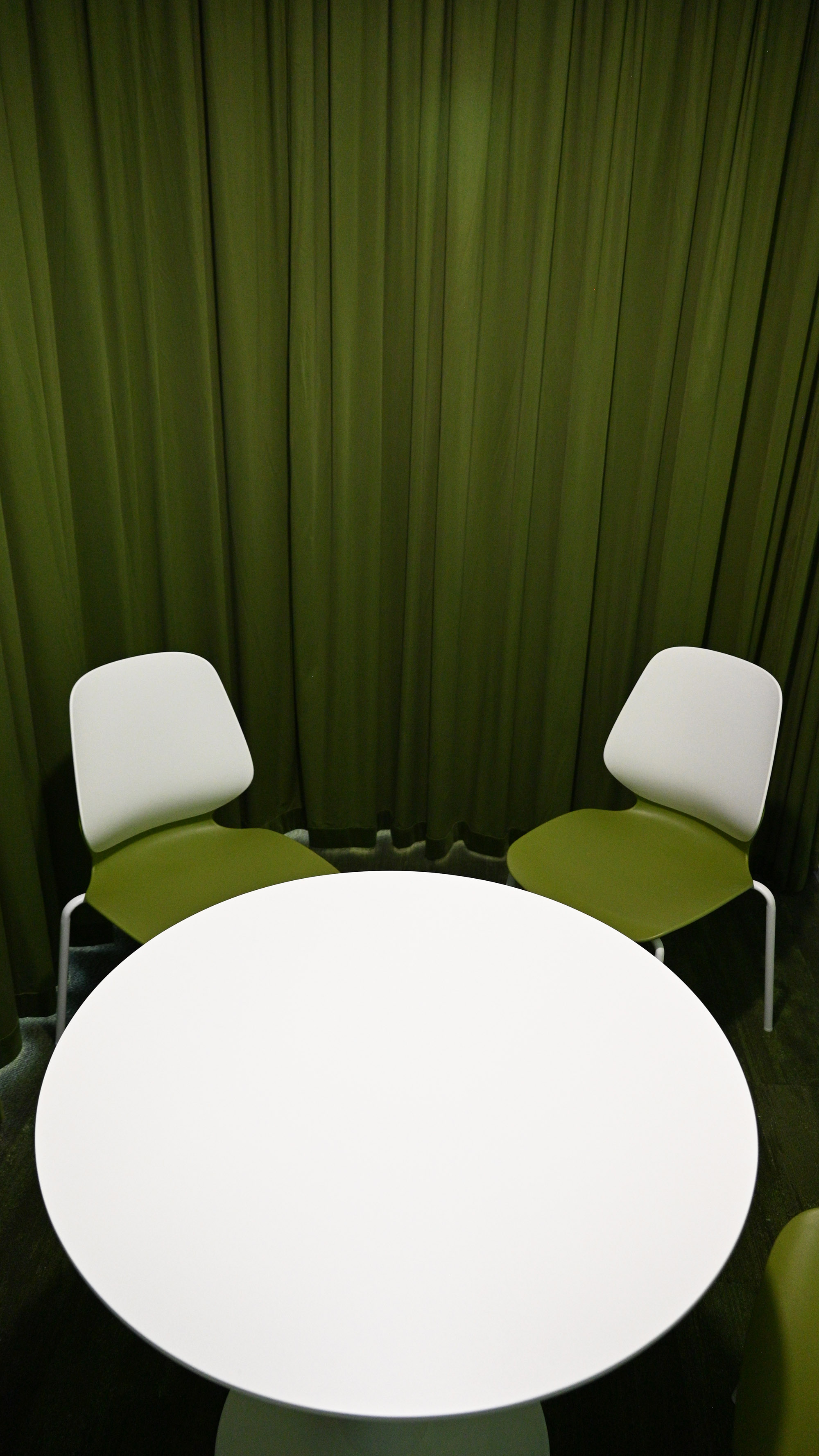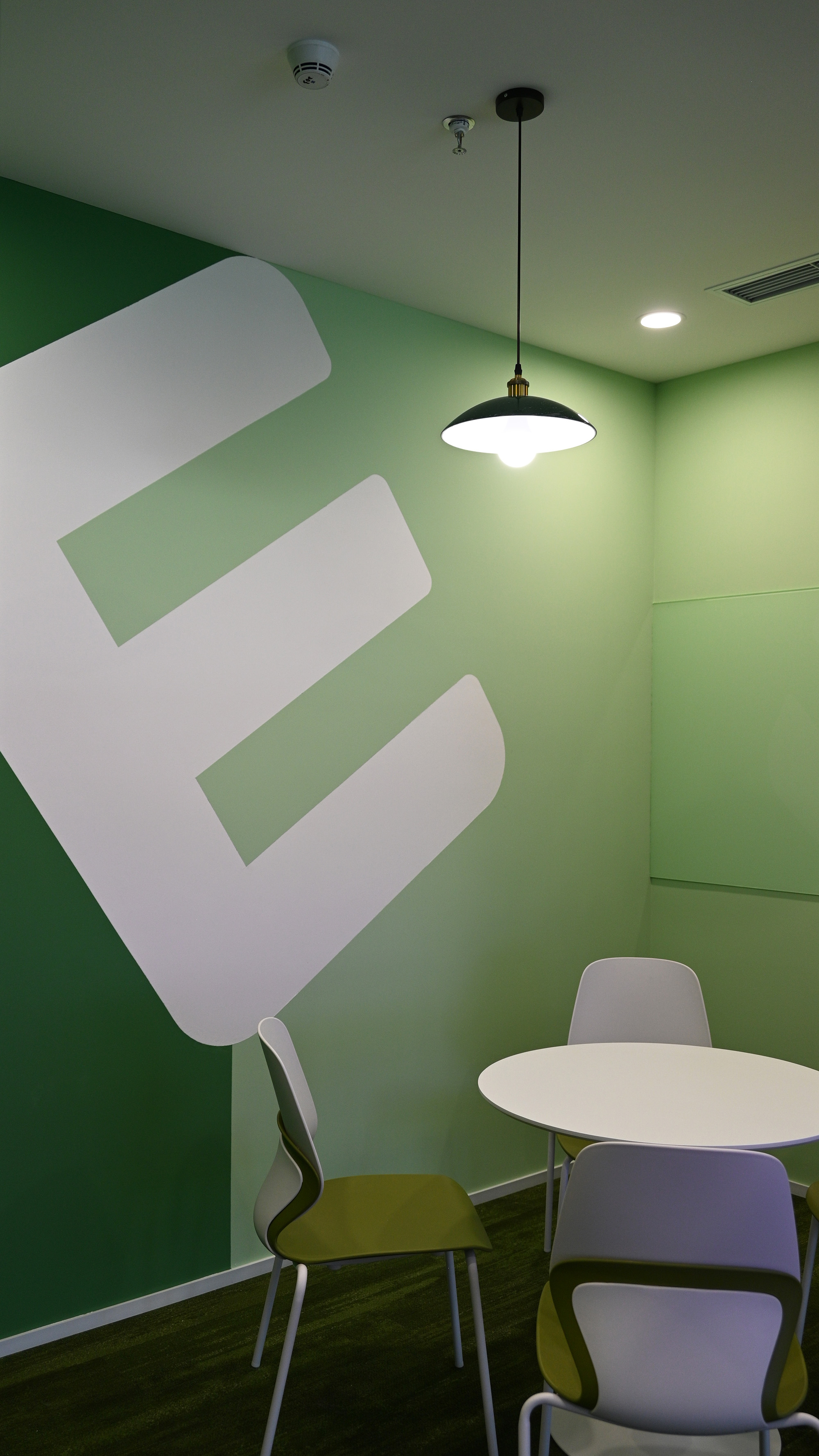 大培训室/中会议室/小洽谈室三阶布局,适配多元场景;吸音板拼贴出唯怡LOGO「V」「E」抽象造型,乳胶漆跳色墙面延续紫绿脉络;彩色落地帘与同色系地毯,构成动态艺术装置。