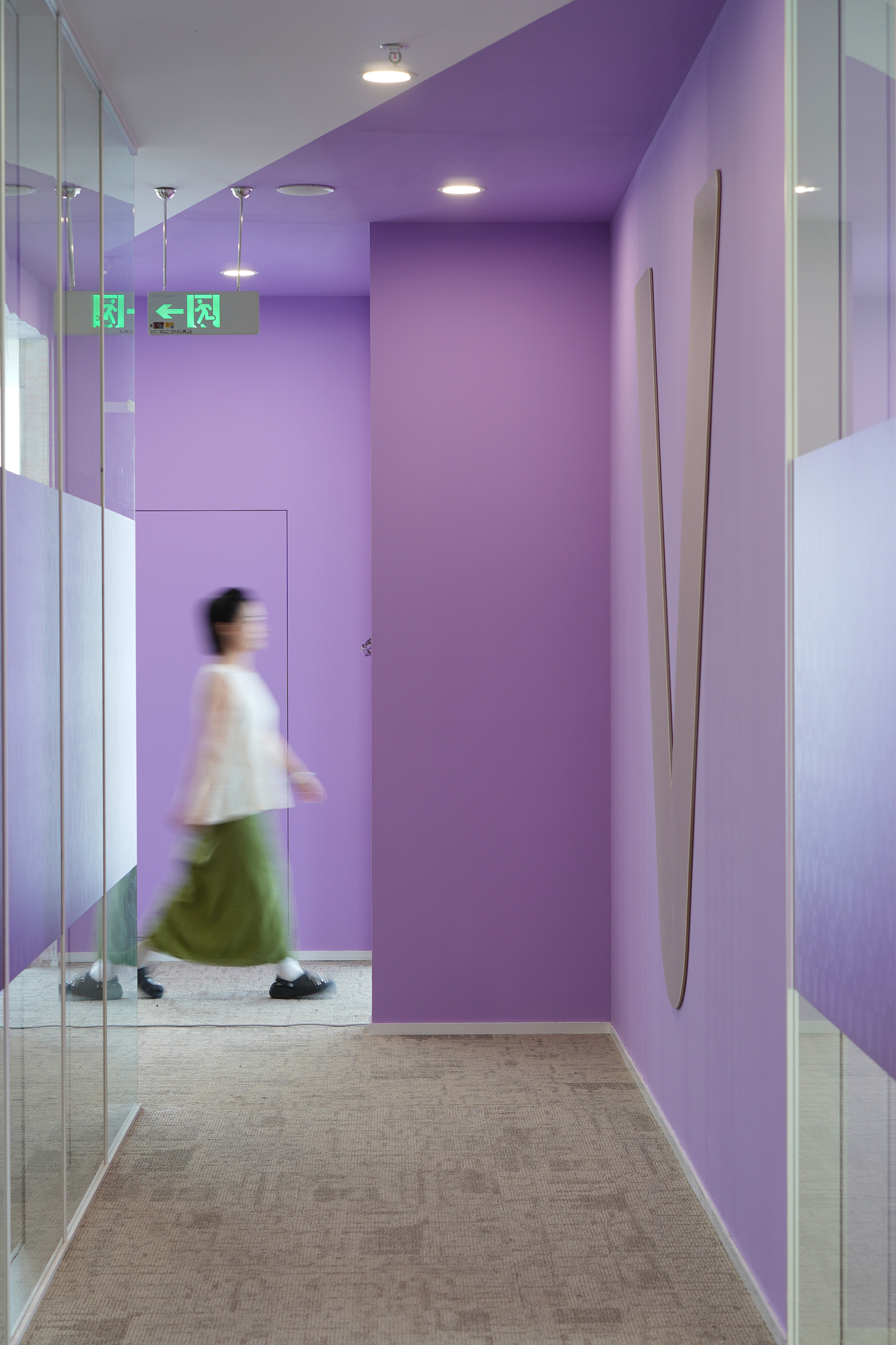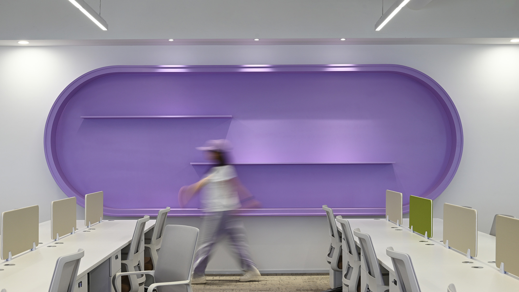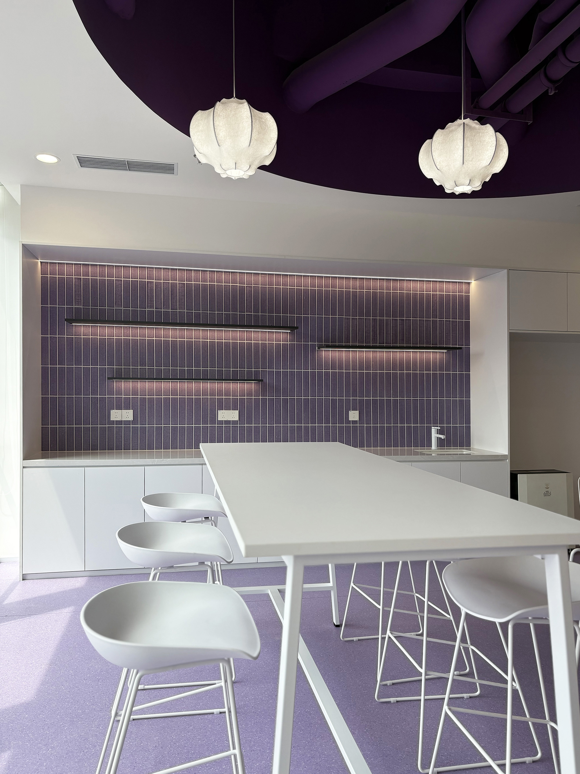 白色家具+白框双玻隔断,营造通透清爽氛围。磨砂玻璃嵌入唯怡经典老花图腾,墙面跃动紫色色块,如散落的健康能量因子。