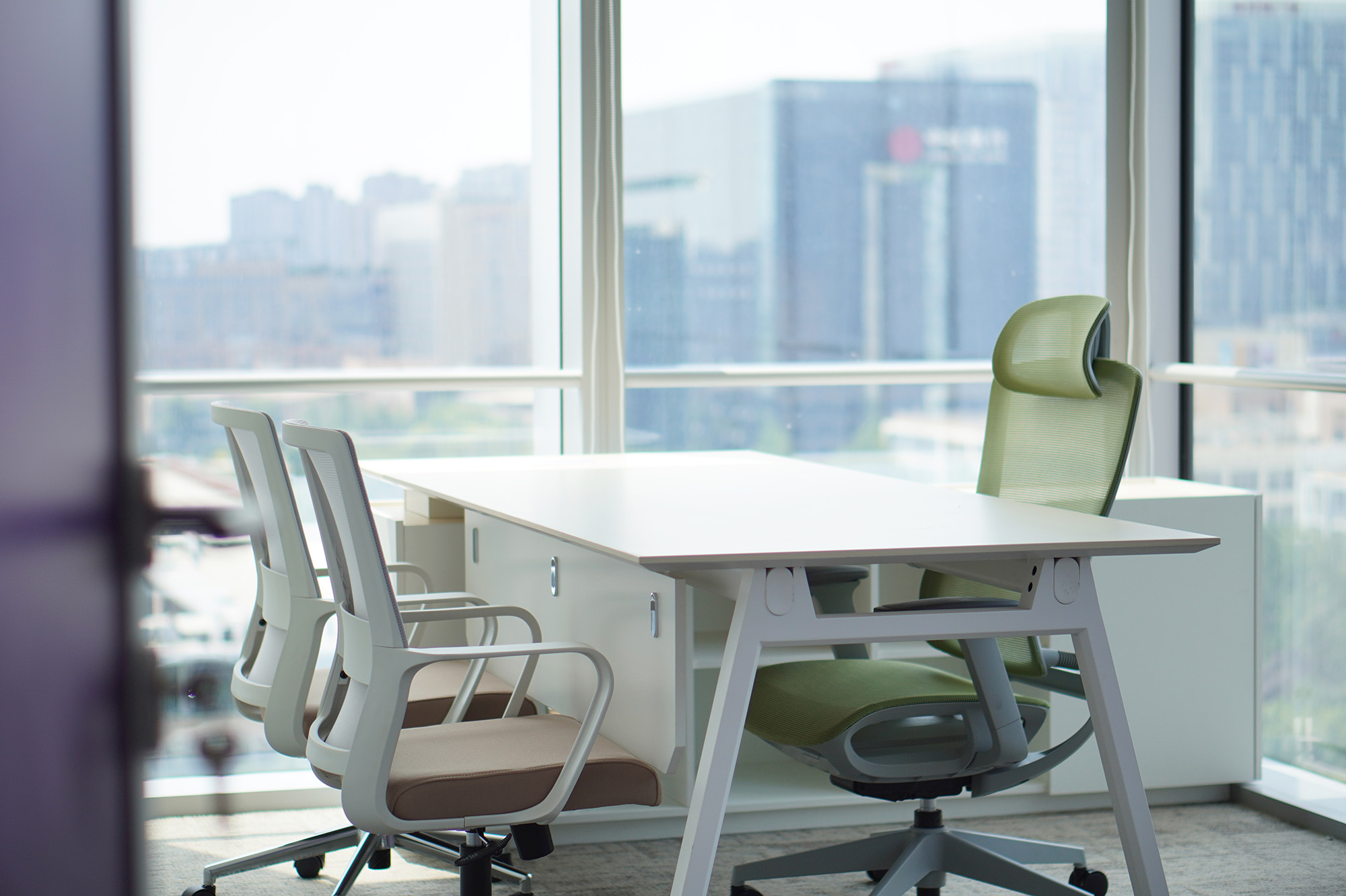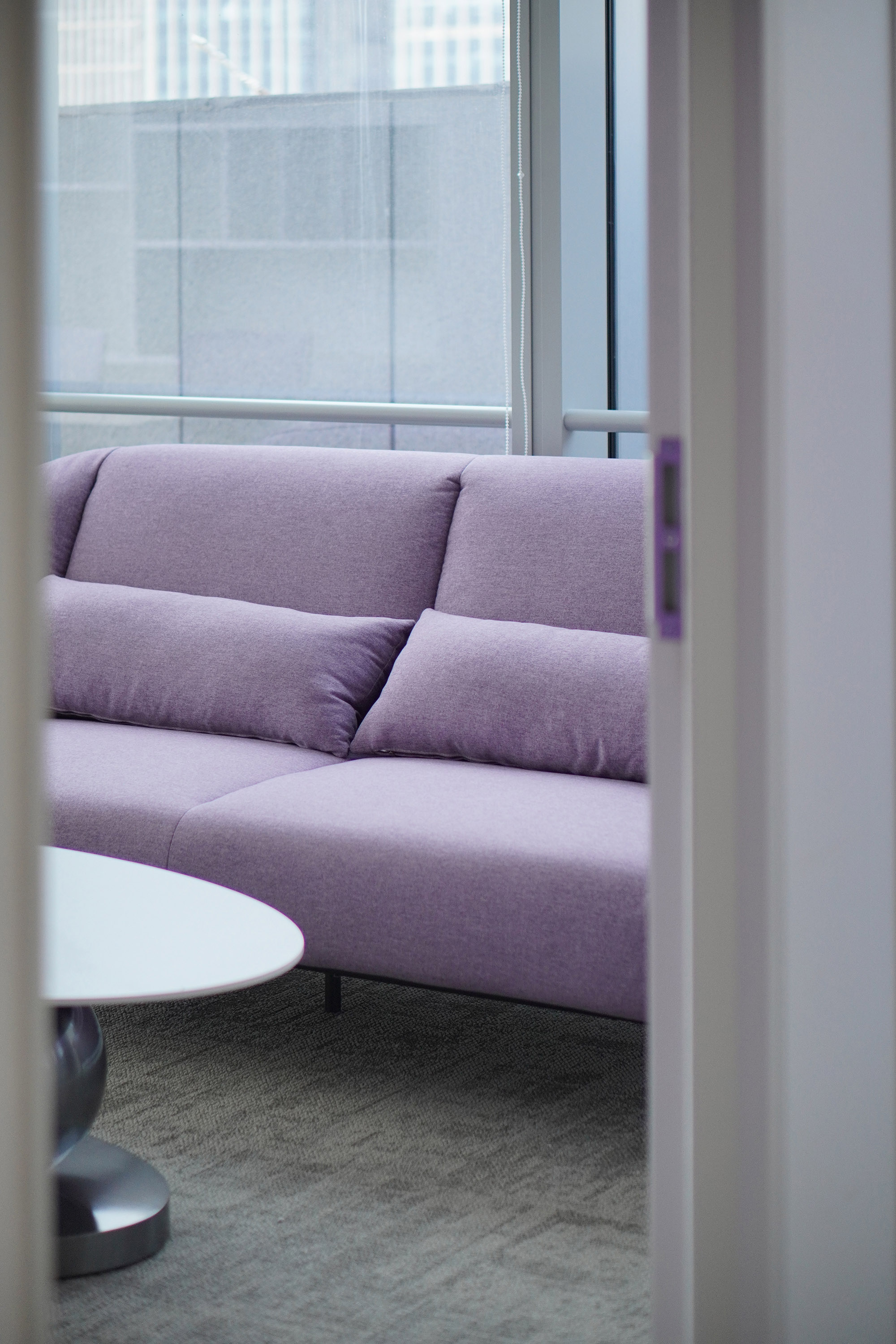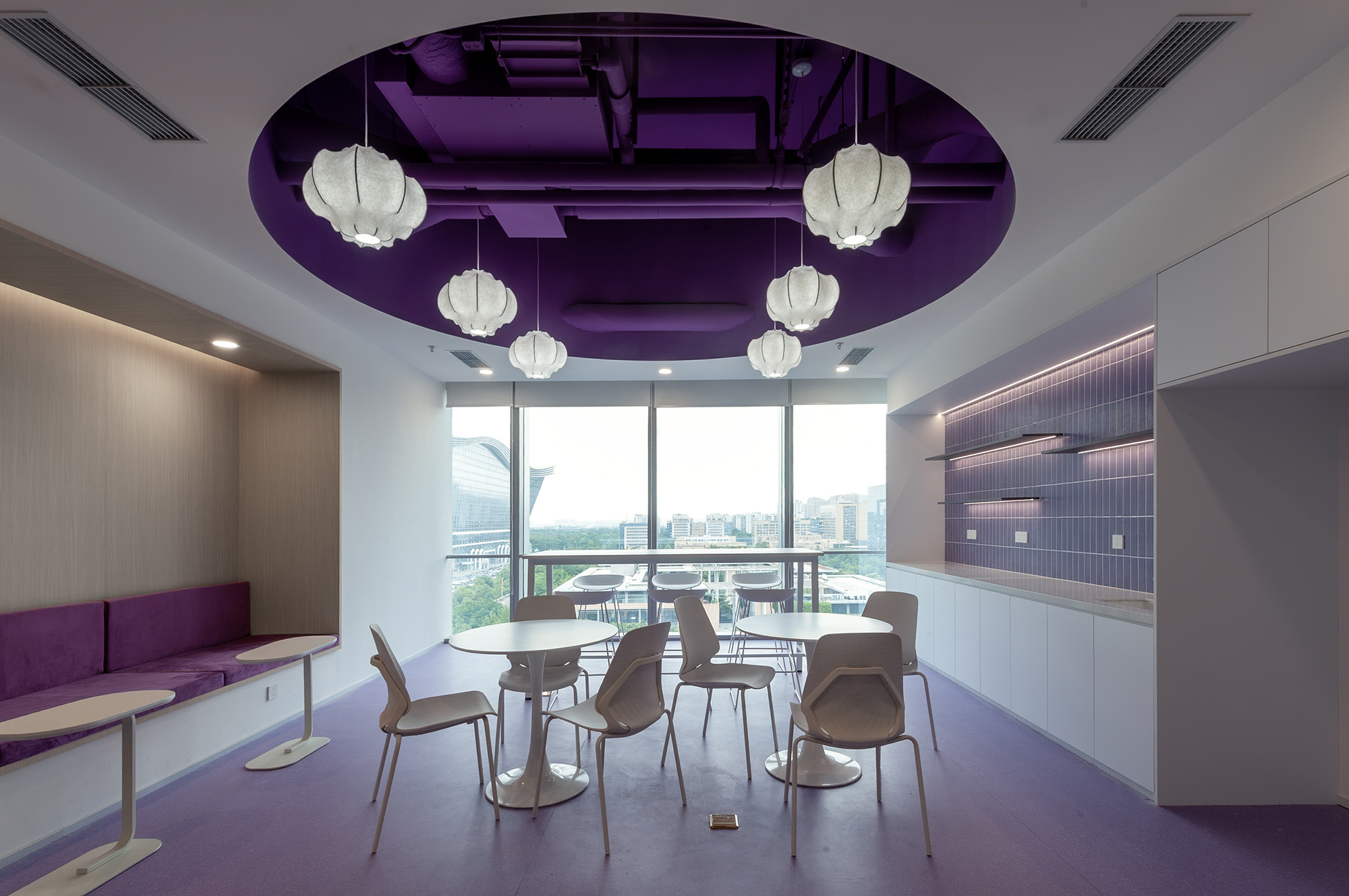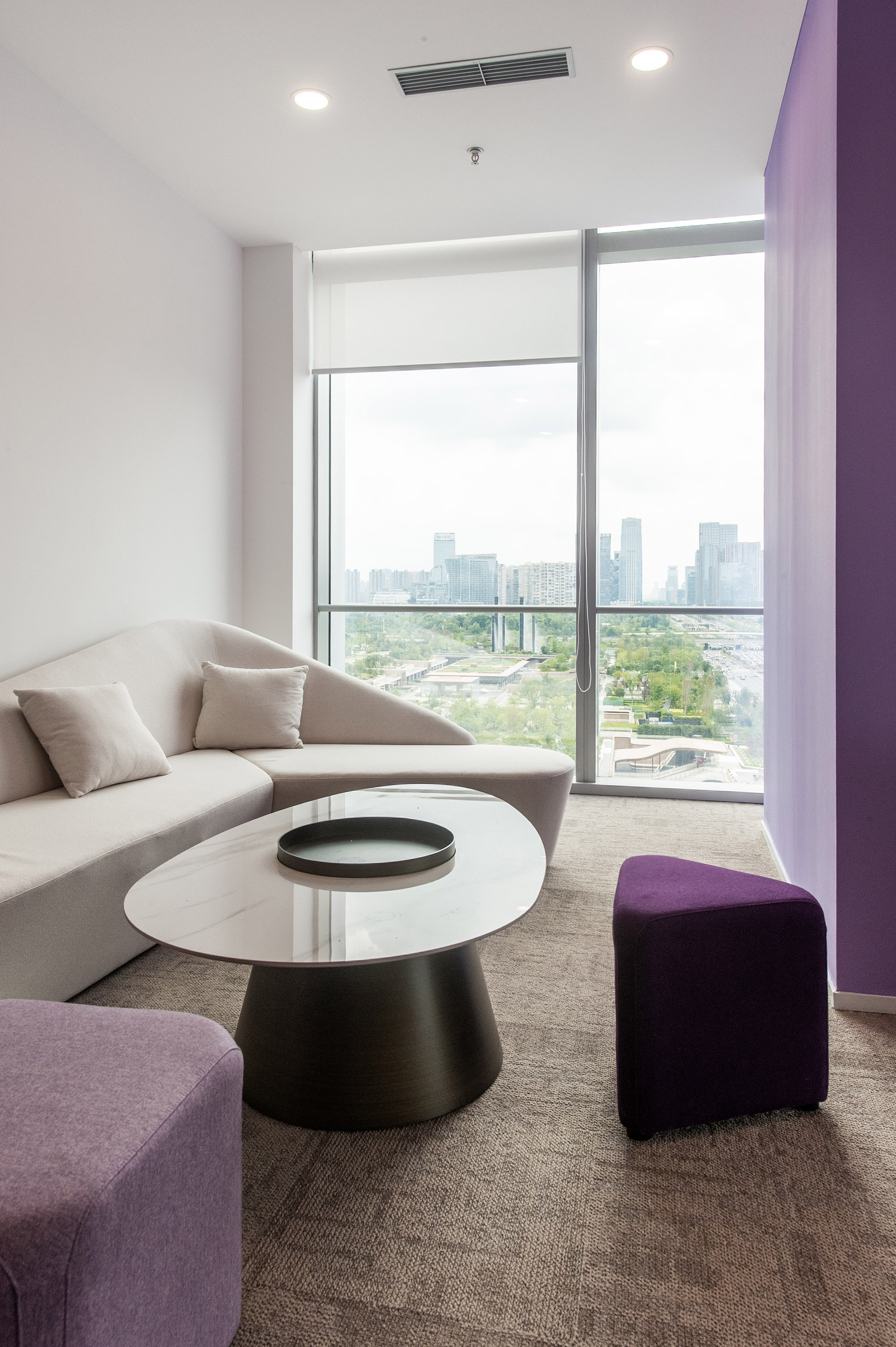 绿洲茶水区:临窗吧台配高脚椅,俯瞰天府大道车流霓虹。紫调茶水区:紫调软包卡座+圆形餐桌,阳光与城市天际线在此交融。从咖啡洽谈到团队脑暴,满足各种休闲场景切换。