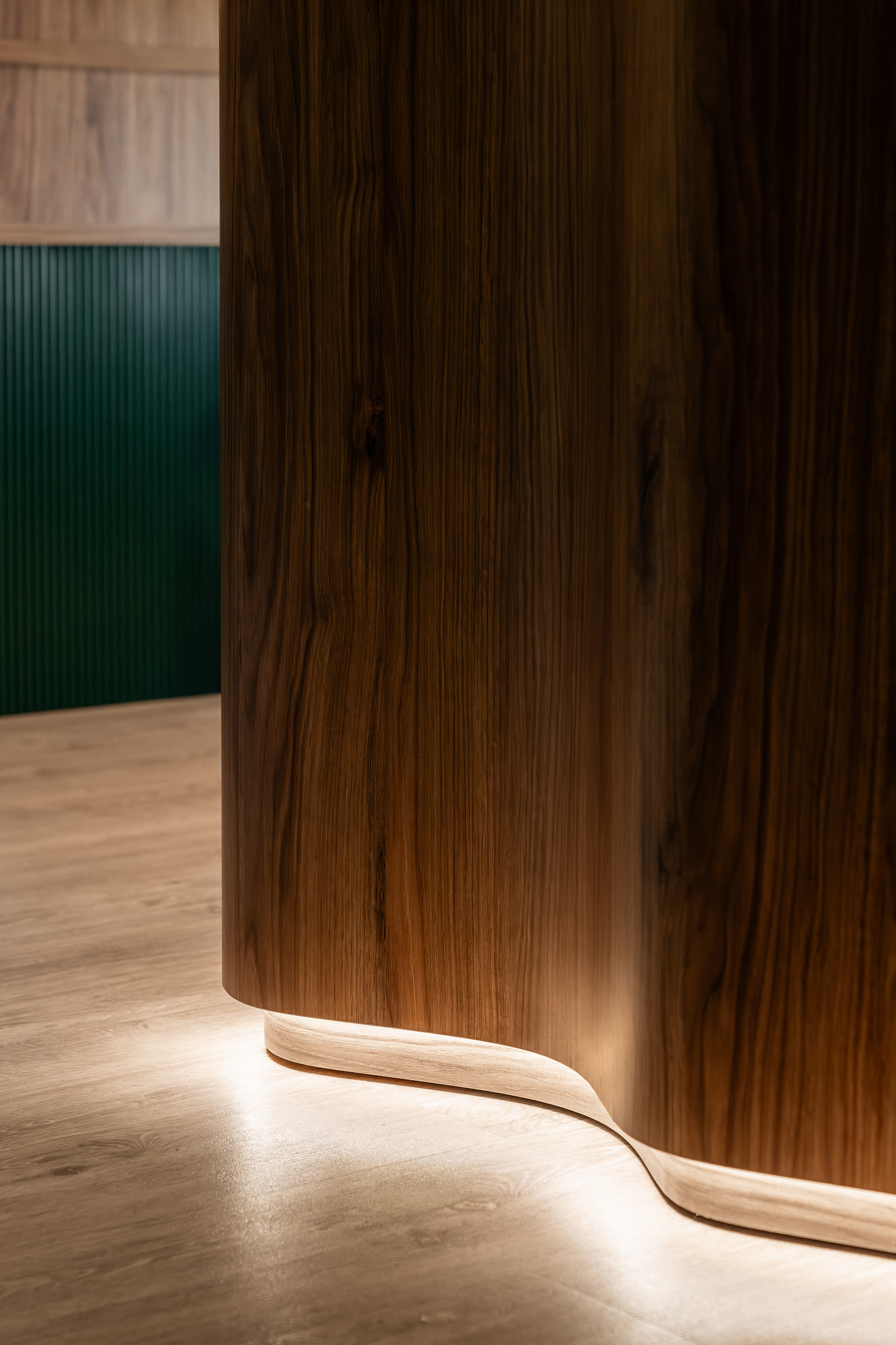整体设计理念立足于材质与色彩的和谐共鸣。建筑师匠心独运地融合红砖、原木、绿植与赤陶色系,营造出既充满活力又温暖亲和的空间氛围。纵横各处的红砖成为统一视觉语言的核心元素——既与光滑表面形成质感碰撞,又与原木材质和绿植相得益彰,为空间注入节奏感与优雅气质。雕花玻璃门扇、赋予loft气质的纵横窗格、点缀特定区域的玻璃砖,以及家具结构中的灰泥饰面与格栅元素——所有这些细节共同编织出以匠艺为核心的层次叙事。