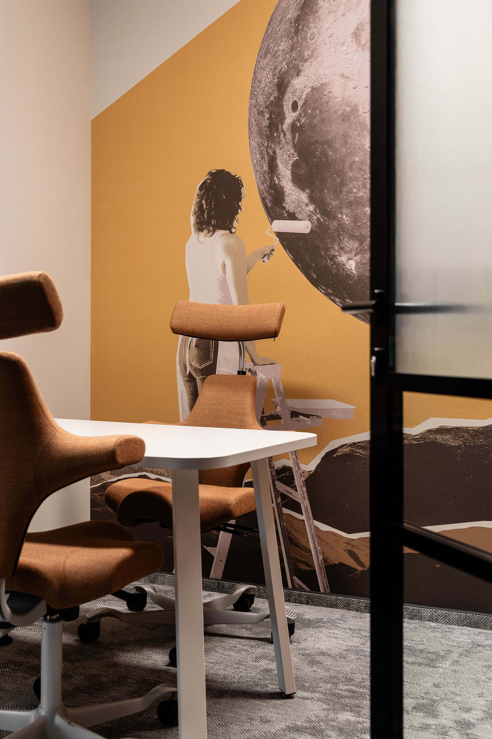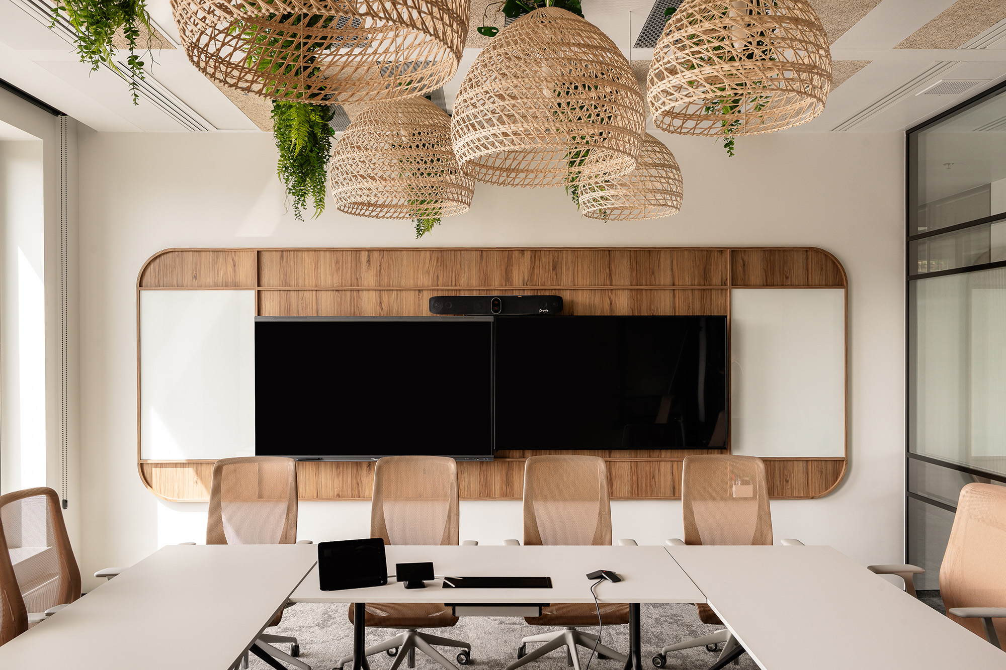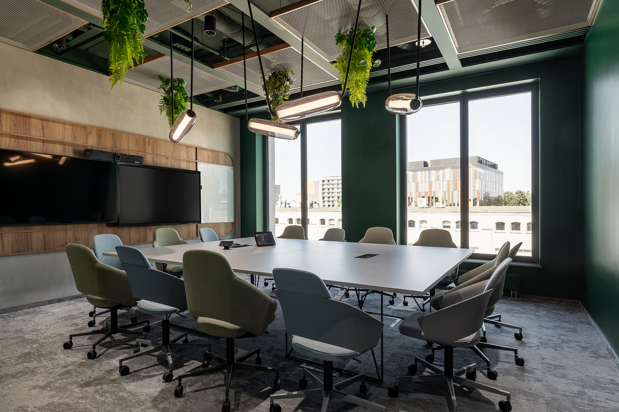 公共区域以鲜明色彩与特色装饰夺人眼球,开放式办公区却刻意采用沉静的色调。米白、灰阶与原木色构成中性背景,为专注工作提供视觉支撑。隔断结构不仅赋予美学价值,更有效改善声学环境——这对大型办公空间至关重要。空间同时保有高度灵活性:会议室配备可移动家具以实现快速重组,风格各异的小型洽谈间从藤编元素的波西米亚风到绿灰基调的极简主义从容切换。