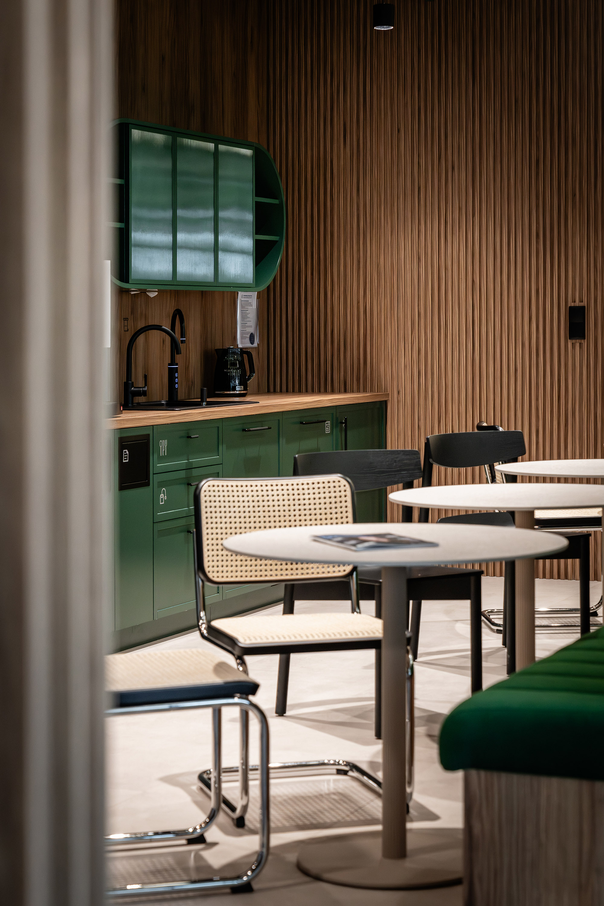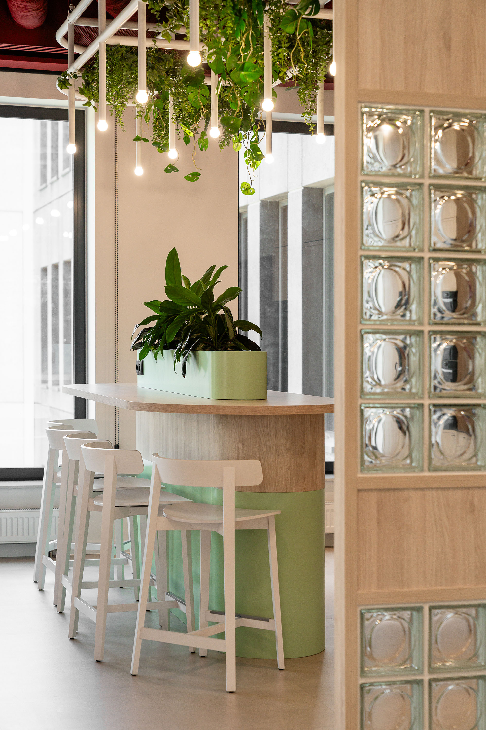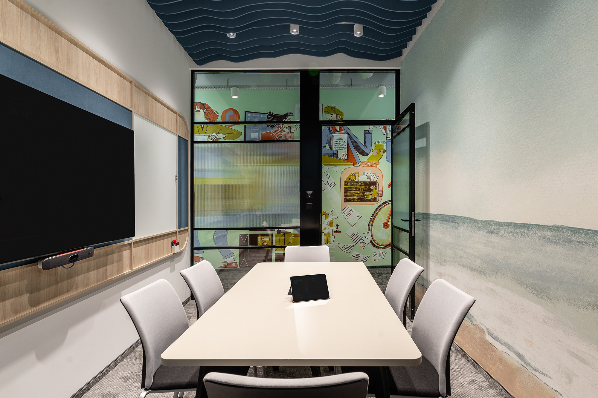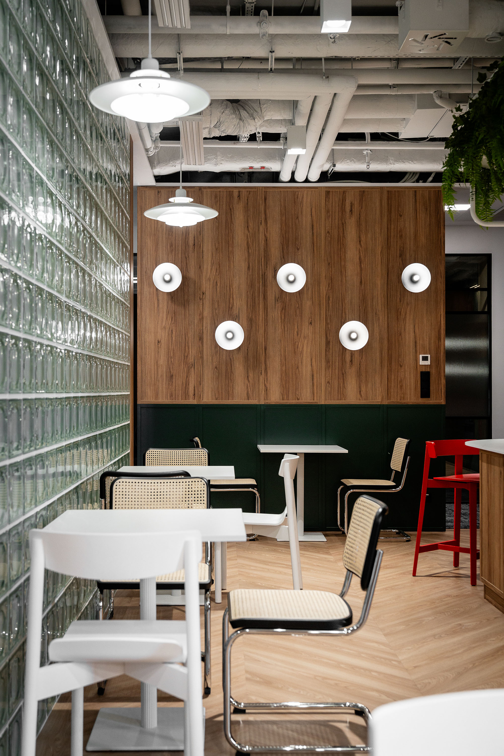 公共区域以鲜明色彩与特色装饰夺人眼球,开放式办公区却刻意采用沉静的色调。米白、灰阶与原木色构成中性背景,为专注工作提供视觉支撑。隔断结构不仅赋予美学价值,更有效改善声学环境——这对大型办公空间至关重要。空间同时保有高度灵活性:会议室配备可移动家具以实现快速重组,风格各异的小型洽谈间从藤编元素的波西米亚风到绿灰基调的极简主义从容切换。