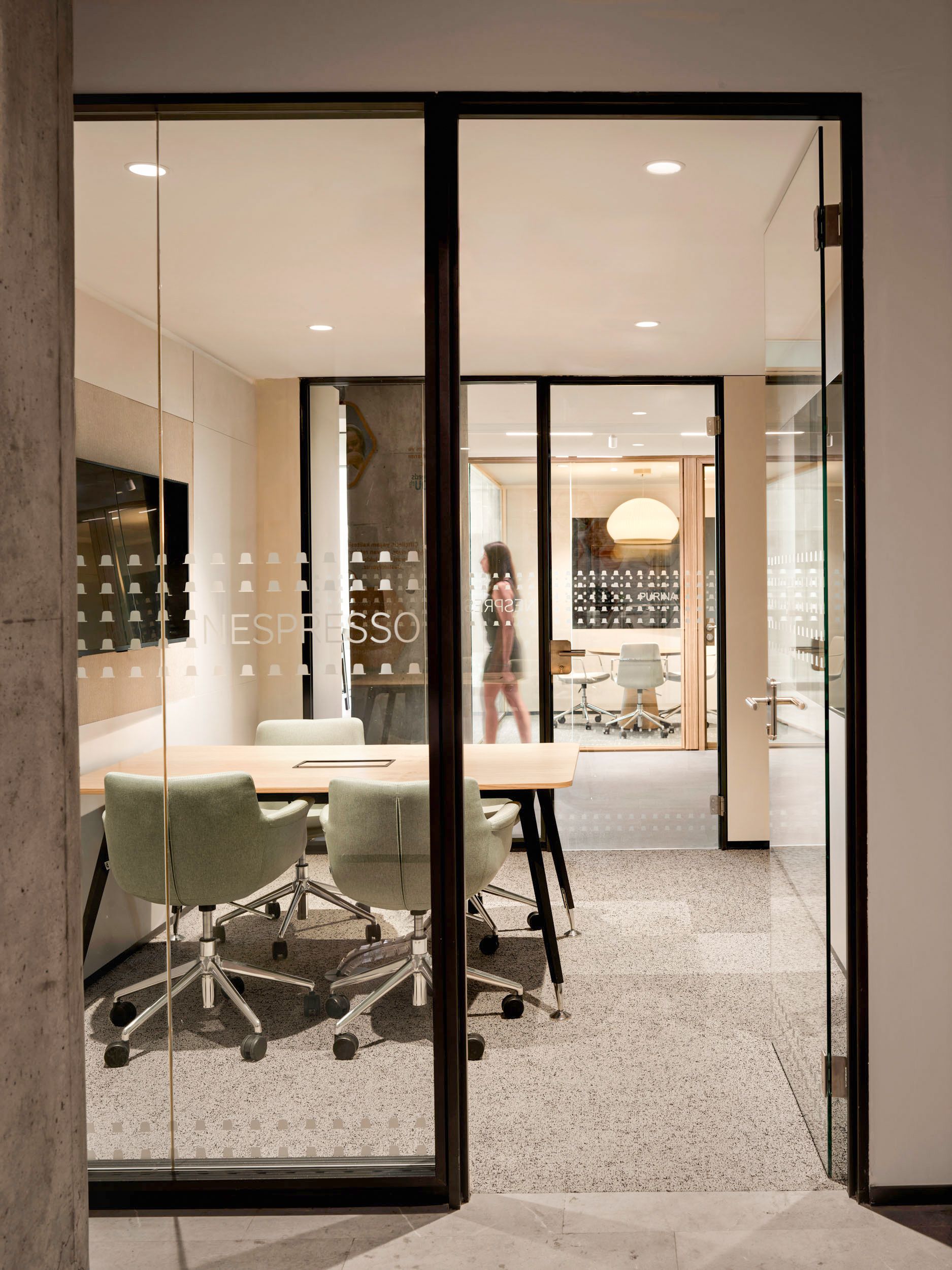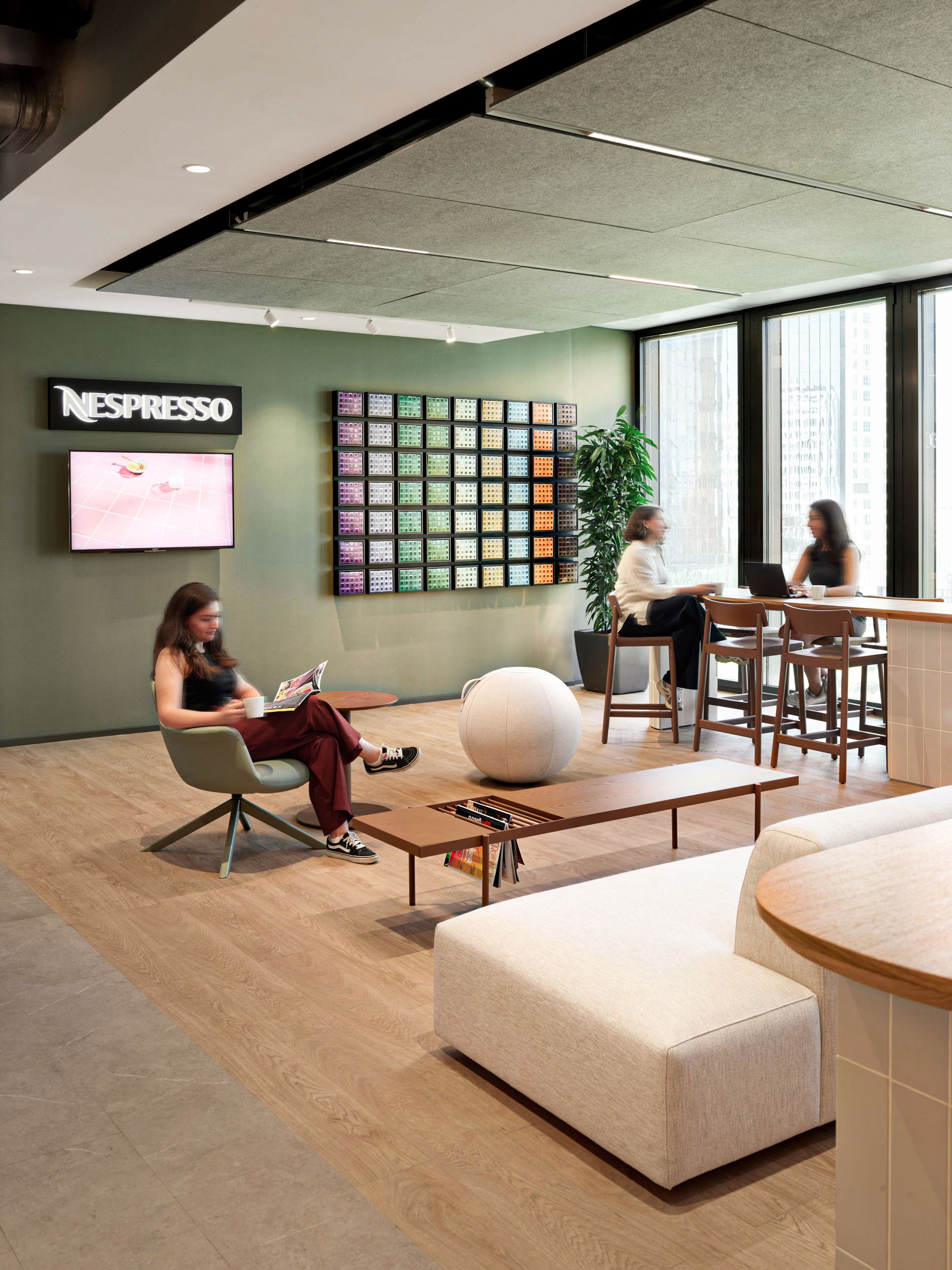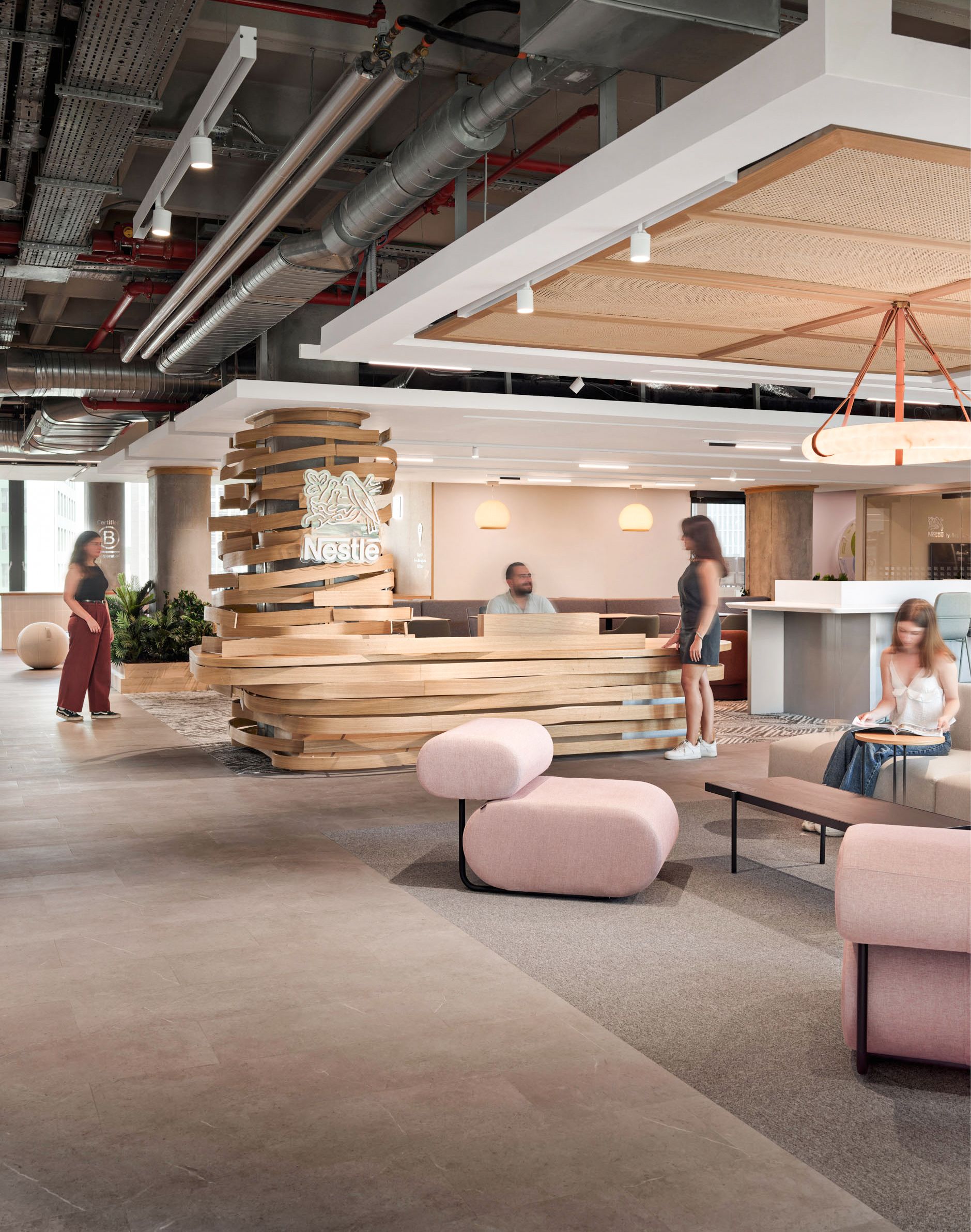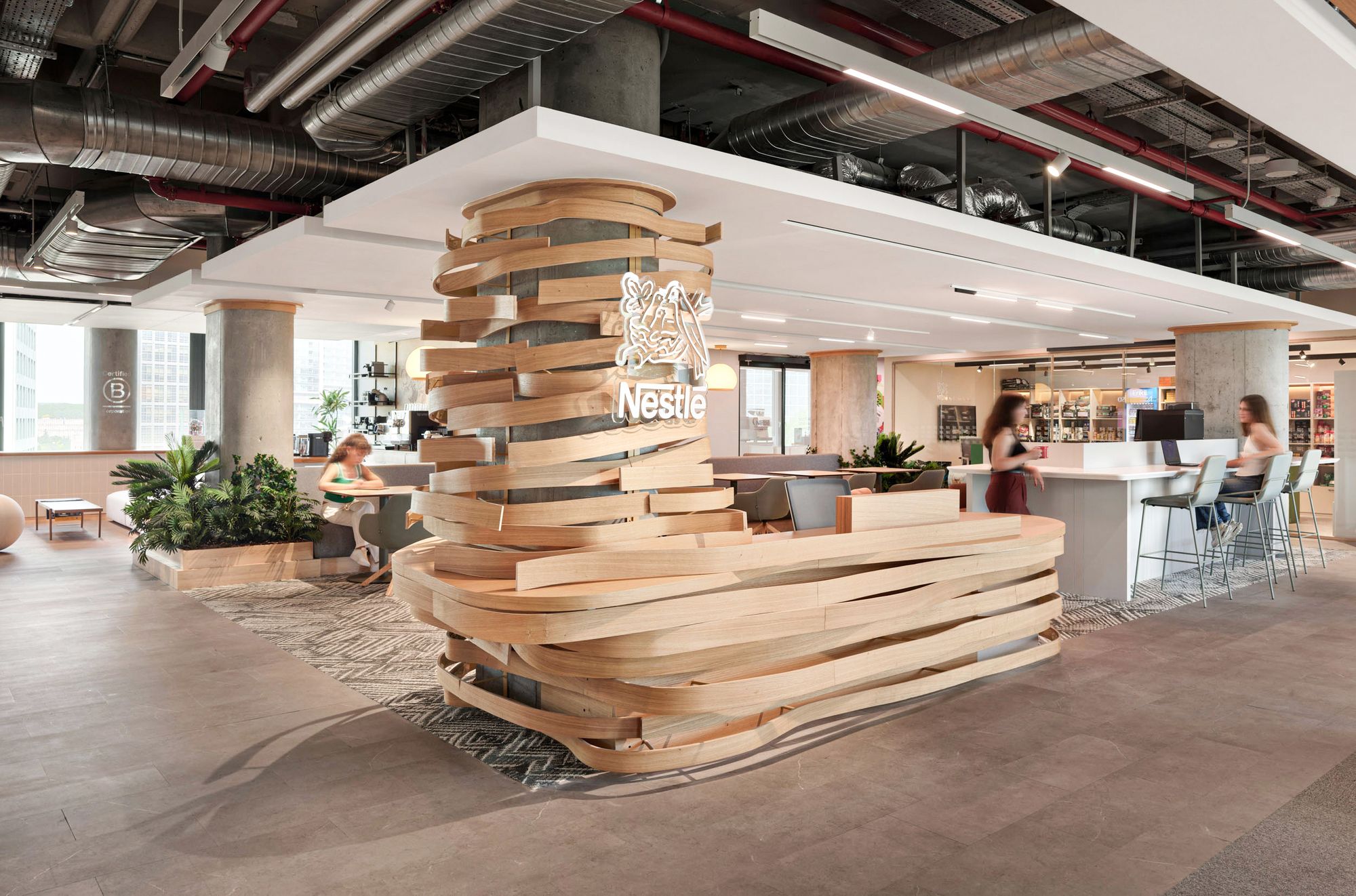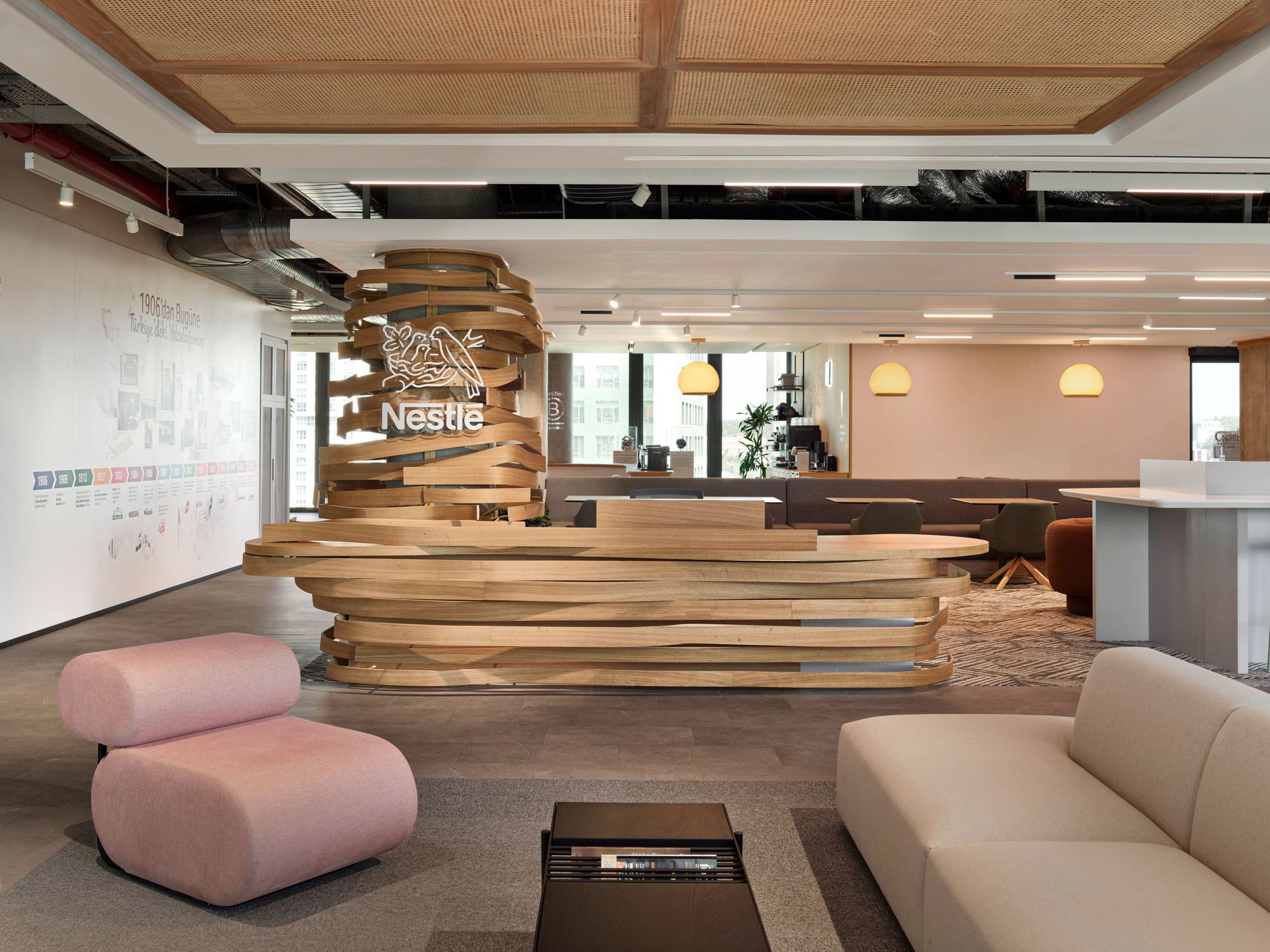 一套“全球本土化”的设计语言,巧妙衔接了全球标准与在地文化,营造出包容共融、以人为本的环境,让每位成员都感受到被重视。受可可、牛奶与咖啡的启发,材质的叙事性建立起与雀巢产品的情感联结;而纹理、图形与艺术装置的运用,则将品牌传承融入空间体验。这些原则共同作用,最终将办公场所转变为一个现代化的栖息地——在此,员工福祉、品牌身份与文化传承和谐交融。