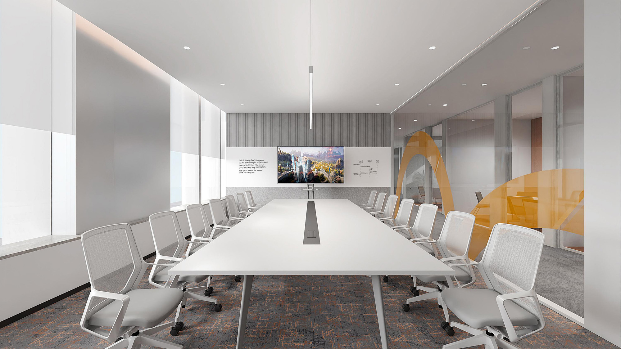 前台区域作为企业对外展示的第一窗口,延续现代简约的风格,弧线天花像是打开的一道光圈,寓意创意灵感的无限延伸,一扇拱形窗景,将外部的城市风景引入室内。简洁大气的线条与材质,用光影和色彩强化品牌识别度。让每一位踏入空间的人,都能感受到跳跃的创新能量。