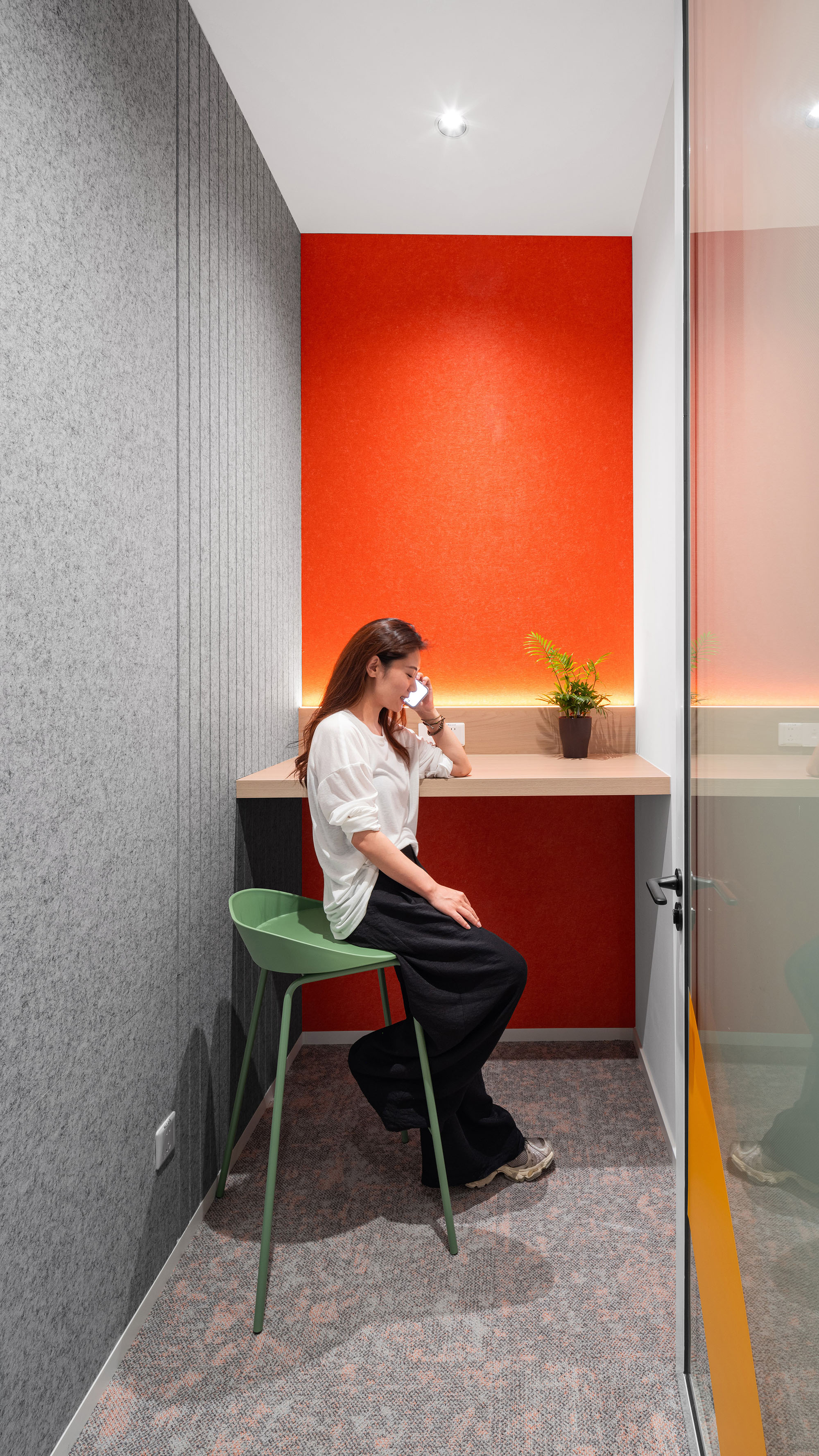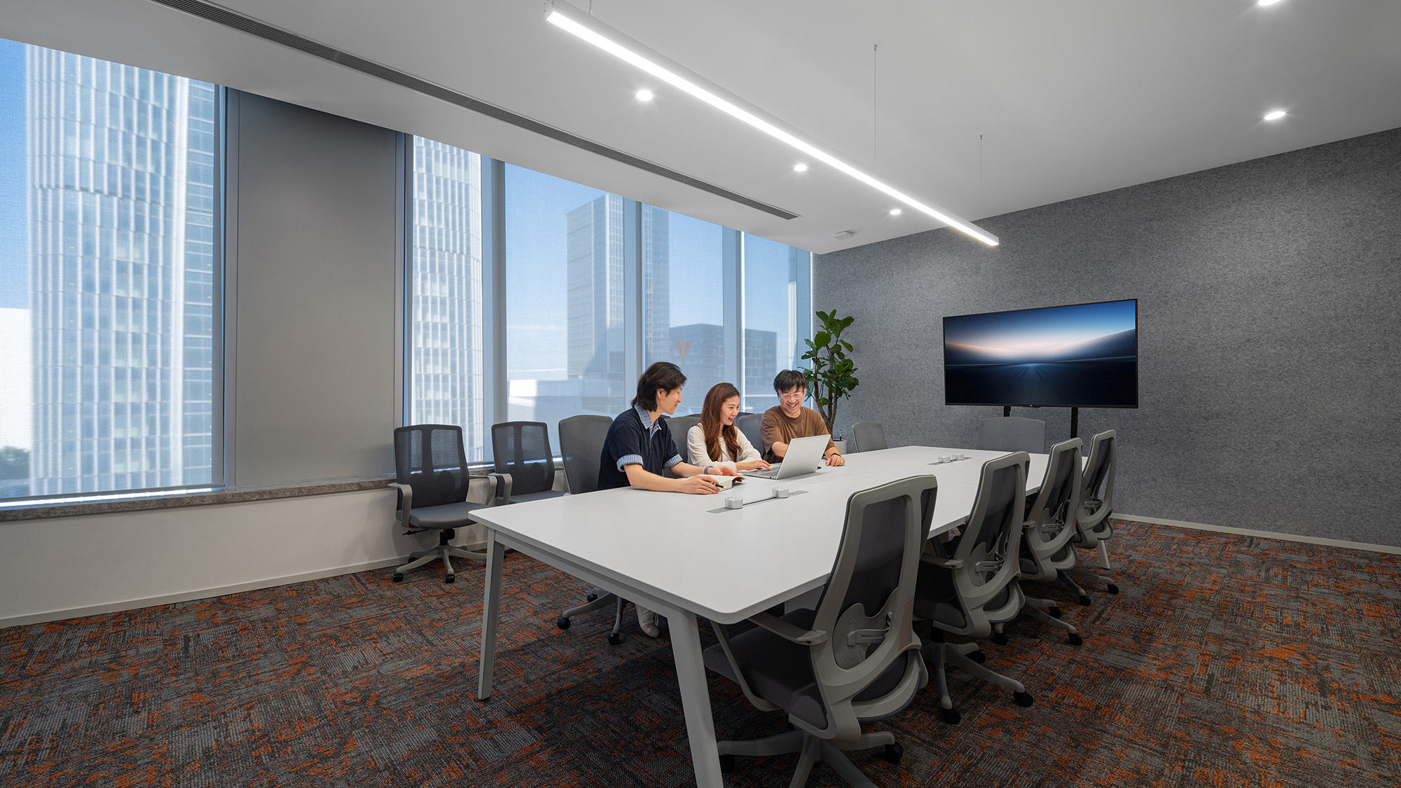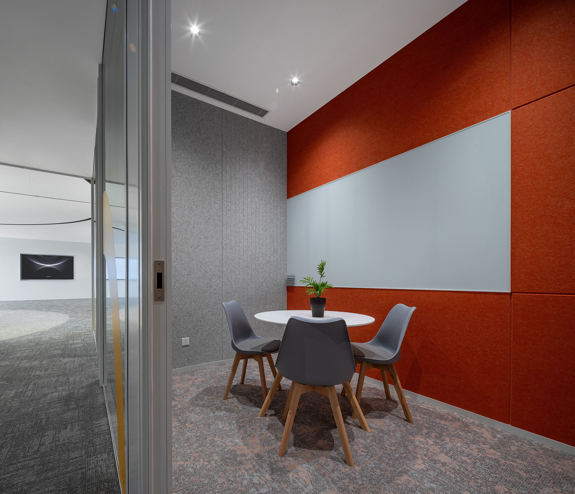 为了满足不同场景的需求,设计师在空间中规划了不同规格的会议室,既能承载大型汇报,也能满足3-5人的头脑风暴。在小型的洽谈室中,我们巧妙地将企业色融入其中,让品牌的基因在细节中自然呈现。每一次开门而入,都能感受到跳跃网络鲜明的身份符号。