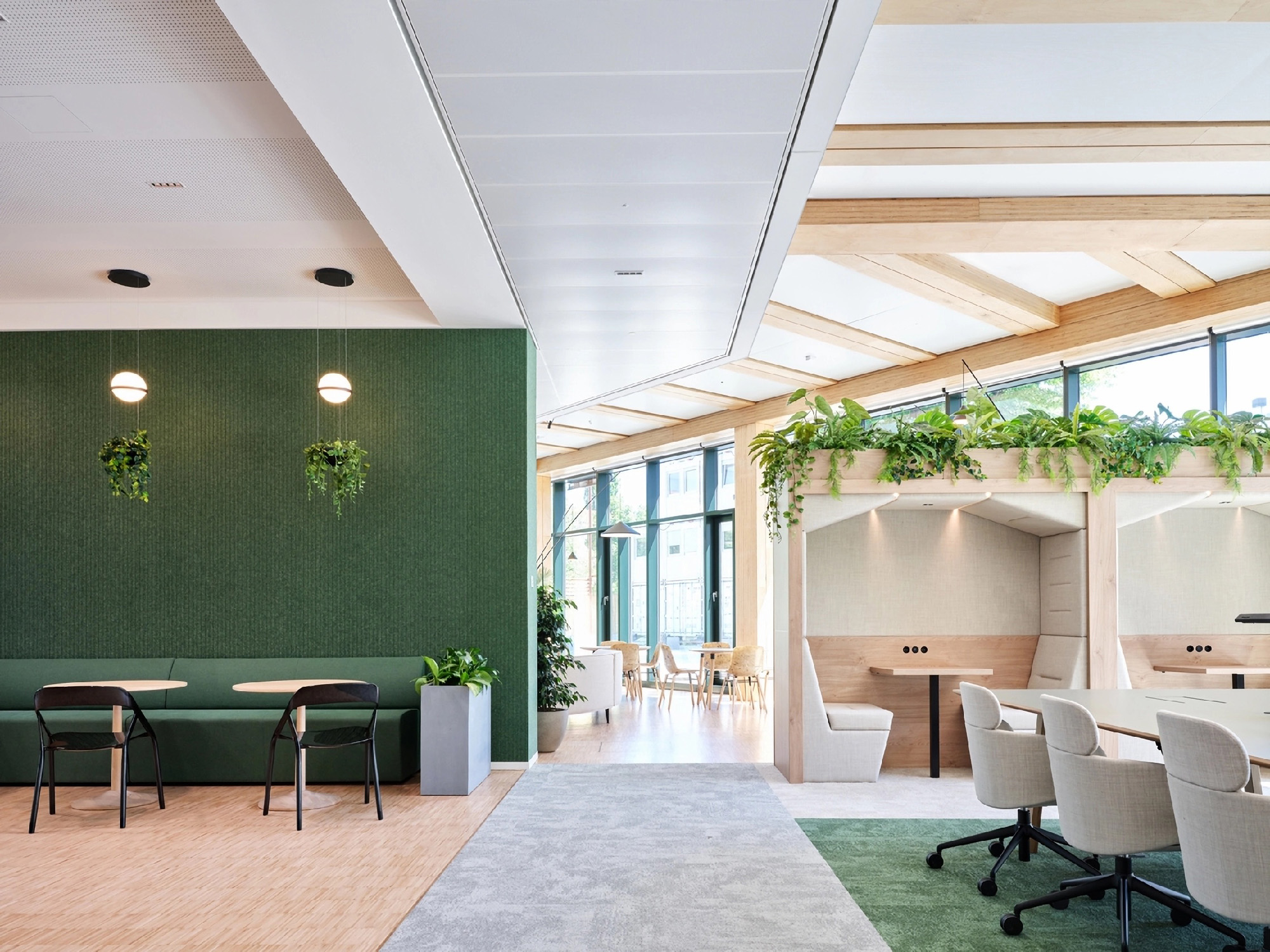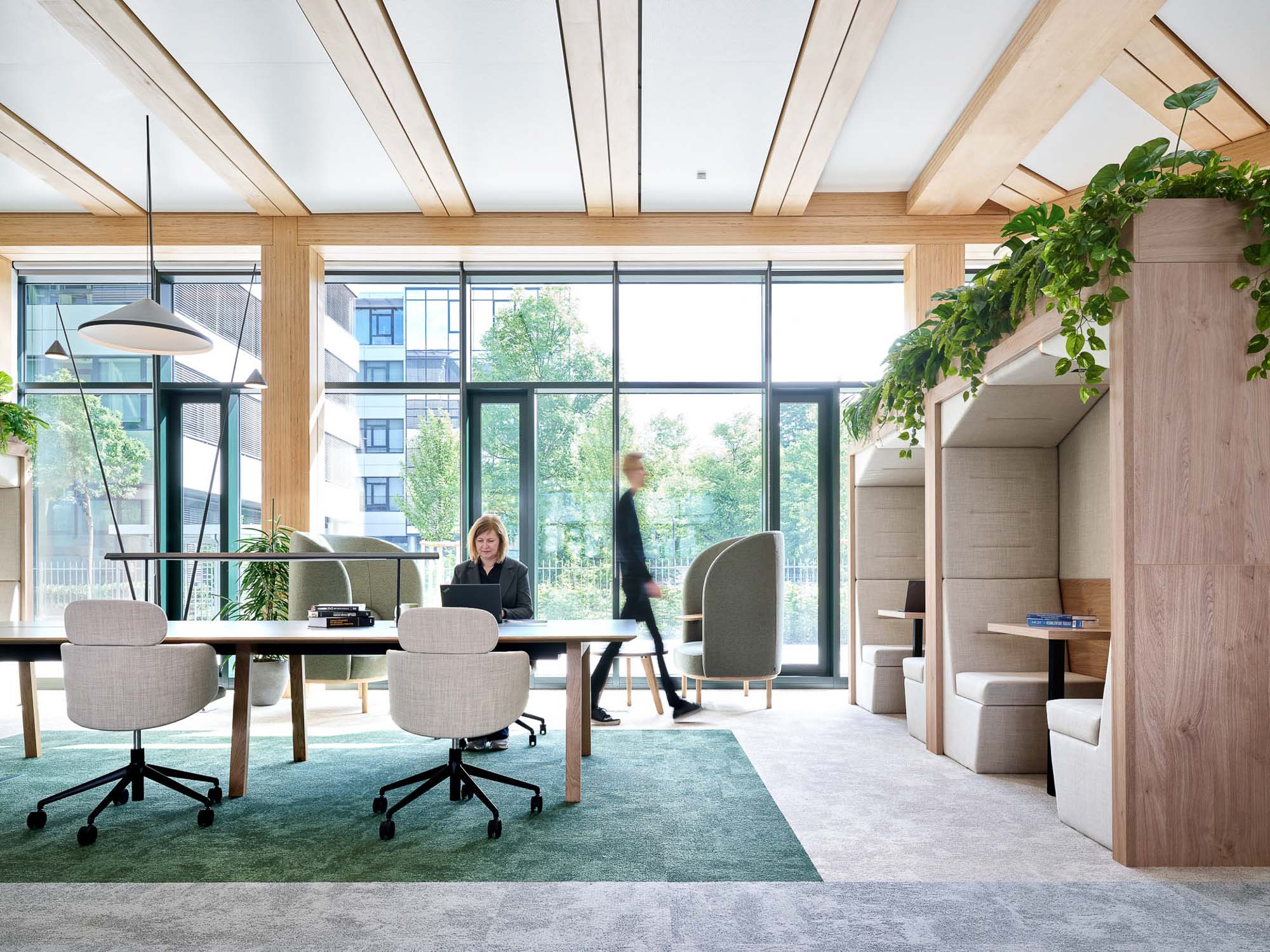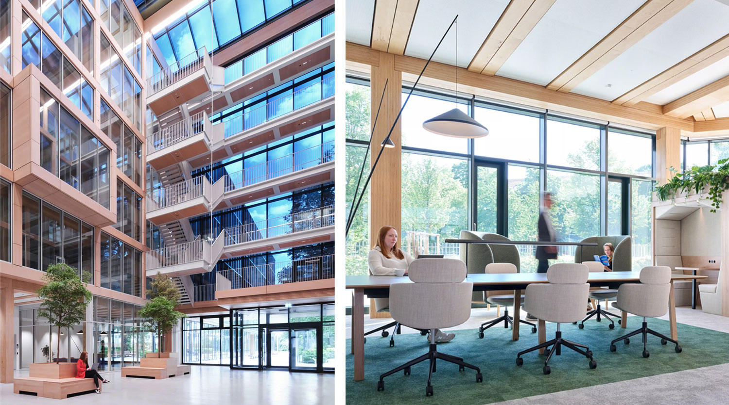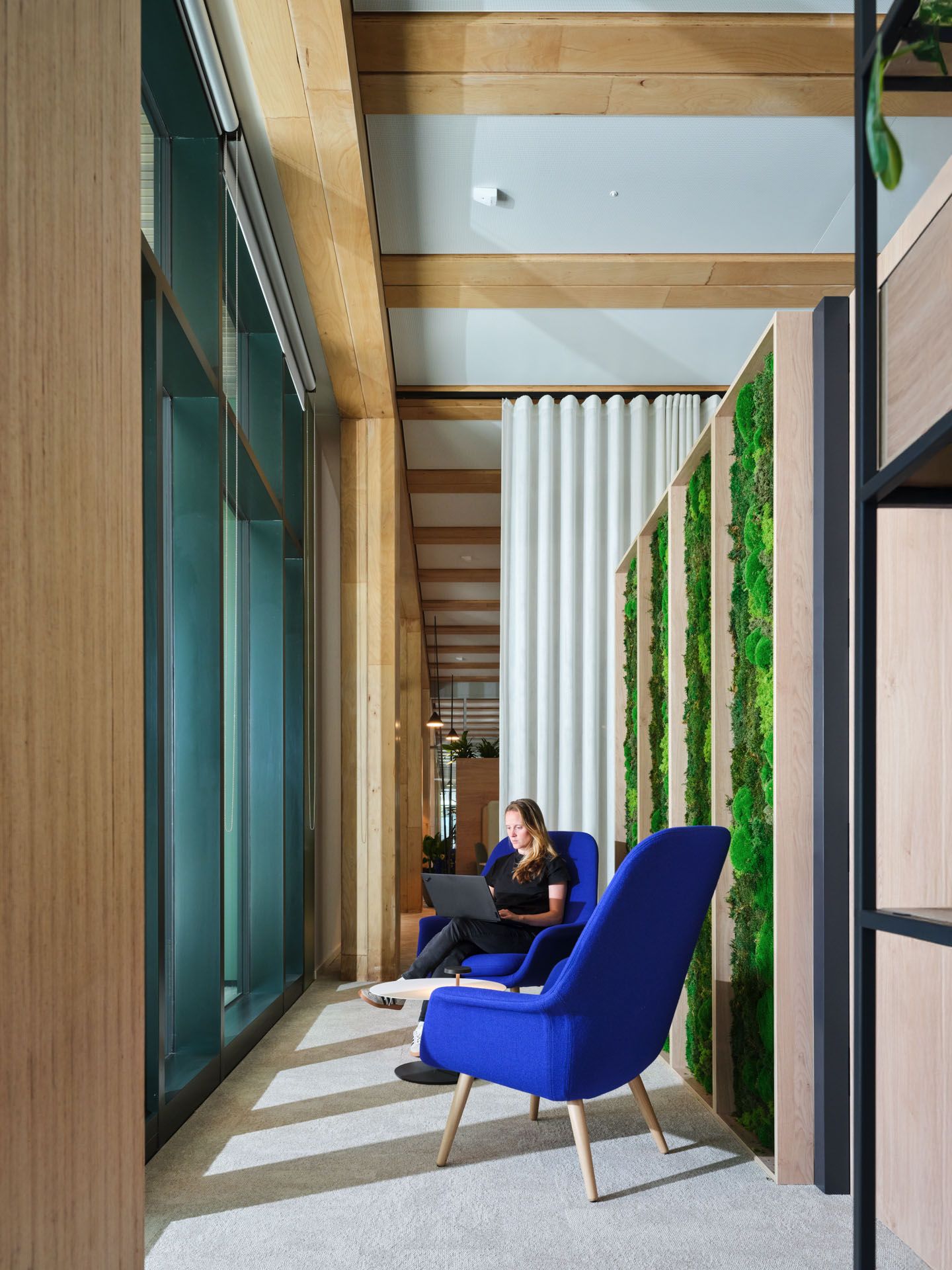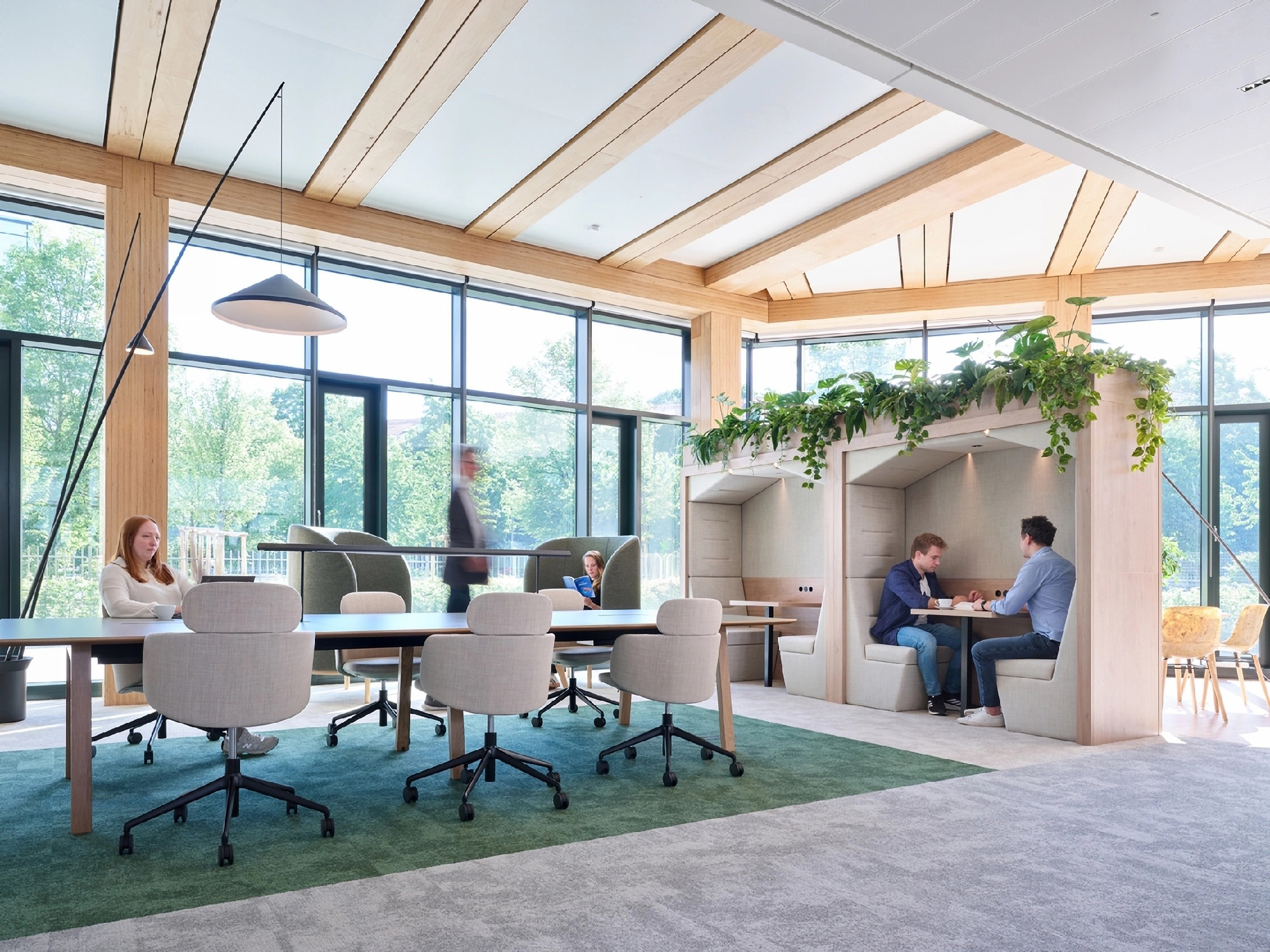 为呼应这座木结构、LEED铂金级认证建筑的高性能理念,Gensler的室内装修同样以LEED铂金级为标准,大量采用天然材质。高阔层高与通透玻璃幕墙营造出明亮开阔的空间氛围,而通过降低墙板高度、悬挂绿植花盆等尺度的精细化处理,为开放楼层注入了一份舒适的亲和感。