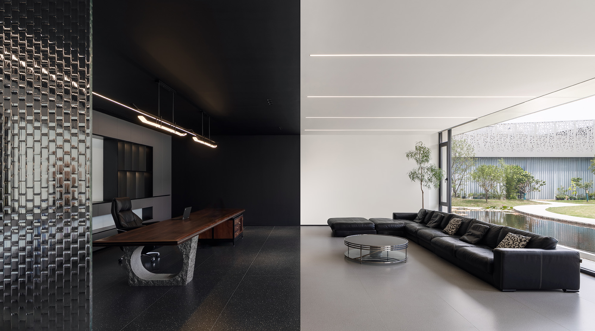 本案设计跳脱传统办公空间的桎梏,将纺织的韵律、黑调的深邃与自然的生机融为一体,打造出一个兼具高级感、功能性与精神归属的场所。