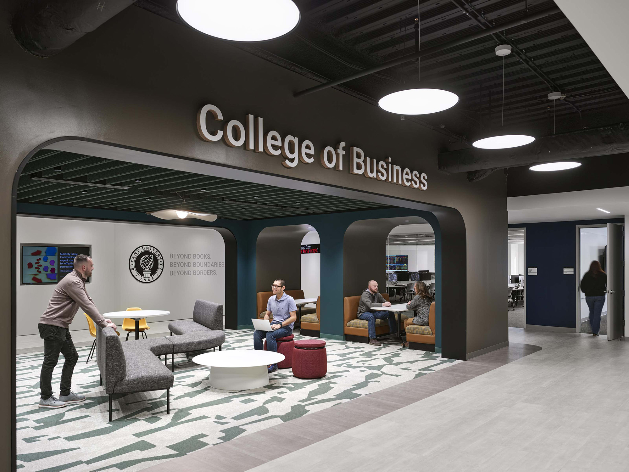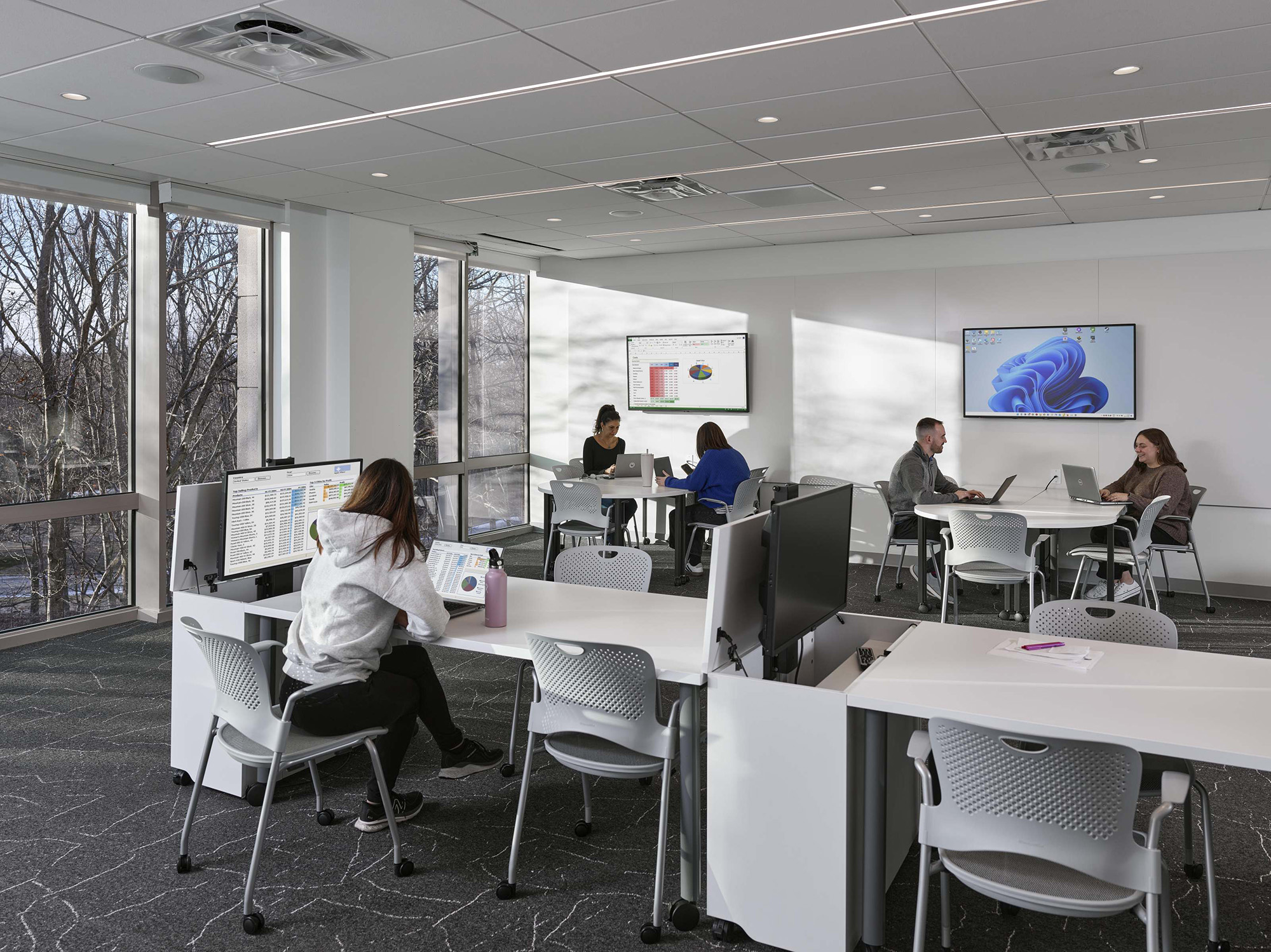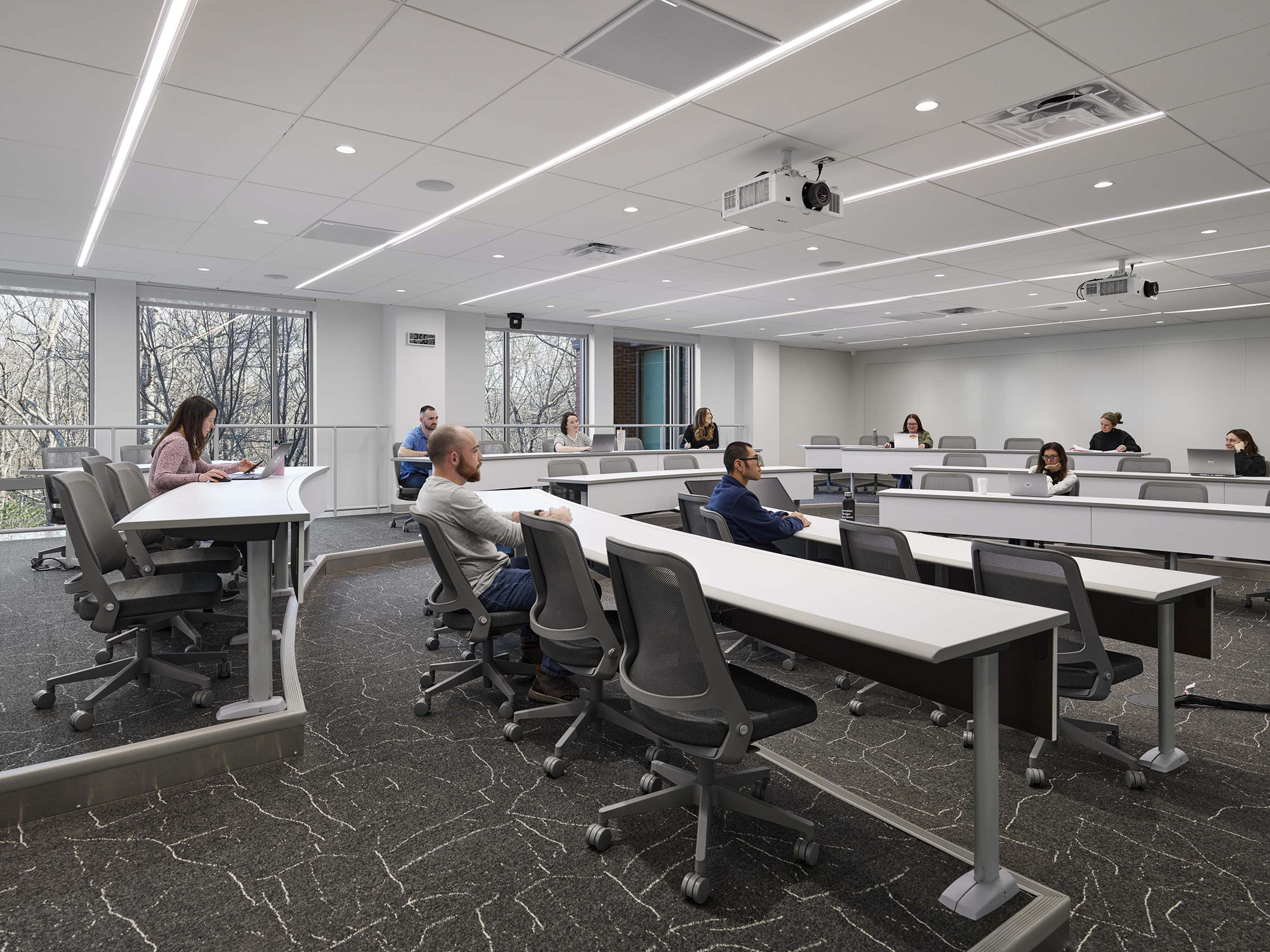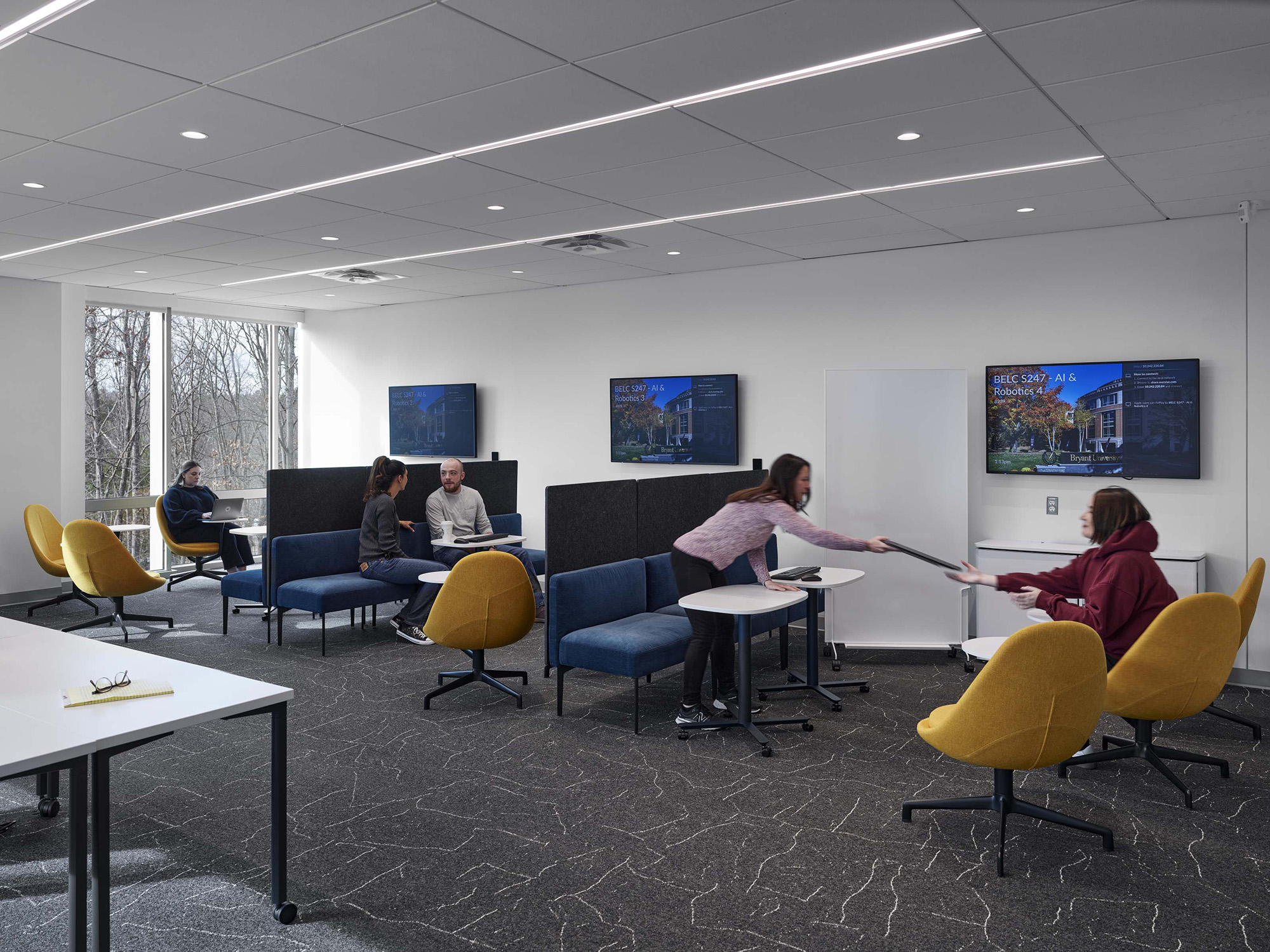 这栋由富达投资(Fidelity Investments)捐赠给大学的建筑,原内部结构包含封闭式办公空间及企业配套设施,如小型厨房、更衣室和餐厅。作为项目一期工程,设计团队将两层原办公区域改造为8,361平方米的协作式学习空间,供该大学的商学院使用。该空间配备尖端实验室,并专设AI人工智能、数据分析、设计思维及销售等特色功能区。