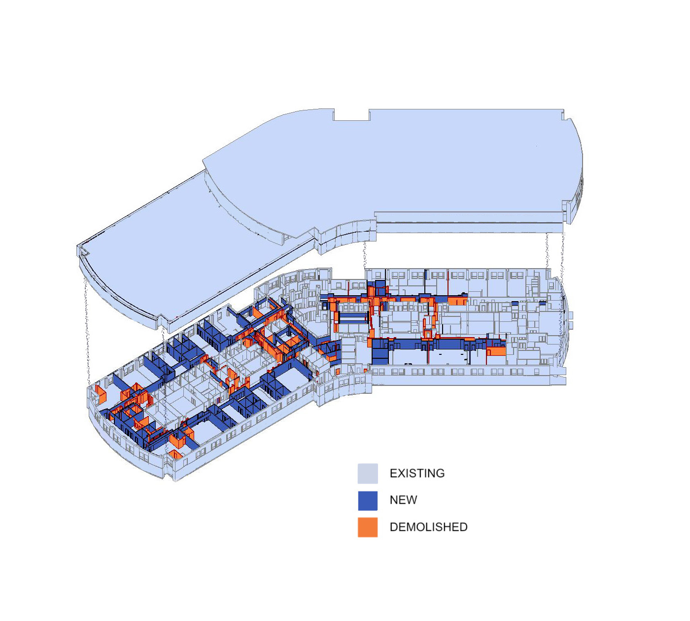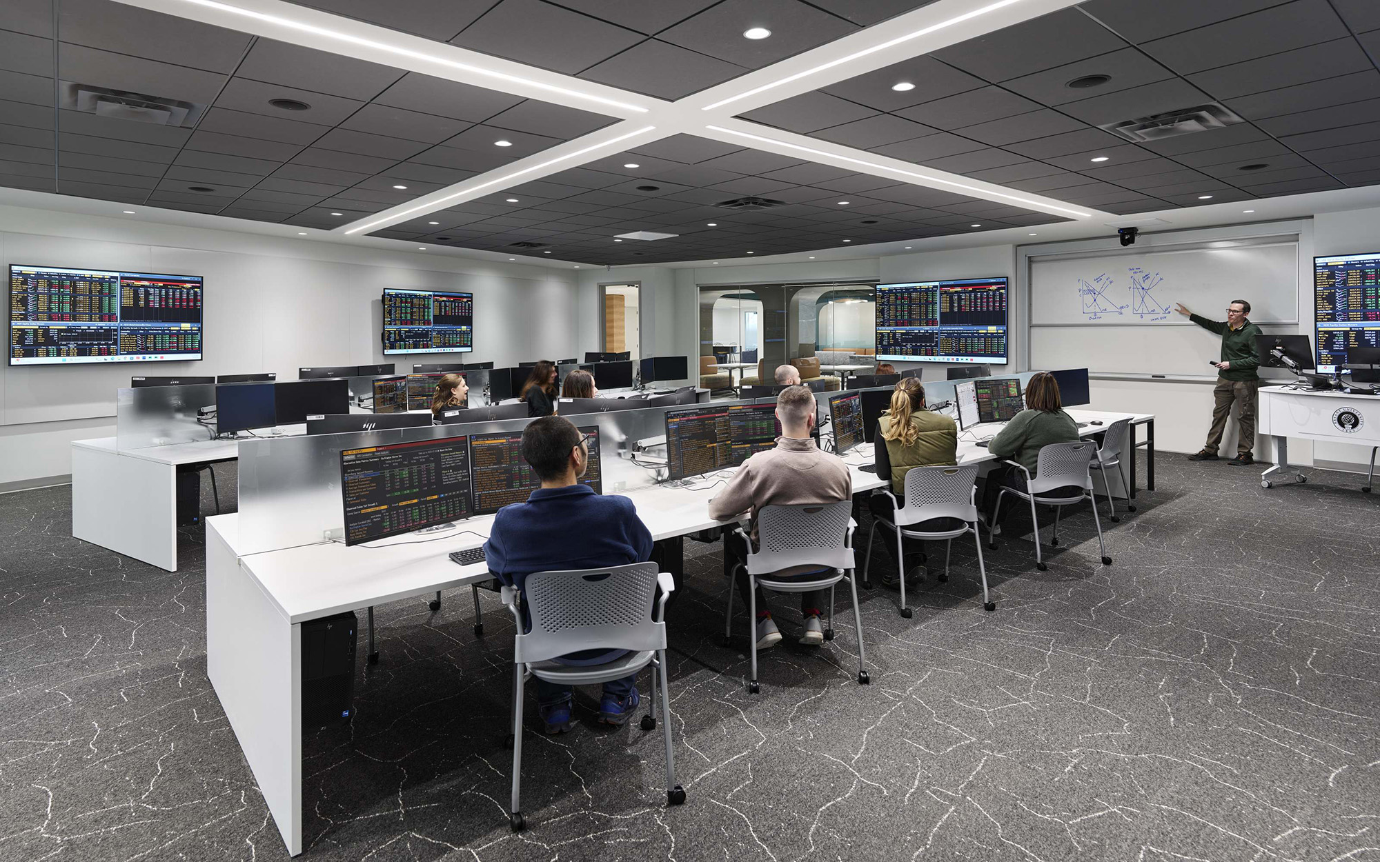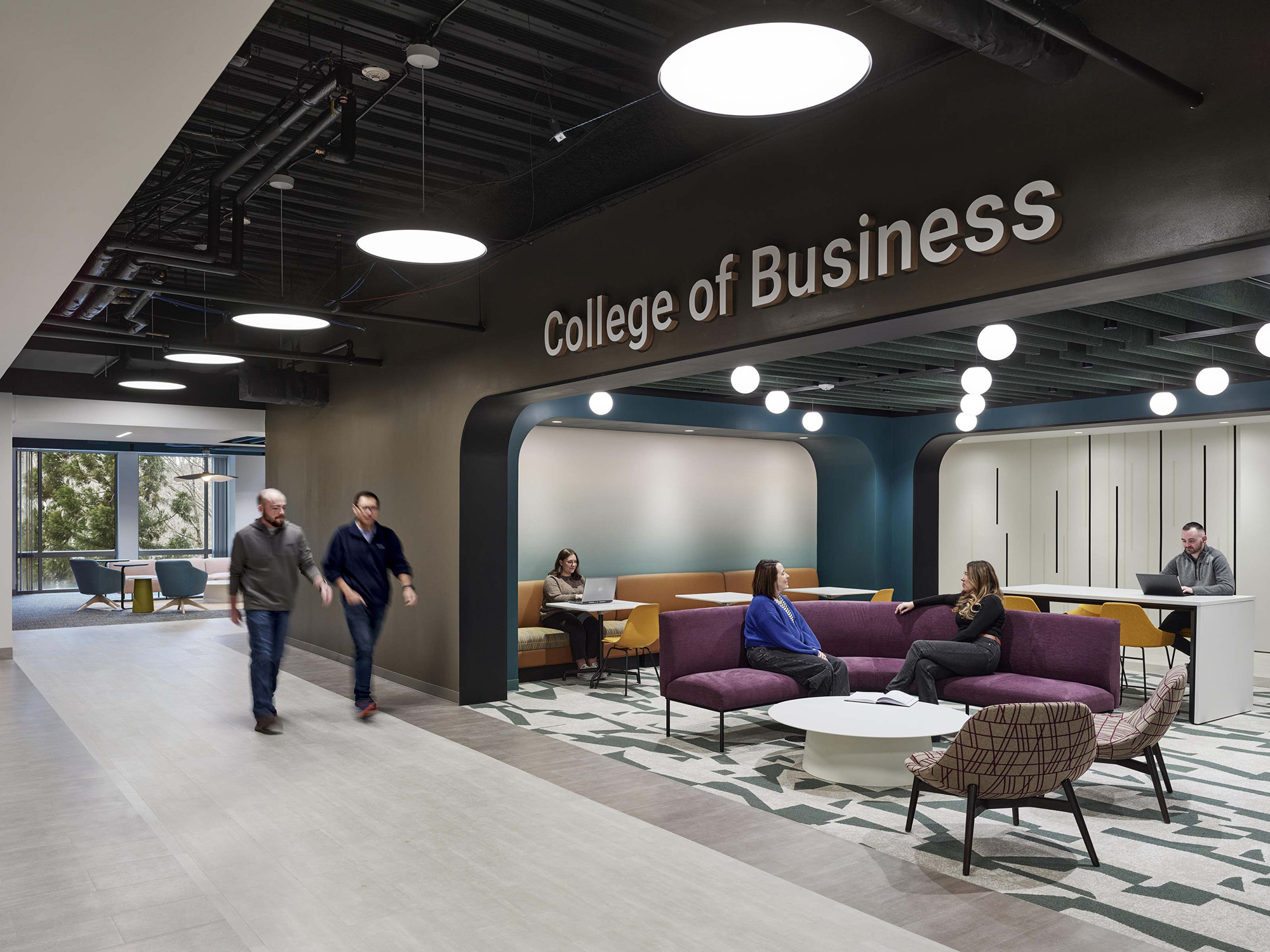 这栋由富达投资(Fidelity Investments)捐赠给大学的建筑,原内部结构包含封闭式办公空间及企业配套设施,如小型厨房、更衣室和餐厅。作为项目一期工程,设计团队将两层原办公区域改造为8,361平方米的协作式学习空间,供该大学的商学院使用。该空间配备尖端实验室,并专设AI人工智能、数据分析、设计思维及销售等特色功能区。