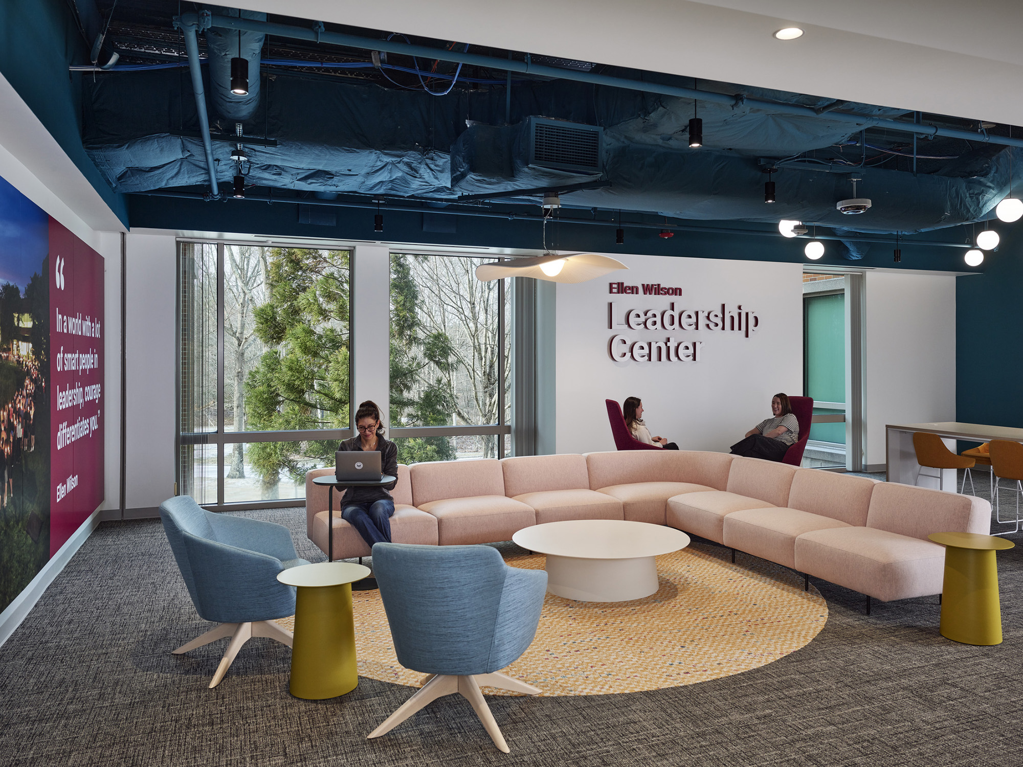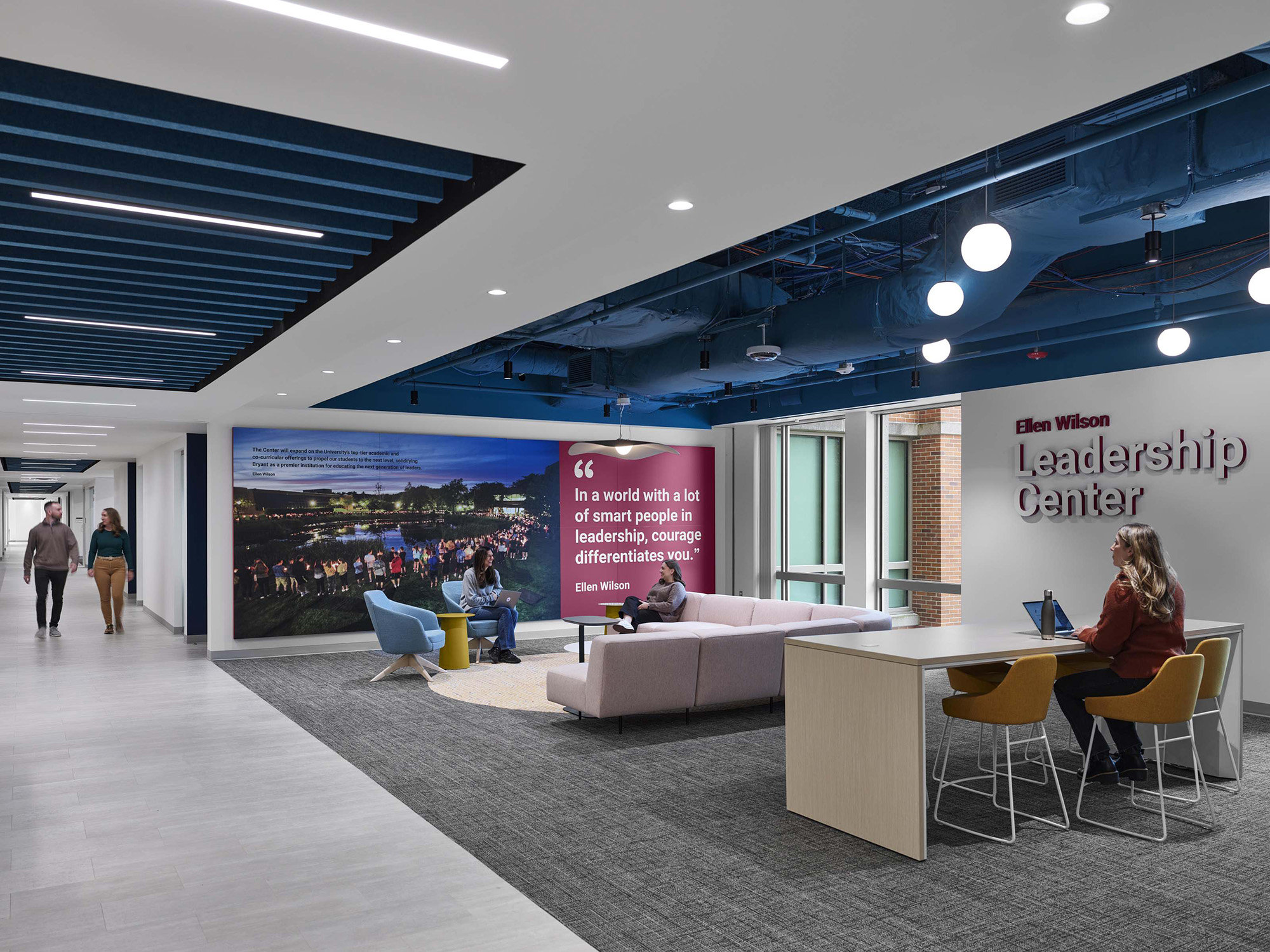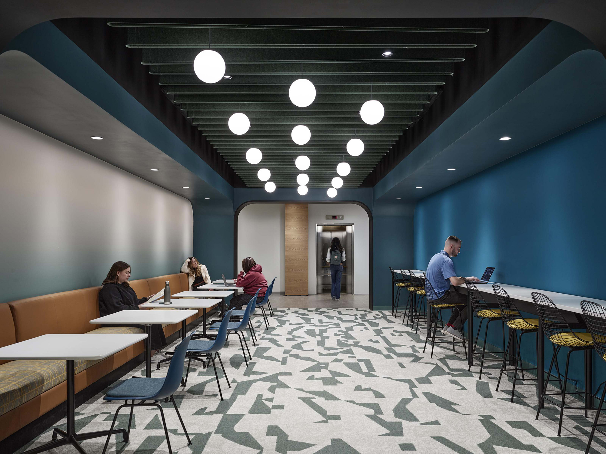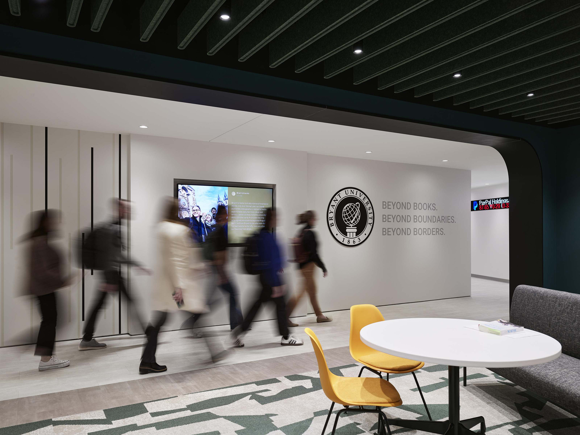 设计团队将健康福祉作为核心考量,通过开放式空间规划最大化引入自然景观与户外视野。此外,精心策划的环境图形设计既提升了空间美感,又实现了导视功能,更将该项目与布莱恩特大学整体校园有机相连。