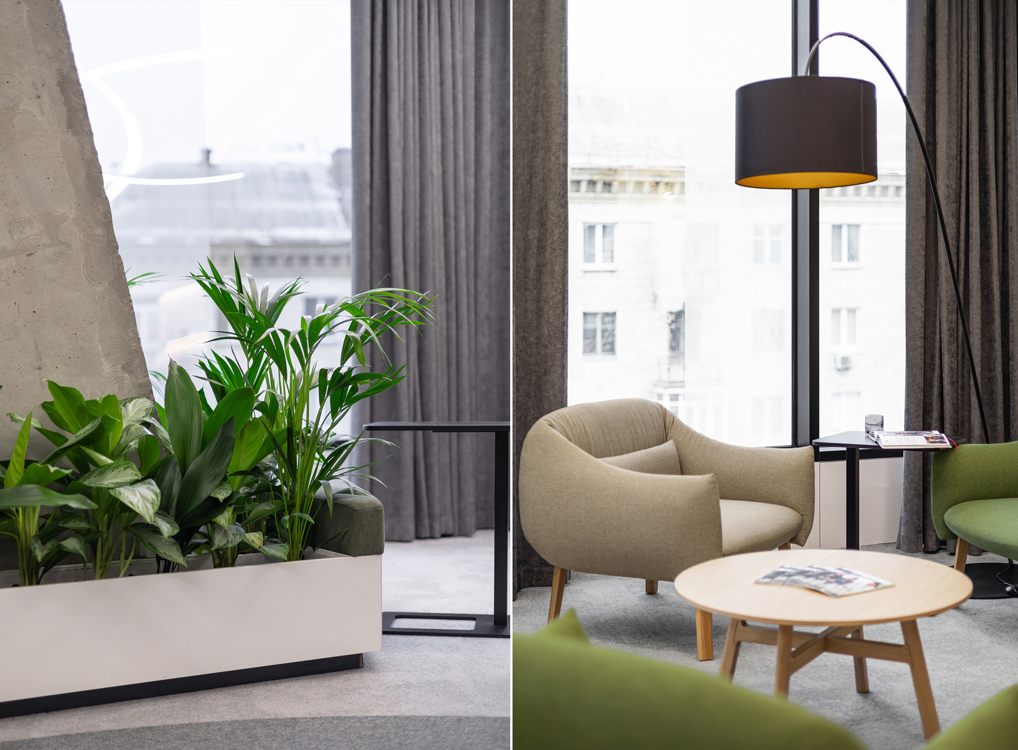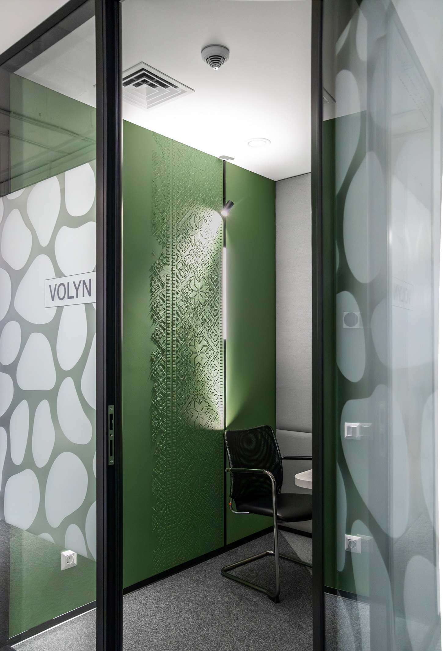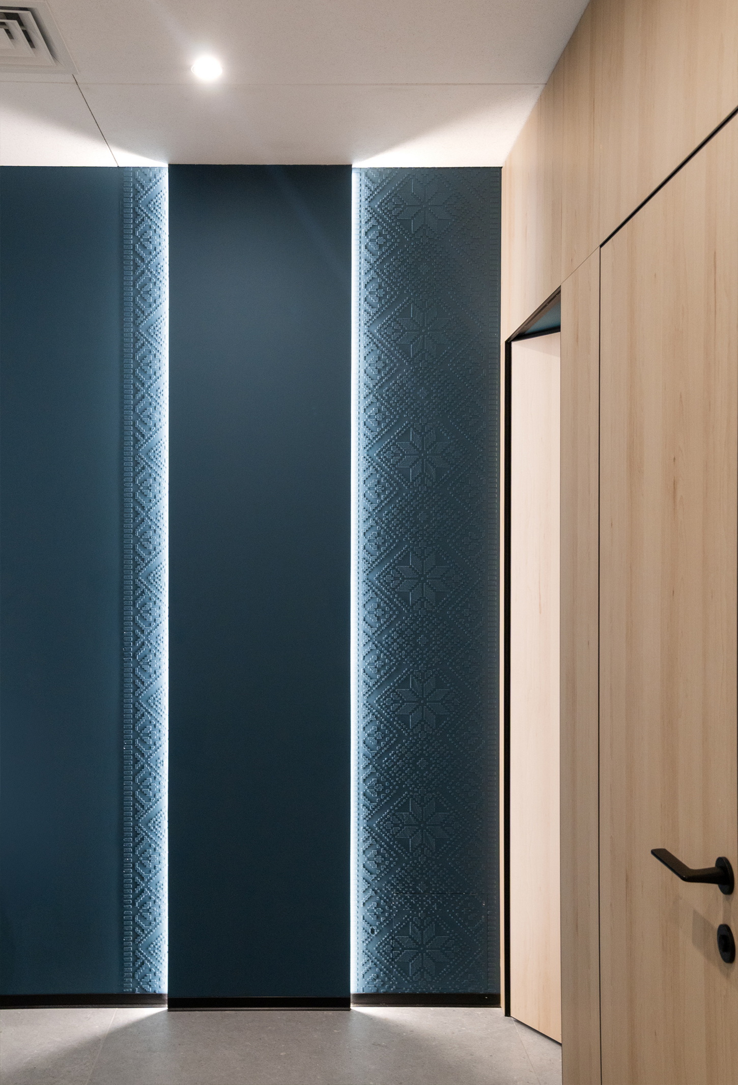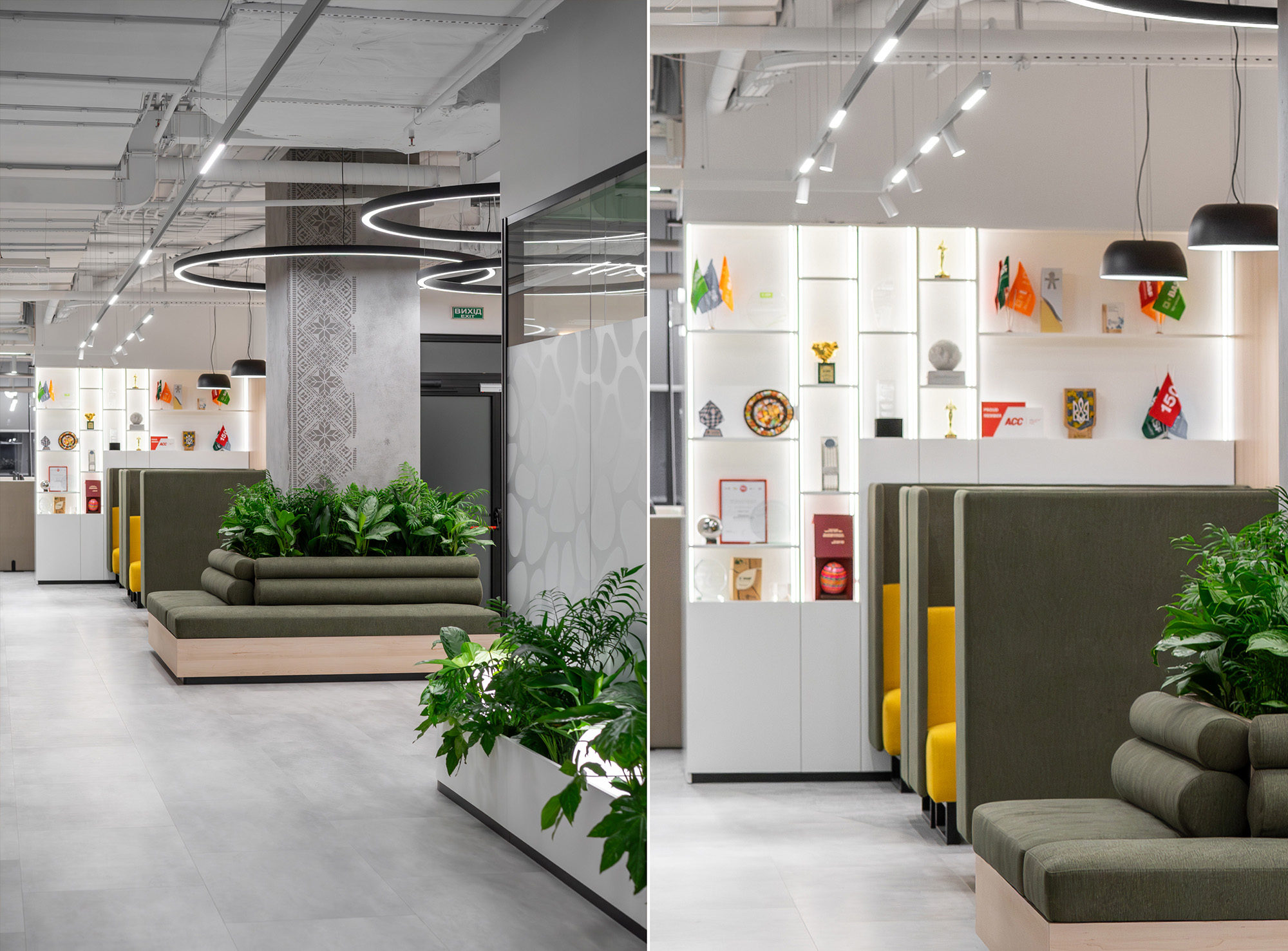 动线路径清晰合理,既确保动线顺畅亦促进自然光线分布。色彩点缀取自巴斯夫企业色系,通过织物与平面元素微妙呈现。乌克兰设计师的小型装饰细节与艺术陈设为空间注入在地语境,以含蓄笔触传递真实质感。
