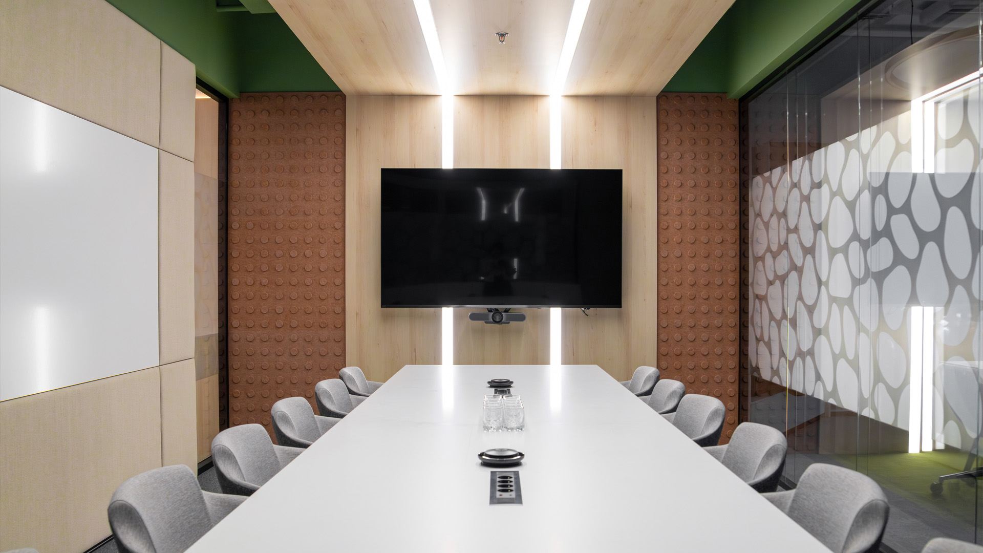 前台区域简洁而实用——利落的线条、温润的木面材质与精心调控的照明,共同营造出专业而不失亲切的初印象。会议室配备现代音频系统与吸音吊顶,确保声音清晰度与空间舒适度。