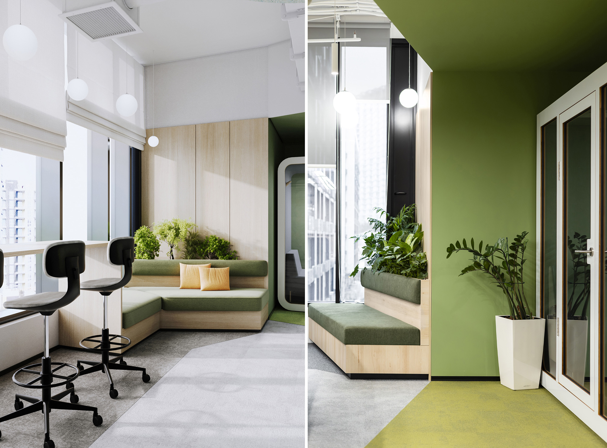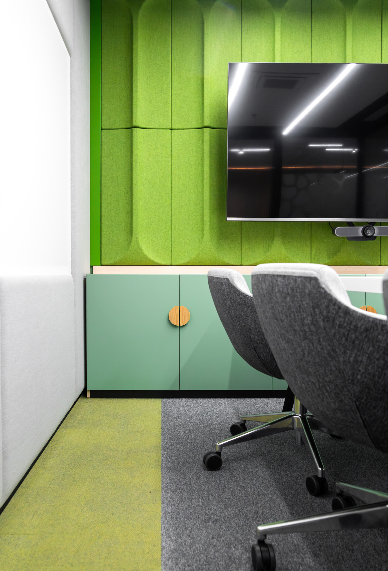 空间布局融合开放式工作区与封闭式会议区及专注工作区。开放式区域通过绿植造景与吸音板进行划分,形成视觉韵律与声音控制。多个不同尺度的会议室满足灵活协作需求,静音舱则为专注工作与私密交流提供专属空间。