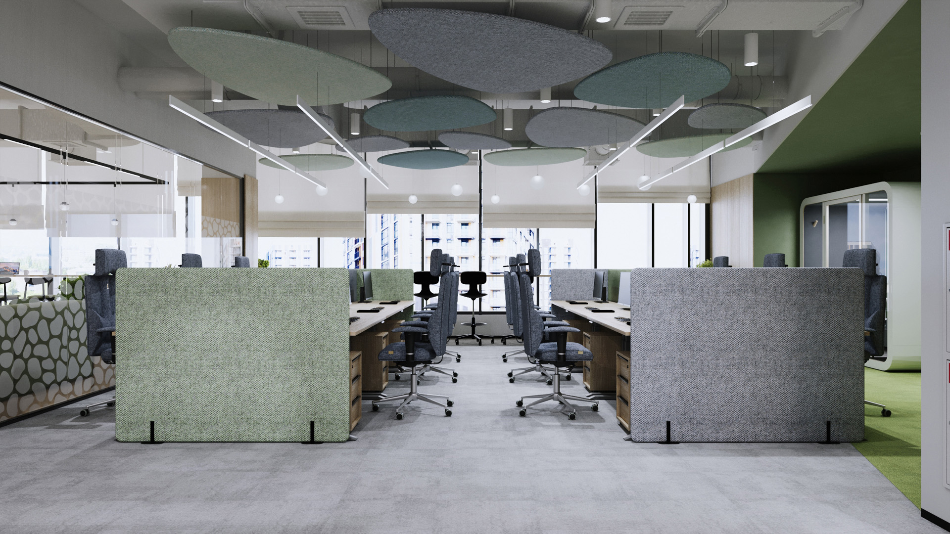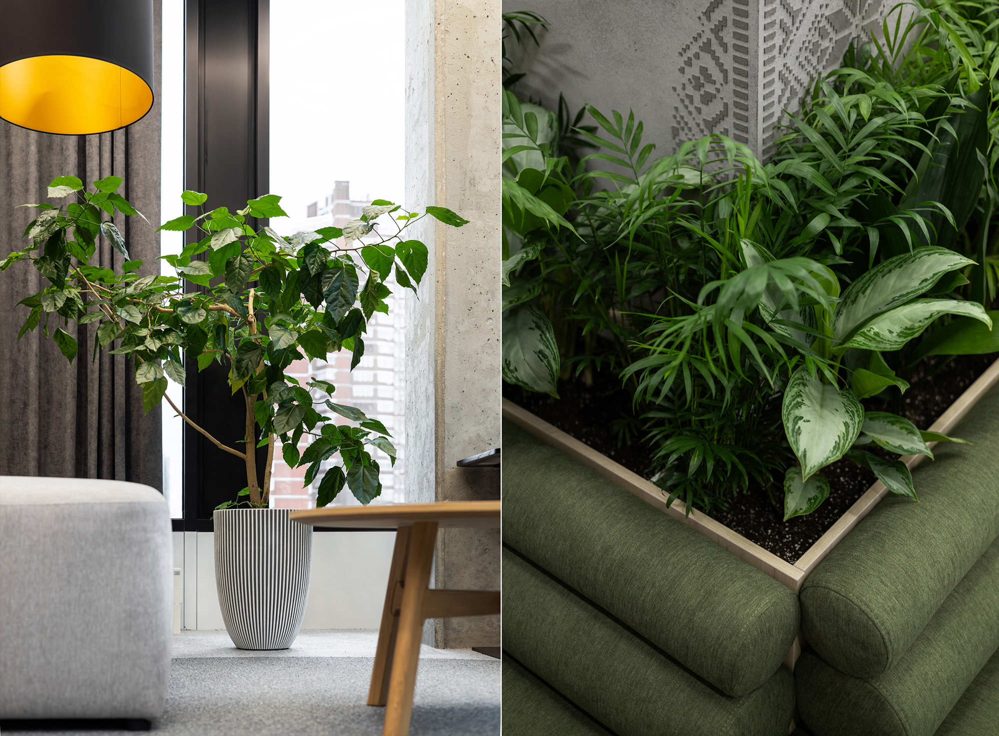 天然材质如木材、混凝土与织物奠定了整体空间的平衡基调。中性柔和的配色中,绿植既作为装饰又承担区域划分功能。植物被巧妙融入隔断与家具中,既优化声学效果,又为视觉构图增添恰到好处的舒适感。