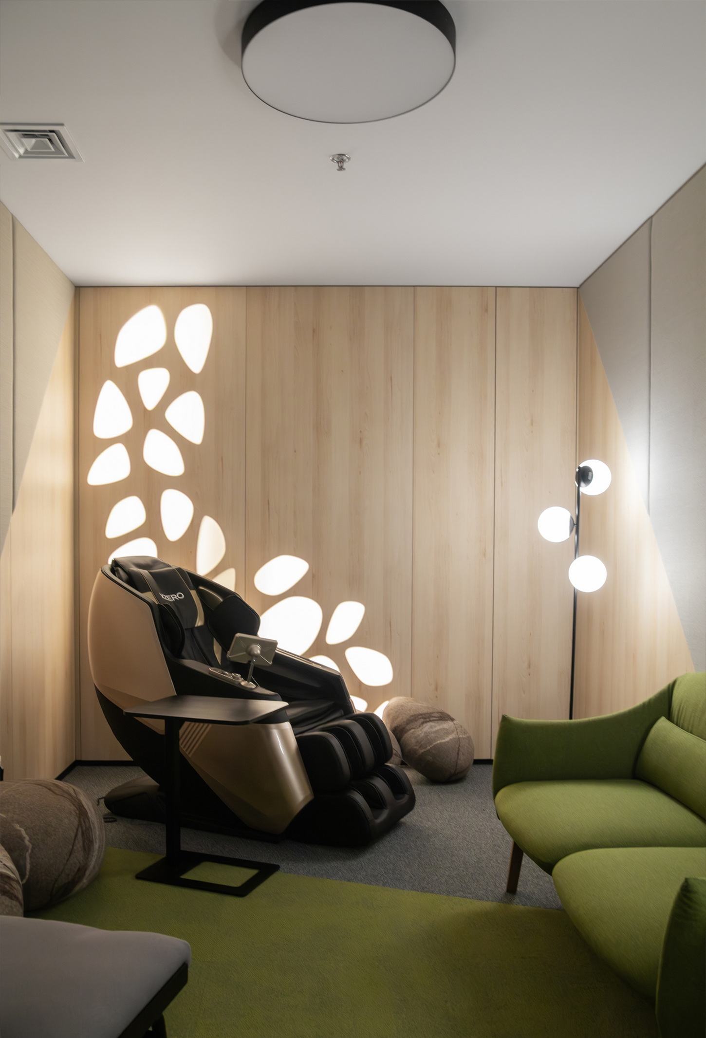 厨房与休闲区构成办公室的社交枢纽。木质隔断赋予空间灵活可变性,既能满足日常小憩,亦可适应团队活动需求。材质选择兼顾实用与耐久性,照明设计在保留居家般温馨感的同时,亦不失功能考量。