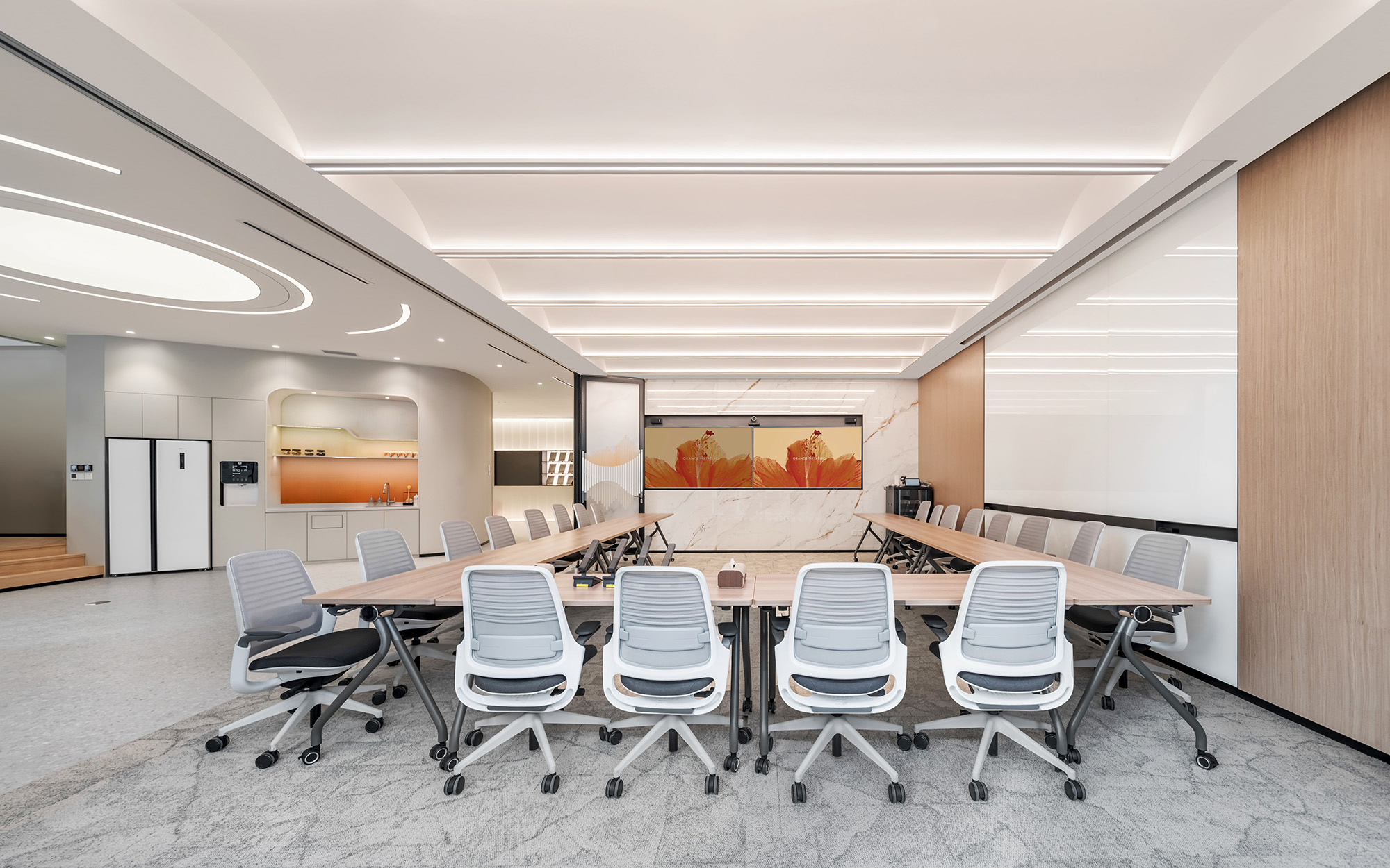 当然,企业同样需要具备应对大型会议与活动的能力。为此,在公共区域特别设置了一间配备活动隔断的大型会议室,使其具备高度灵活的场景适应性。当玻璃隔断闭合时,它是一个独立且专注的会议空间;而当隔断打开,会议室便能与相邻的休闲区及楼梯台阶区域连为一体,瞬间扩展为可容纳近百人的开放式复合场地,轻松支持沙龙、分享会等各类小型活动。这不仅是一间会议室,更是一个能够伴随企业共同成长的灵动舞台。