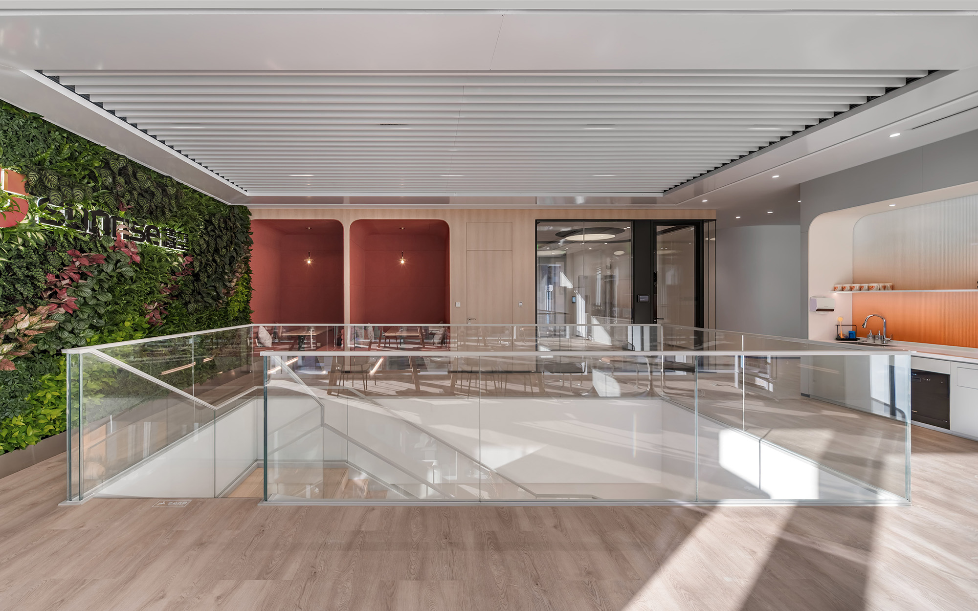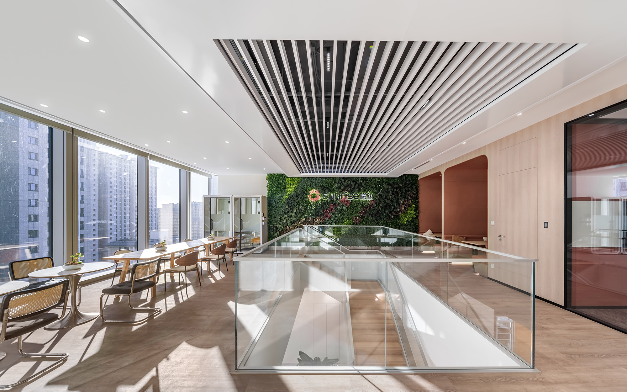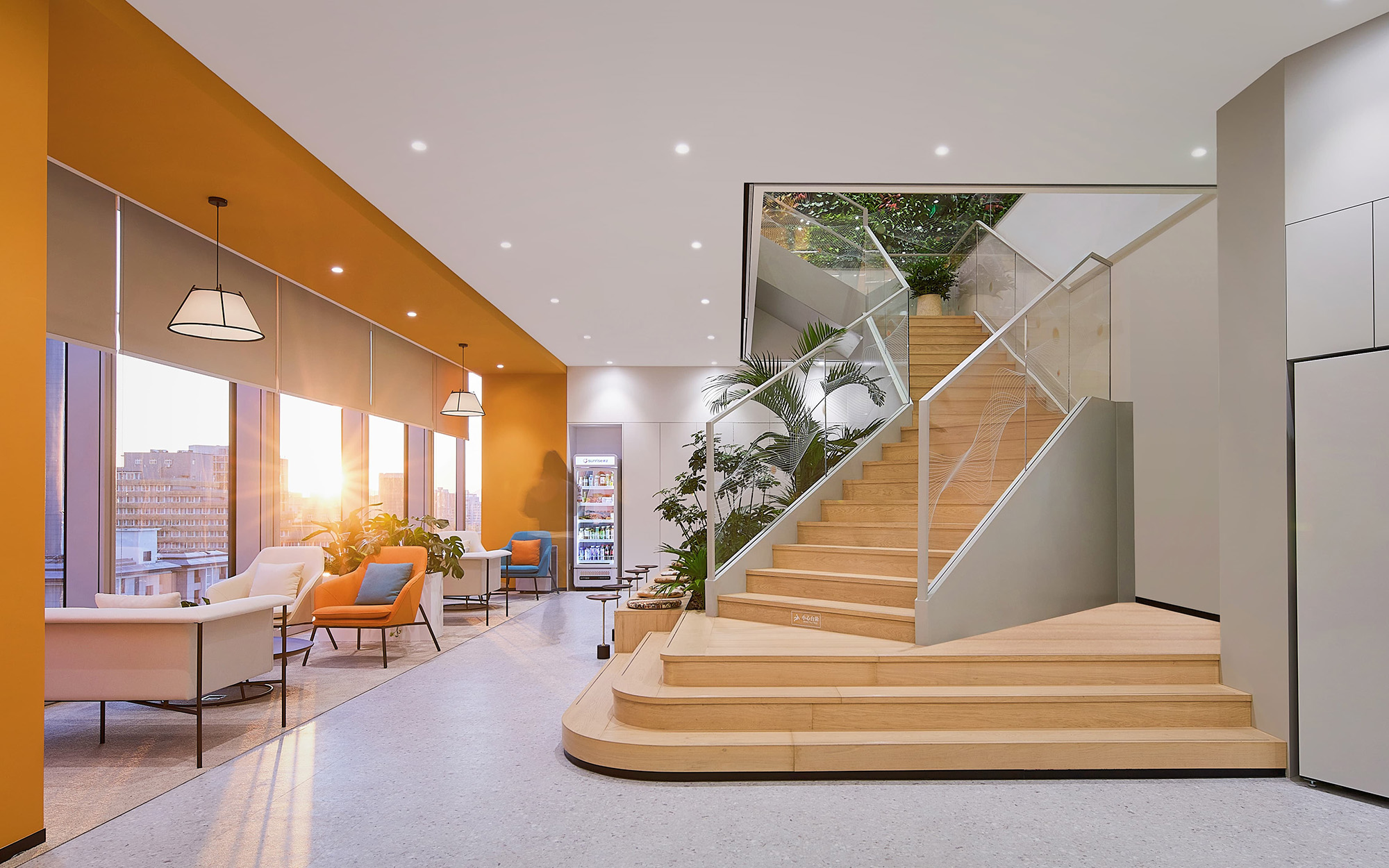 在色彩运用上,“曦望橙”作为品牌色被点缀于休闲区与茶水间,为整个空间注入活力,既彰显出积极向上、蓬勃生机的品牌个性,也寓意企业如朝阳般冉冉升起。