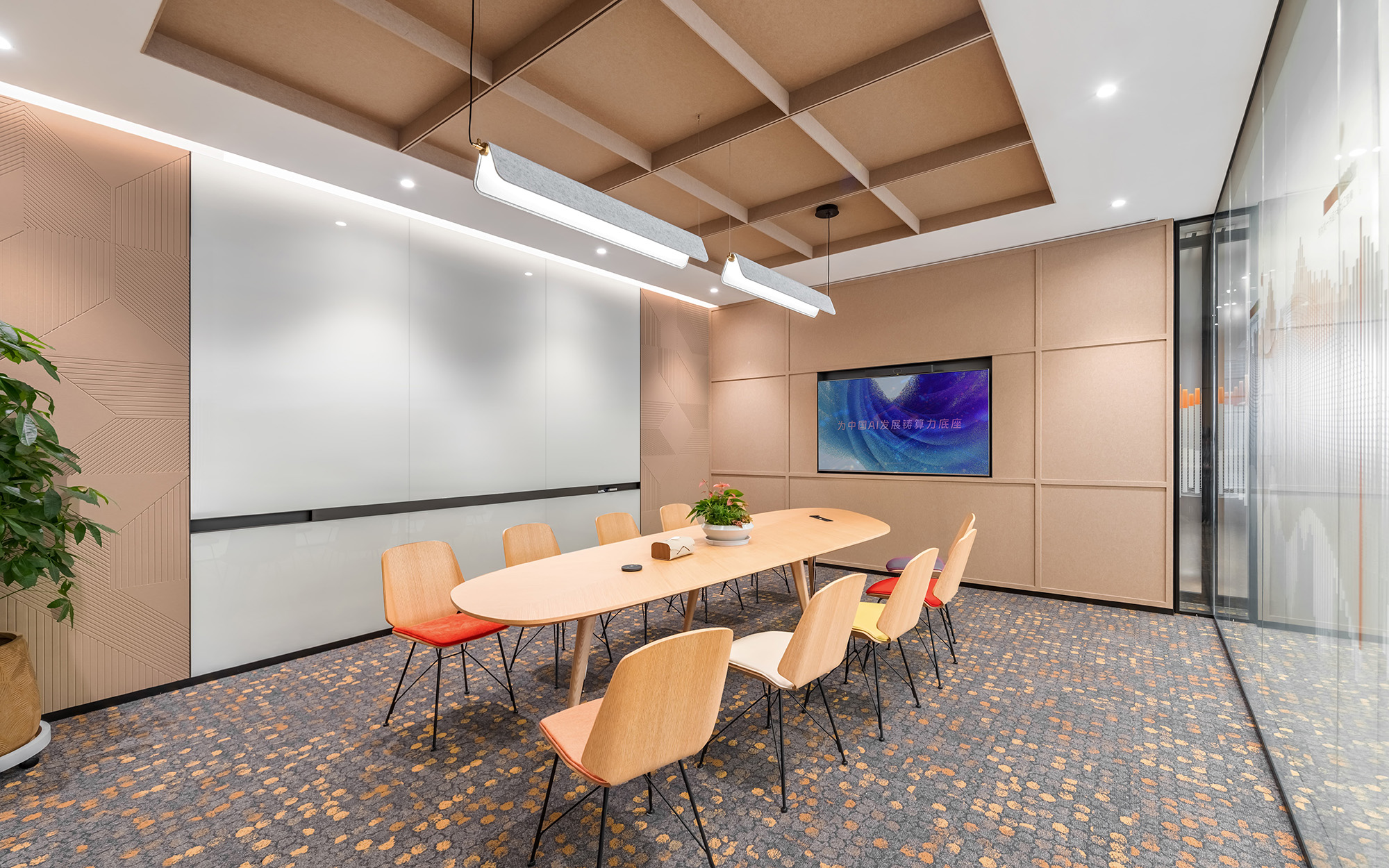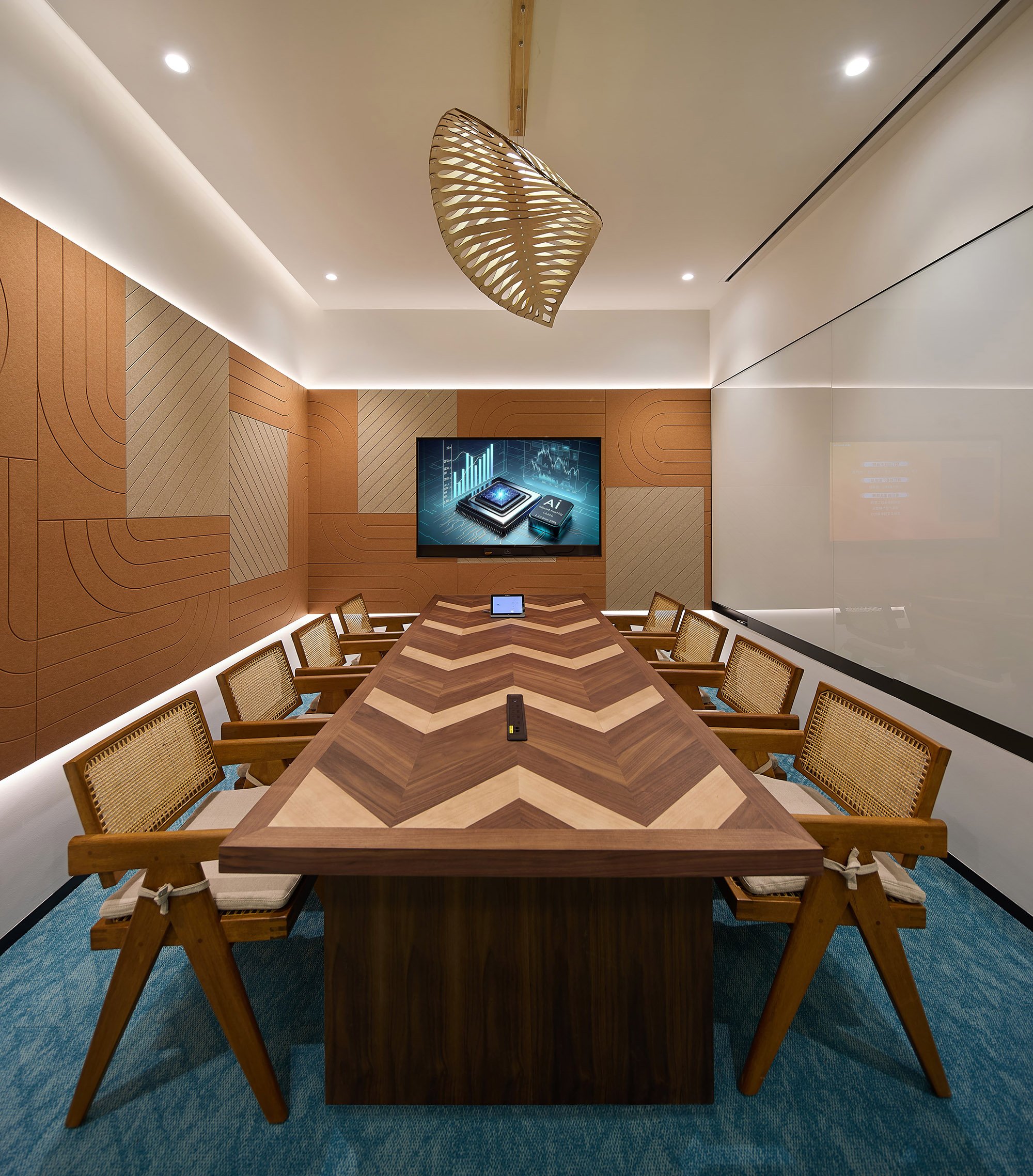 设计元素方面,从芯片金属线路中汲取灵感,将其形态融入会议室吸音板的纹理之中;接待室则采用木质条纹打造企业背景墙,通过形状、色彩与寓意的结合,实现科技与人文、理性与感性的和谐统一。整体空间既富有现代感,又不失温度,展现出企业致力于以智能科技为基石,携手用户共创美好未来的坚定愿景。