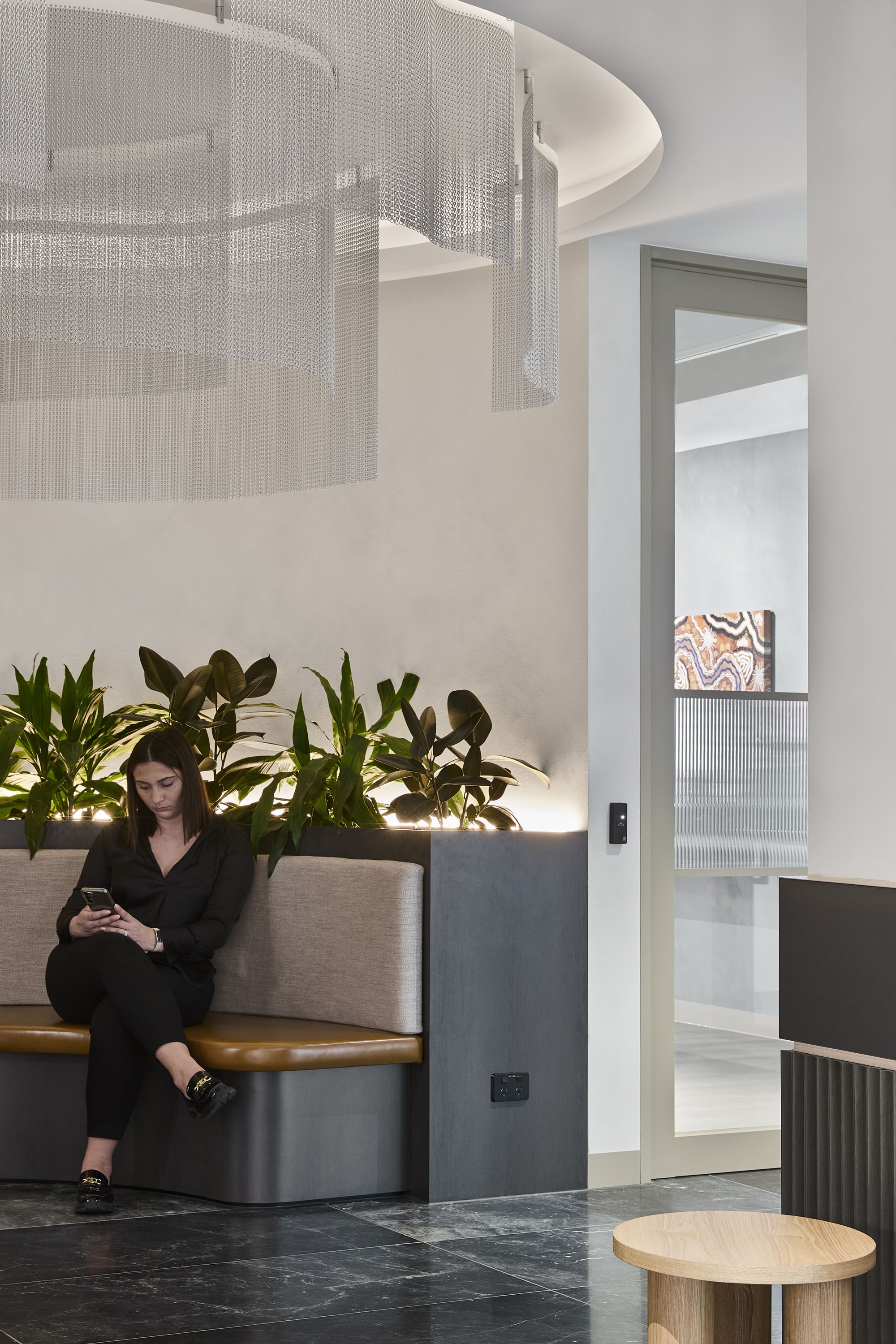 整个设计如同一首层次丰富的叙事诗,它既致敬原住民Wurundjeri族的传统,又融汇了墨尔本充满活力的都市气质,更彰显出KBR 的协作精神。定制的细木工制品勾勒出 Birrarung 河的流淌脉络,照明灯具让人联想起编织的渔篮,触感丰富、本地采购的材料则将空间牢牢锚定于真实性与场所联结之中。