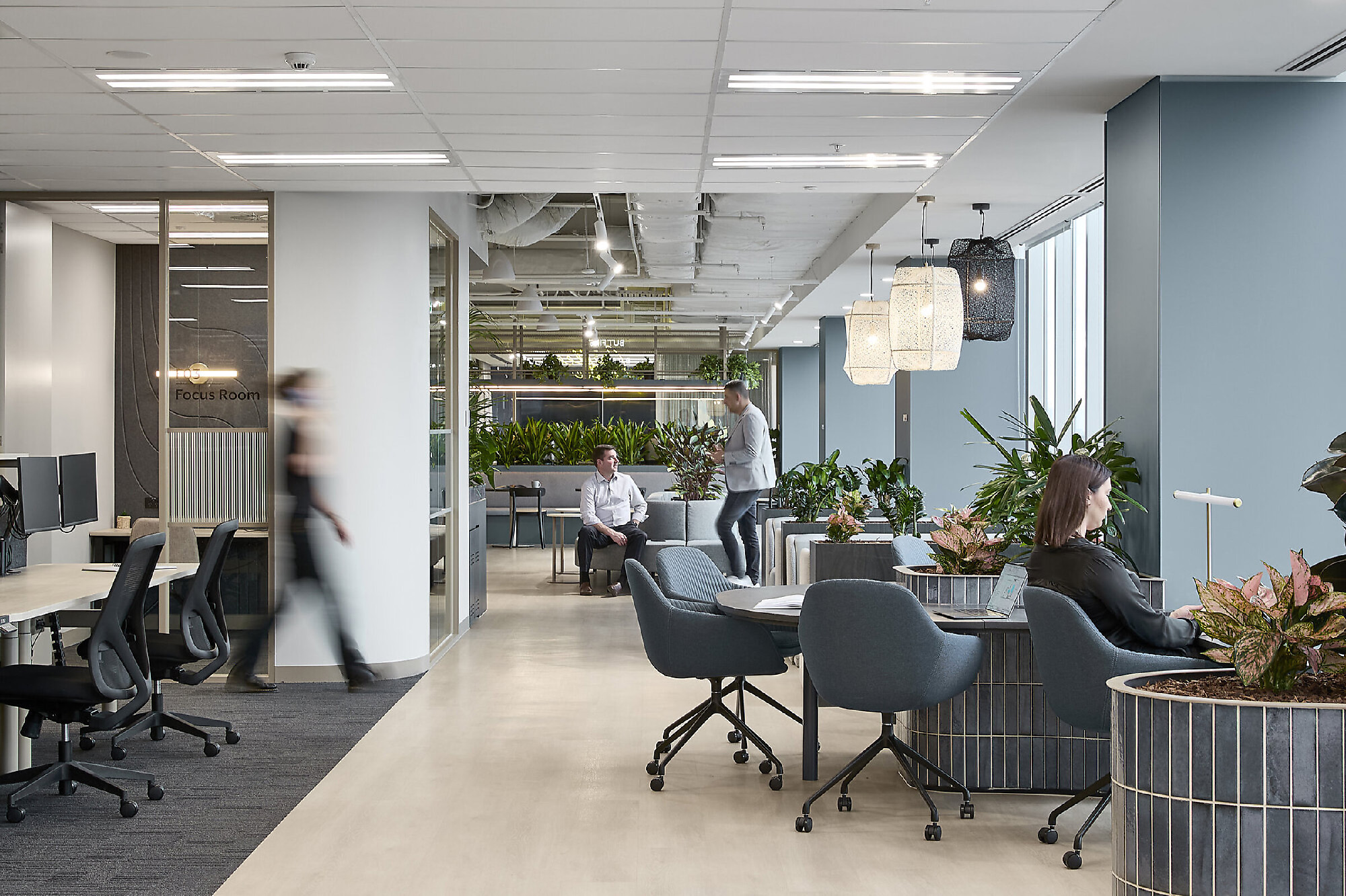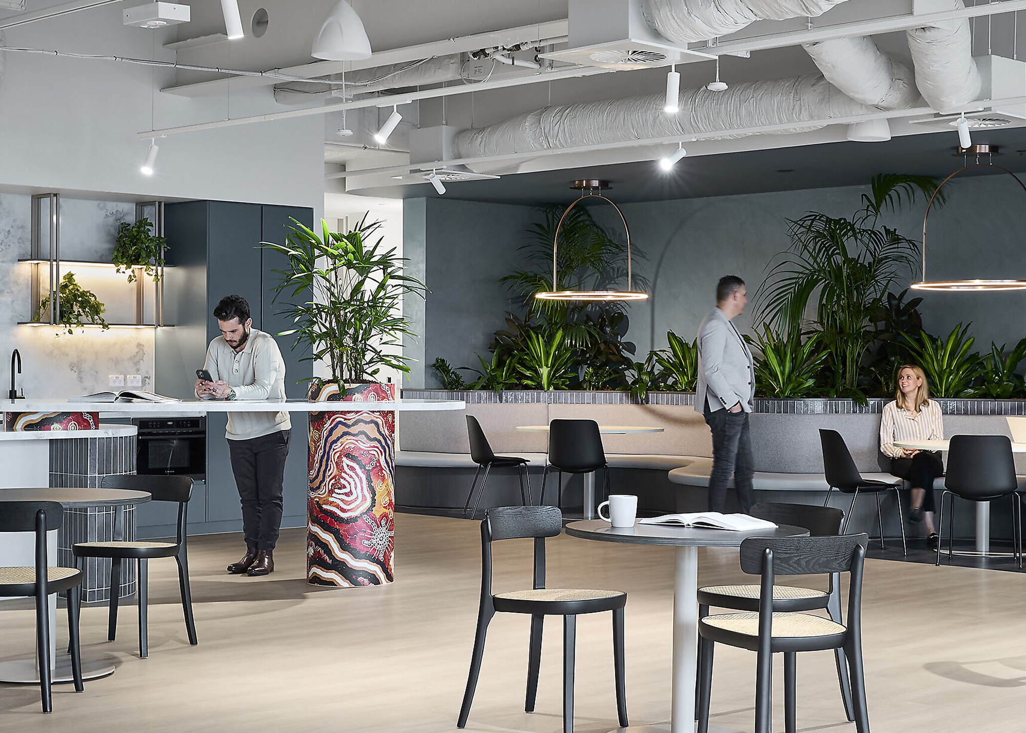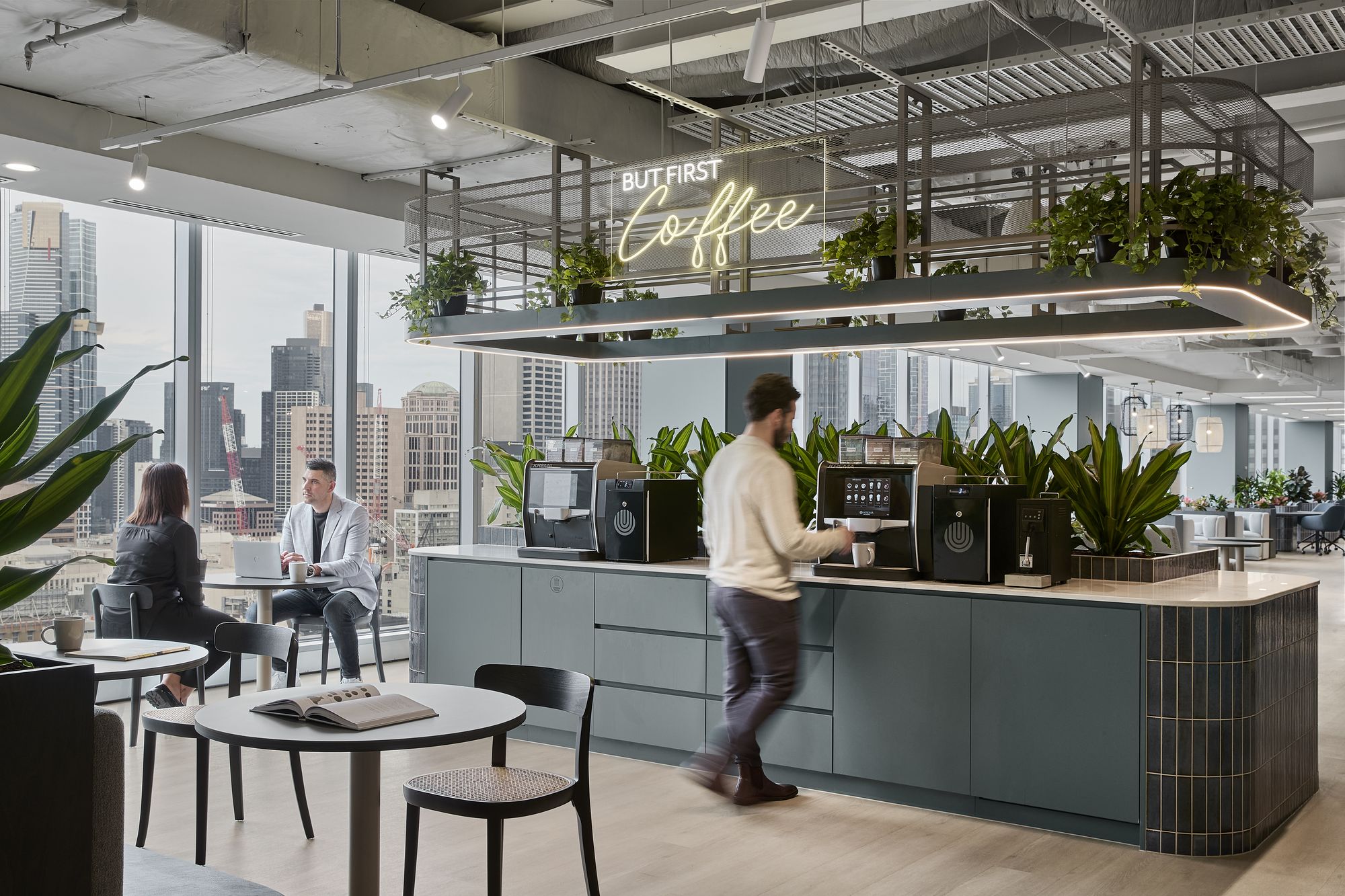 这个贯通两个楼层的核心枢纽,消融边界的同时促进员工间的自在交流。该枢纽的设计支持从团队会议到社交活动等各种需求,提供多样功能的同时毫不干扰日常运营。工作空间内设有灵活区域,既能满足专注工作,也支持非正式交流;工位的布局则充分考虑了自然采光和城市景观的最大化。协作区、专注区与静思区等多元空间各司其职,辅以卓越的声学设计、充沛自然采光及直观动线指引。休闲区的核心是一个以墨尔本咖啡文化为灵感的咖啡吧,促进交流与协作。